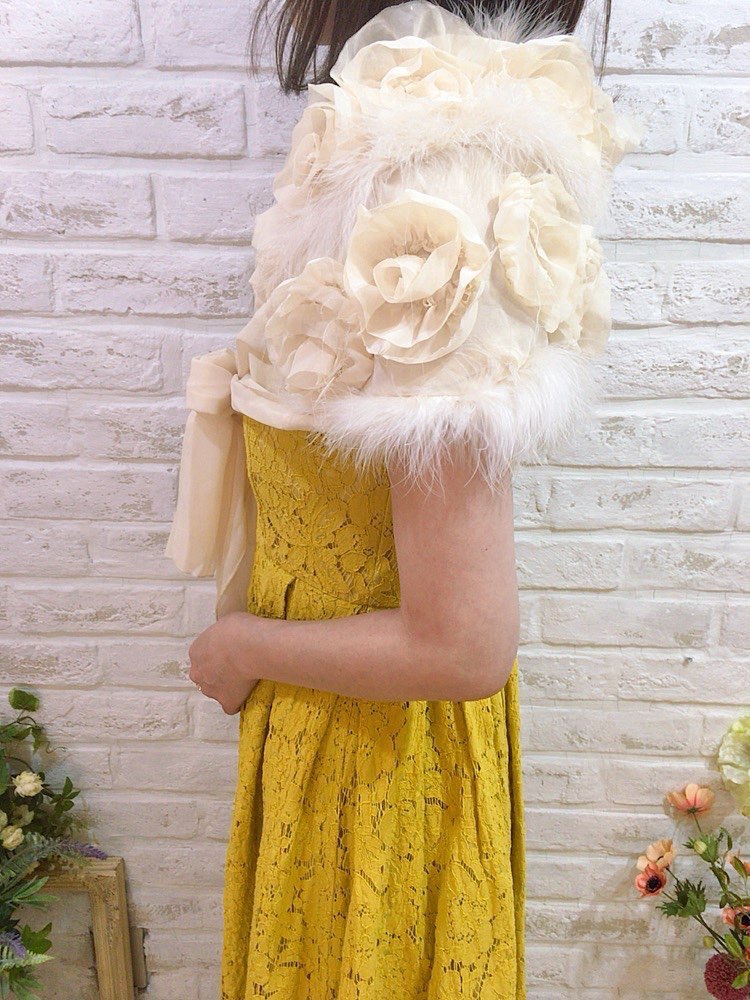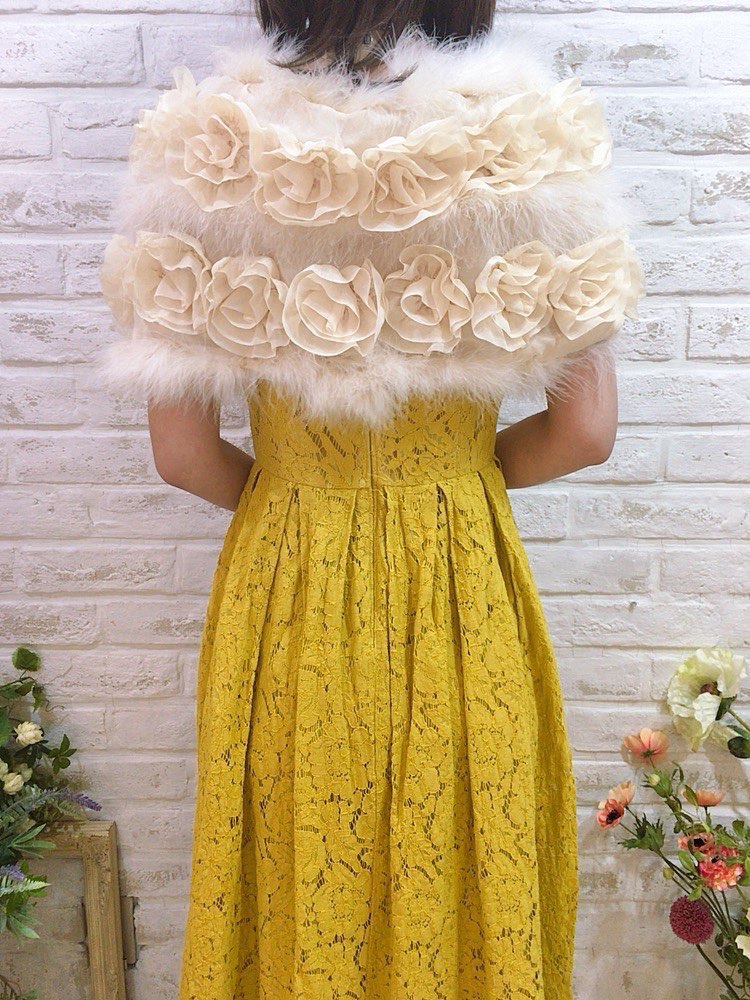 気品ある雰囲気にドレスアップを叶えるホワイトファーストール。大きな薔薇と水鳥ファーがついているので華やかな印象になります。