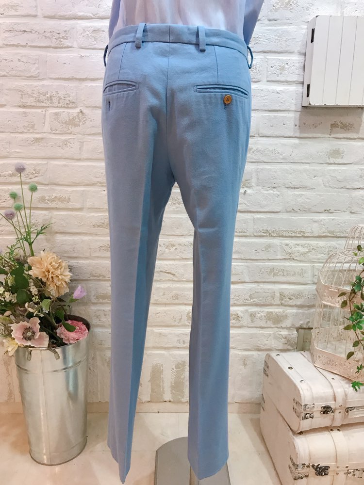 爽やかなライトブルーのカジュアルパンツ。トップスには、チェック柄のシャツや、ベストなど合わせるとより一層おしゃれなカジュアルタキシードコーディネートになります。二次会や1.5次会、ビーチウェディング、レストランウェディング、ガーデンウェディング、様々なシーンでご利用頂けます。また、カジュアルスタイルの前撮り写真撮影にもおすすめ致します。柔らかな素材感なので長時間着ていても負担は少ないと思います。
