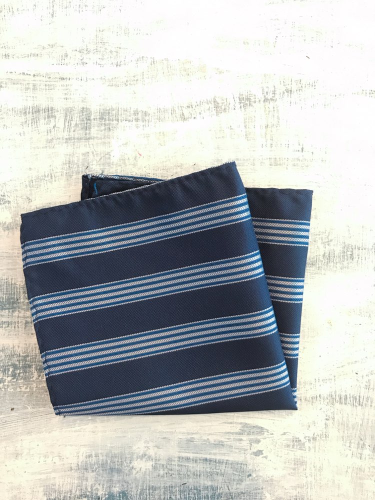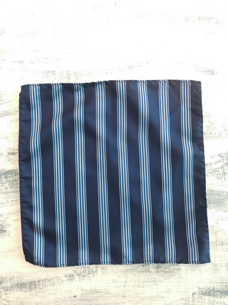 ネイビー×ライトブルーストライプの大人上品なポケットチーフです。派手すぎない落ち着いた色味ですが、ブルーのストライプが入ることにより、きちんと感がありながらもどこか遊び心を感じさせてくれます。セットの蝶ネクタイと合わせることによりスーツ全体のバランスに統一感を与え、おしゃれ度もグンとアップ。結婚式や2次会、パーティーなど、様々なシーンでお使え頂けます。