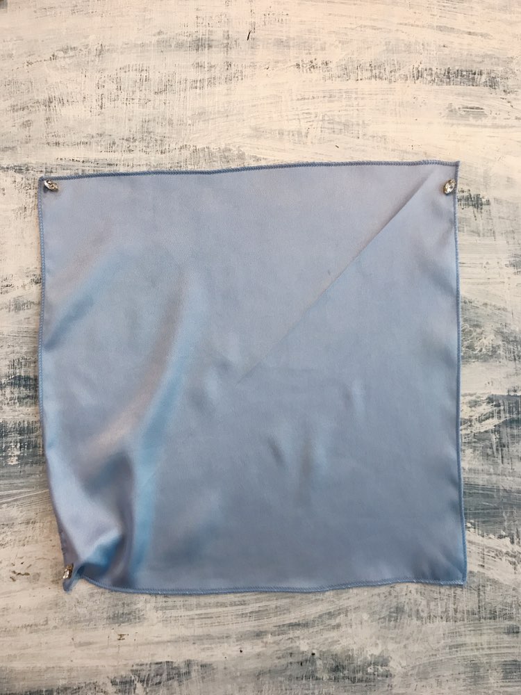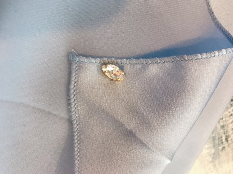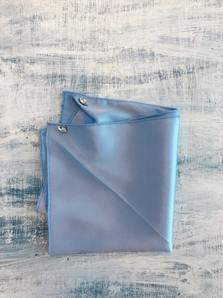 あるようでなかった、さりげない輝きがポイントのビジュー付きポケットチーフ。ビジューといっても程よいサイズ感なので、派手なものが苦手な男性でも抵抗感なくお使い頂けます。ほんのりラベンダーがかった水色とツヤのあるなめらかな生地感が、上品で華やかな雰囲気のスタイルを完成させてくれます。また、三方の角にビジューがあしらわれているので、それを活かした「スリーピークス」がおすすめの折り方です。華やかなシーンにどうぞ。