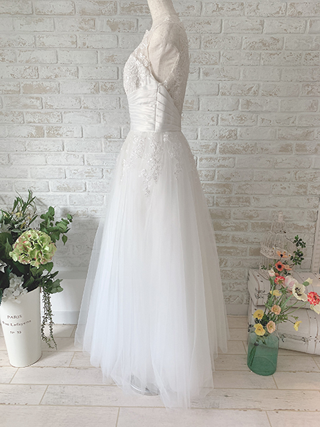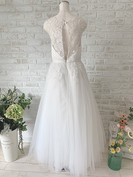 デコルテ部分のシースルーデザインと刺繡のデザインがすごく可愛いウエディングドレスです。シースルーのデザインがとても上品で、女性の良さを引き立たせてくれます。チュールはボリュームがあるのでそれもまたキュートな印象があり、オススメです。背中はチラッと見えるデザインになっておりそこも可愛く大人っぽい印象があります。