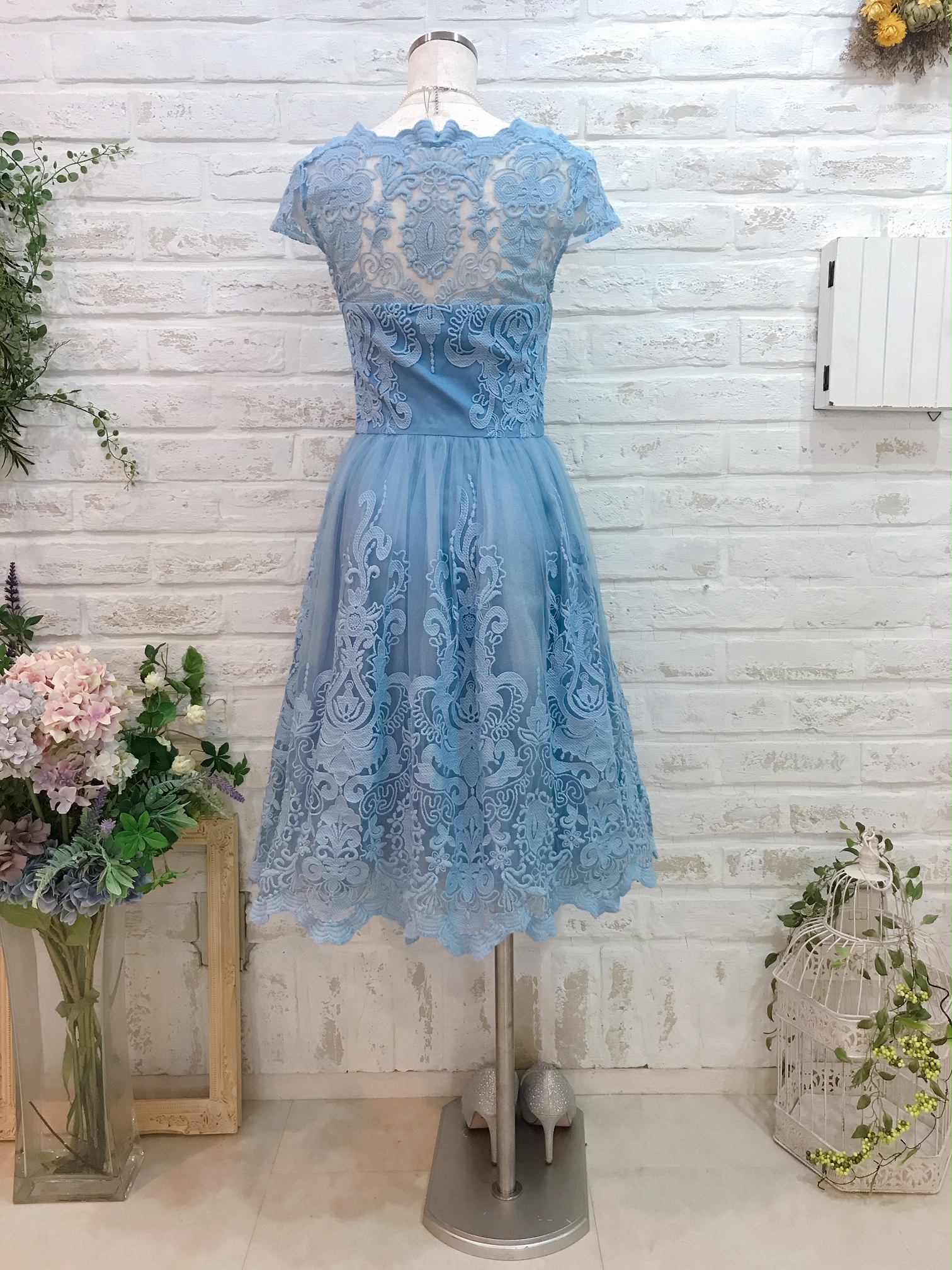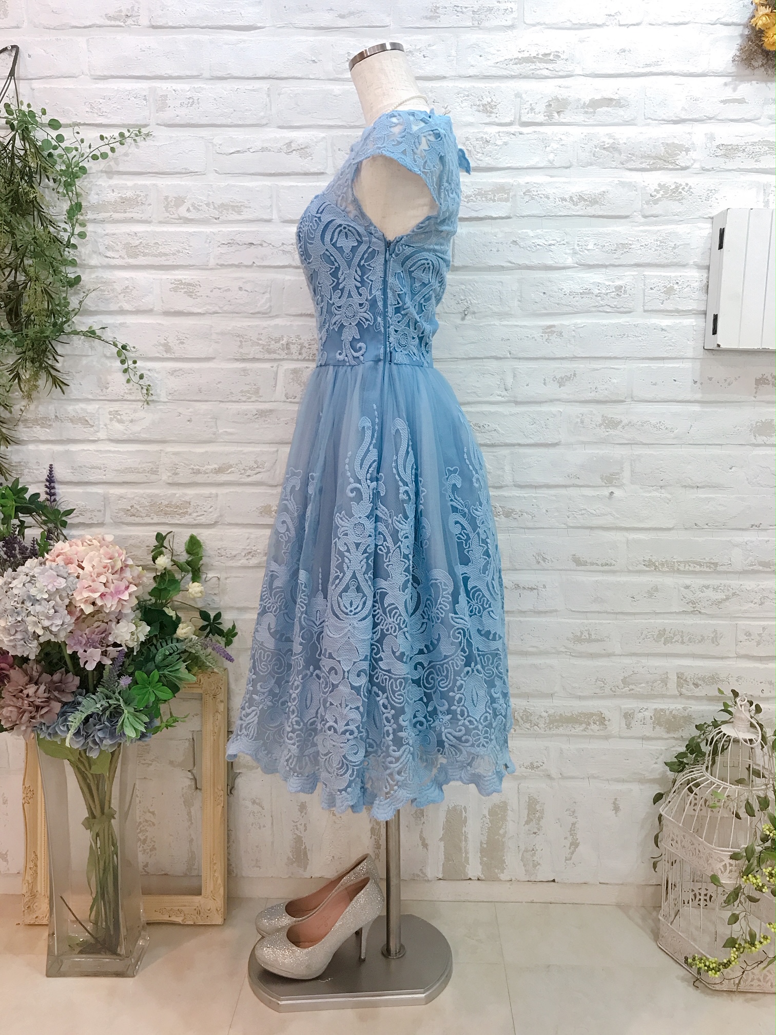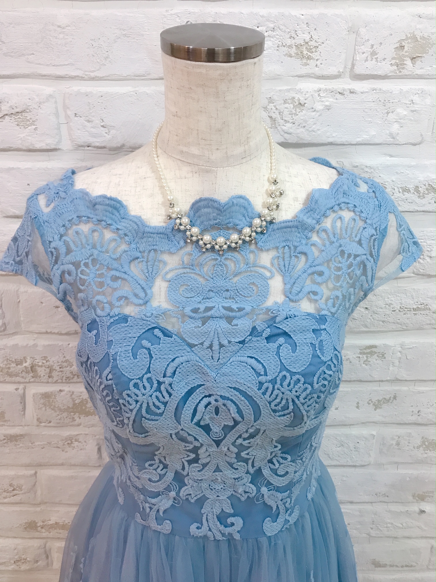 水色肩ありドレス。レース刺繍が可愛いです。スカート部分のボリュームがほどよく丈長めです。