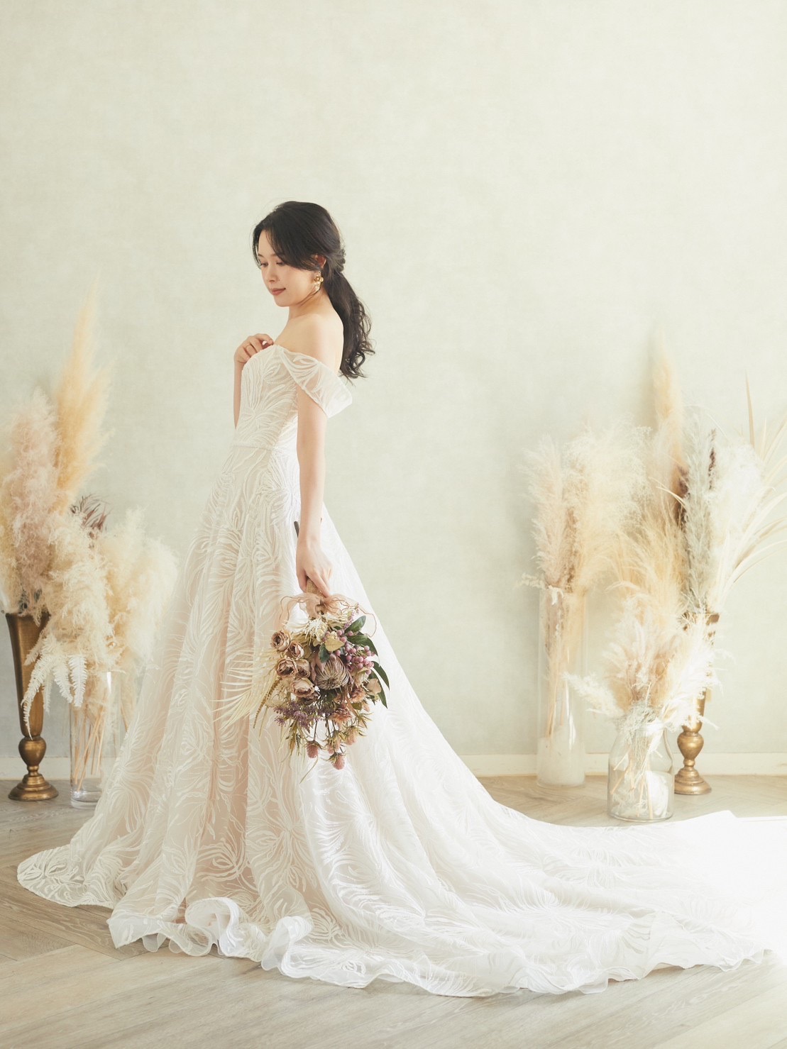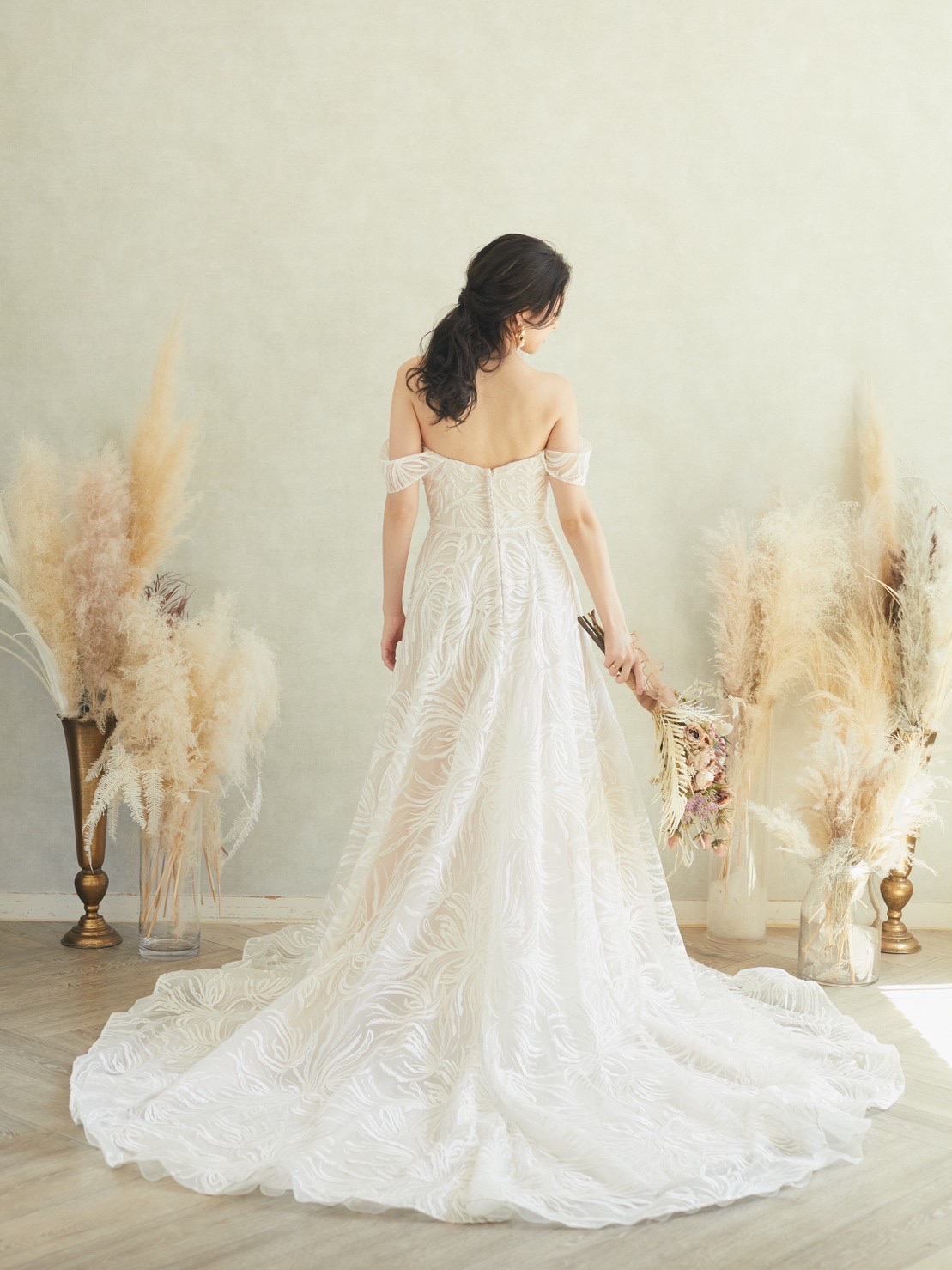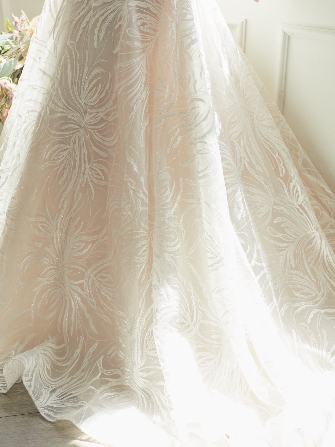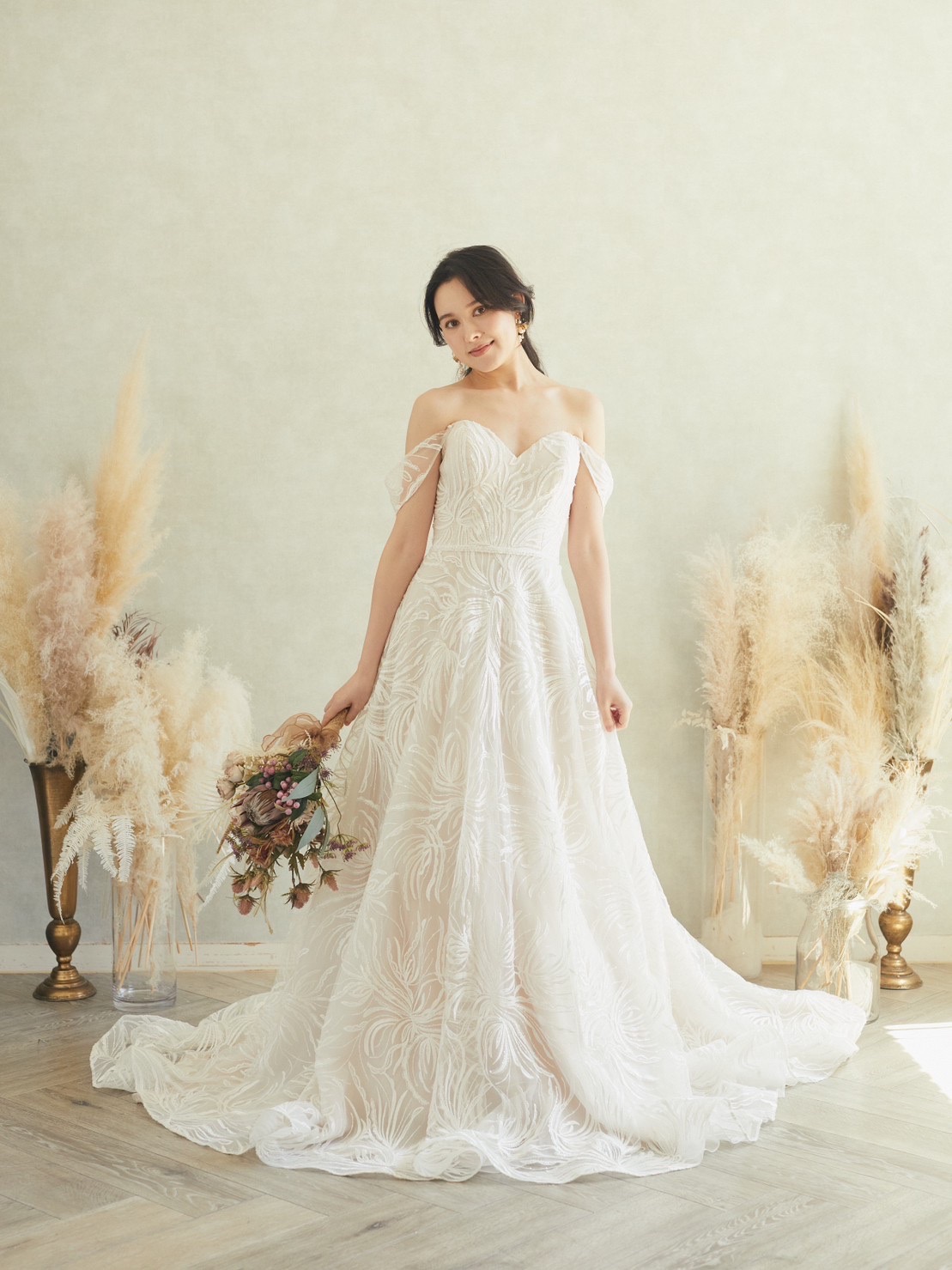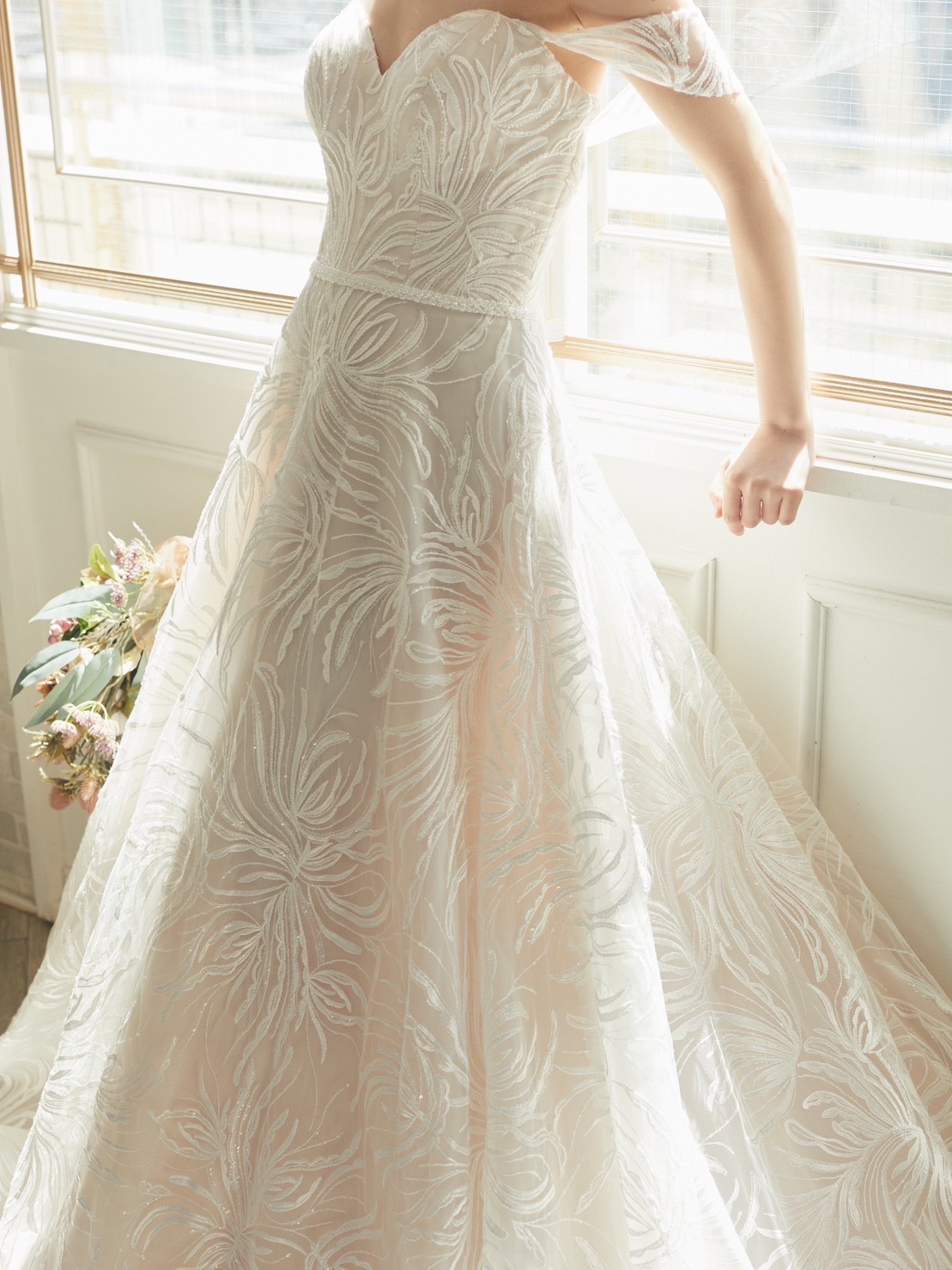 インポートドレス。肌馴染みの良いピンクベージュカラー。披露宴のお色直しやフォトウェディングに最適です。 キラキララメグリッター大柄Aラインオフショルダードレス。ラザロのグリッタードレスがお好きな方にもオススメのゴージャスで写真映えのするドレスです。