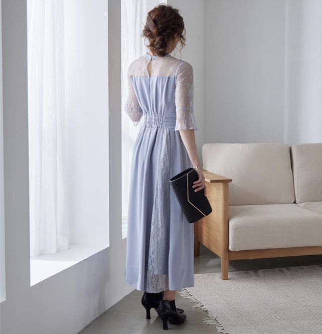 アイスブルー×バスト切替フレア七分丈ドレス L