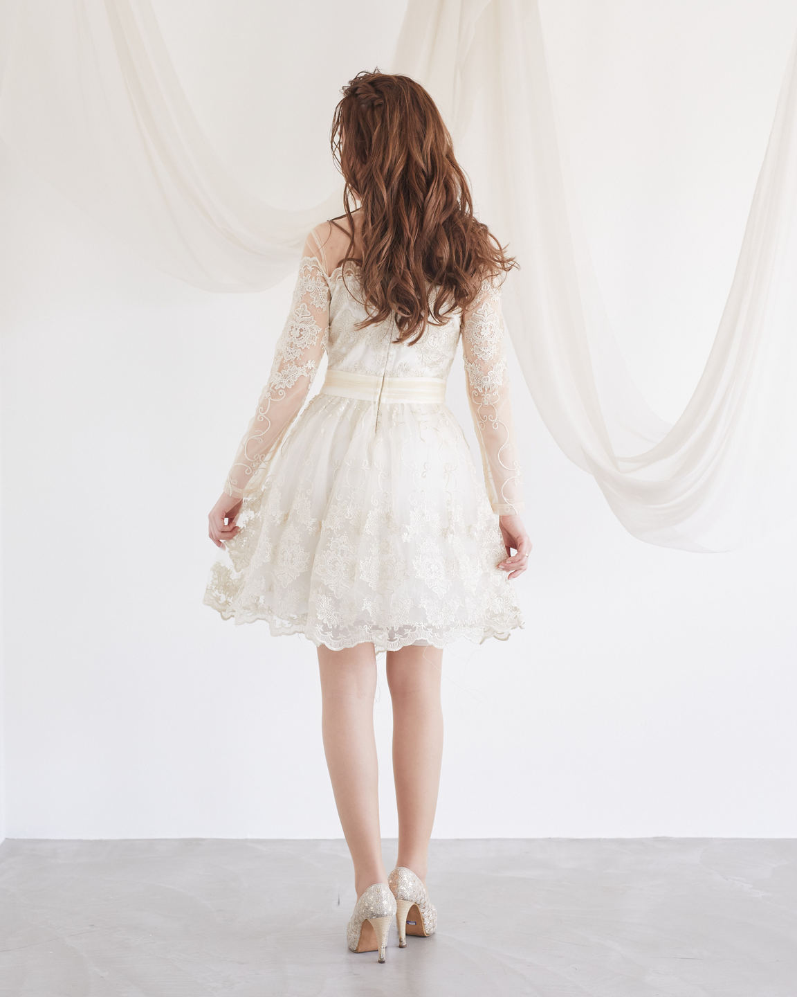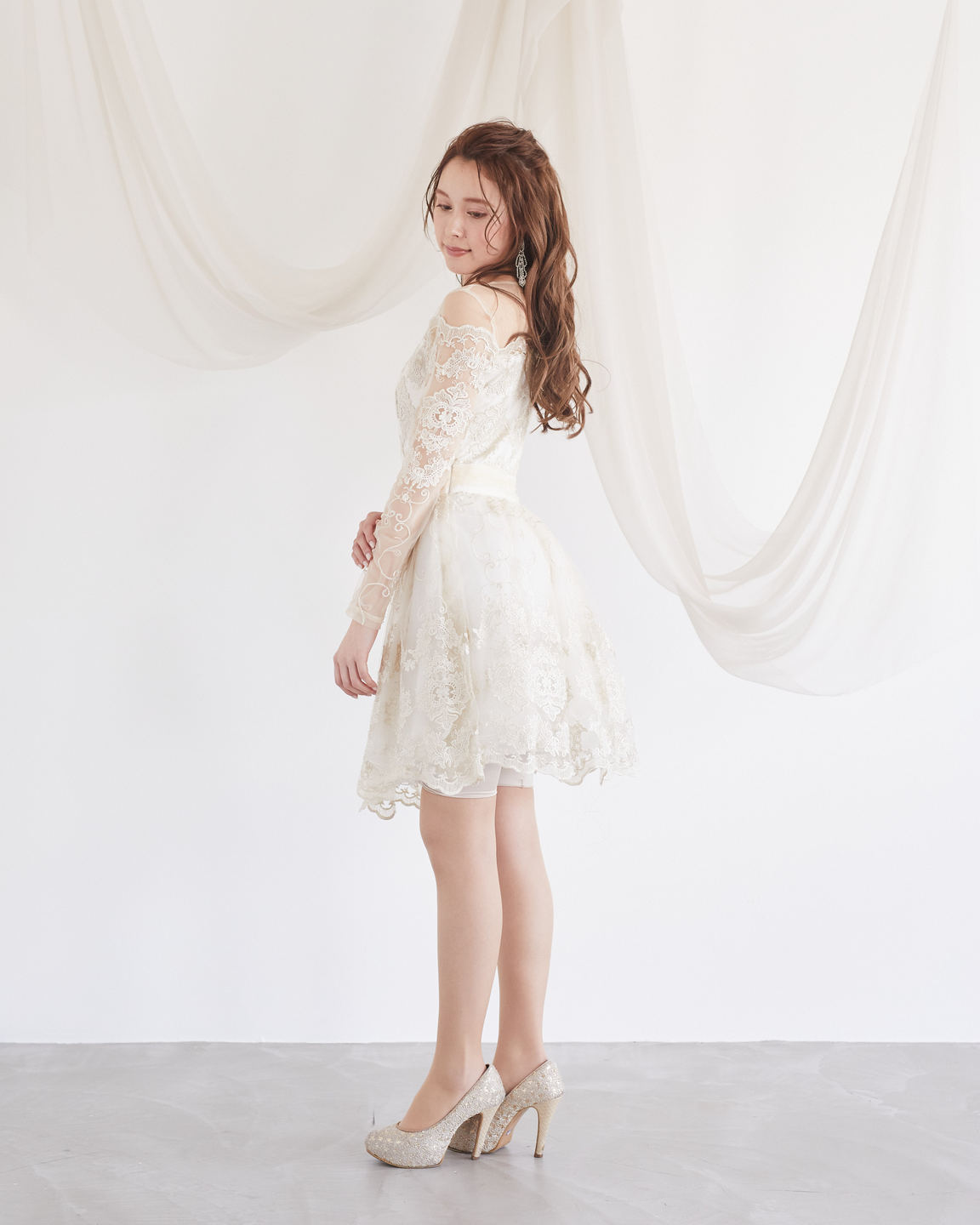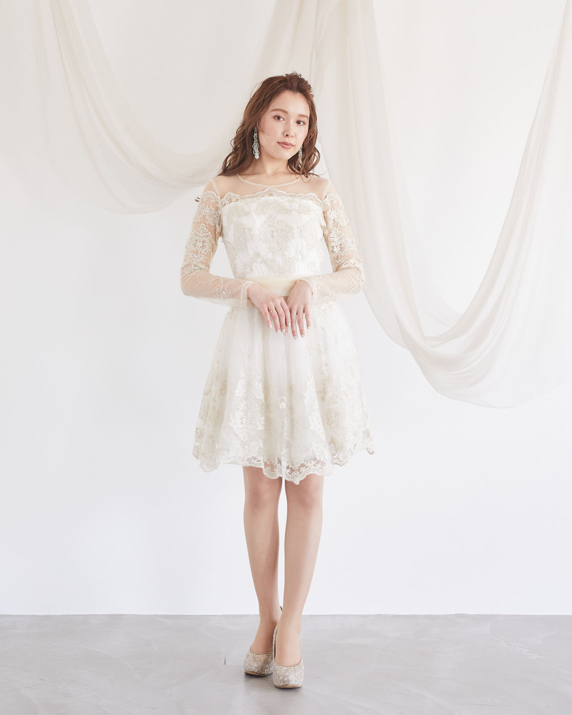 アイボリーゴールド刺繍レースロングスリーブミニ丈ドレス