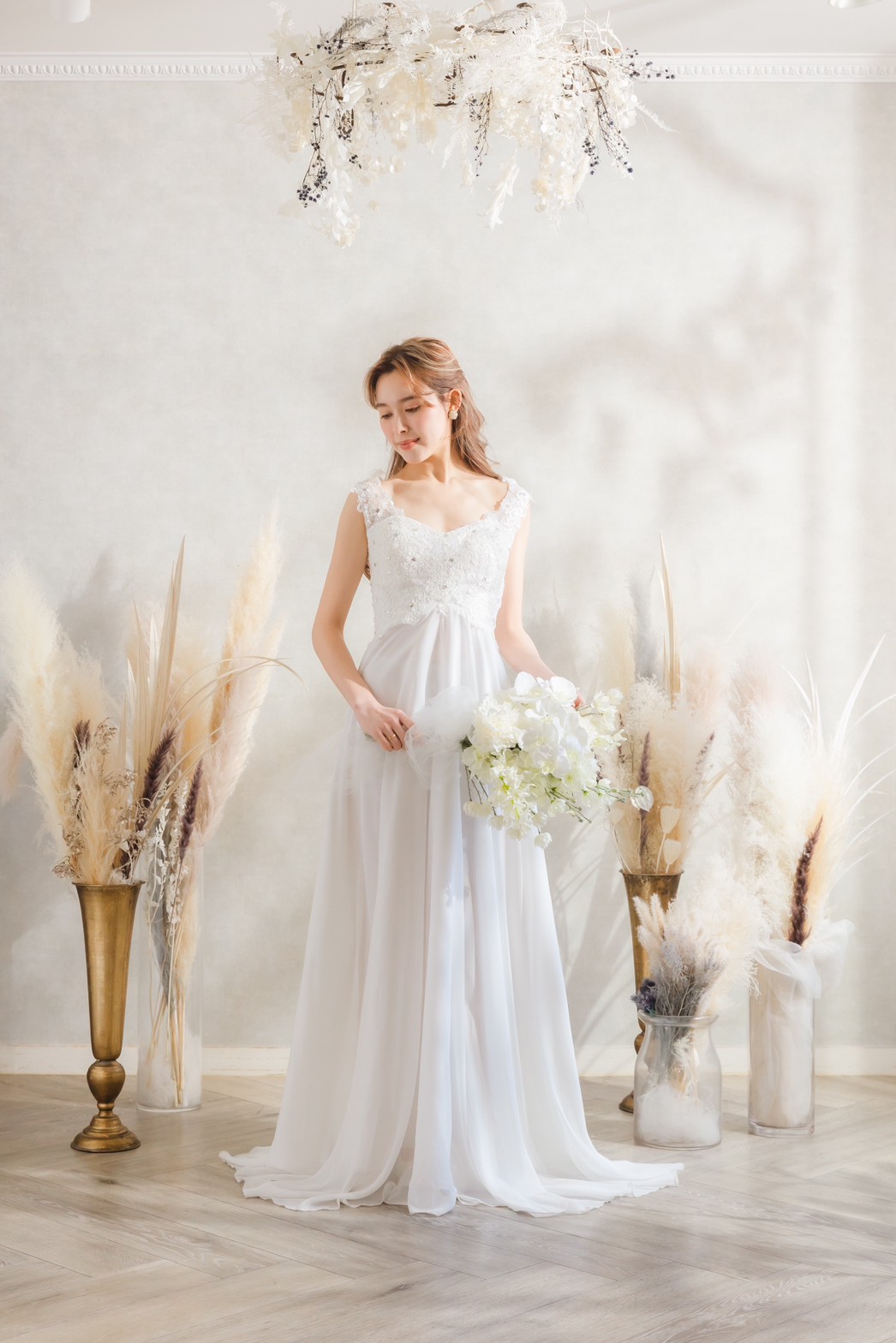 オーガンジーで柔らかな印象のドレス カジュアルな挙式から二次会、フォトなど幅広く着用できる1着です。