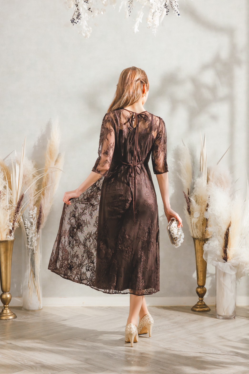 総レースダブルリボン ツーピースドレス ブラウン M