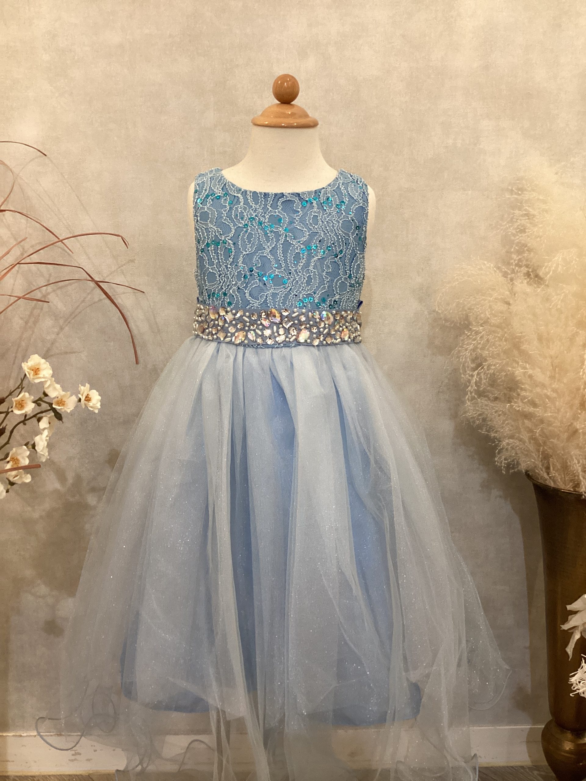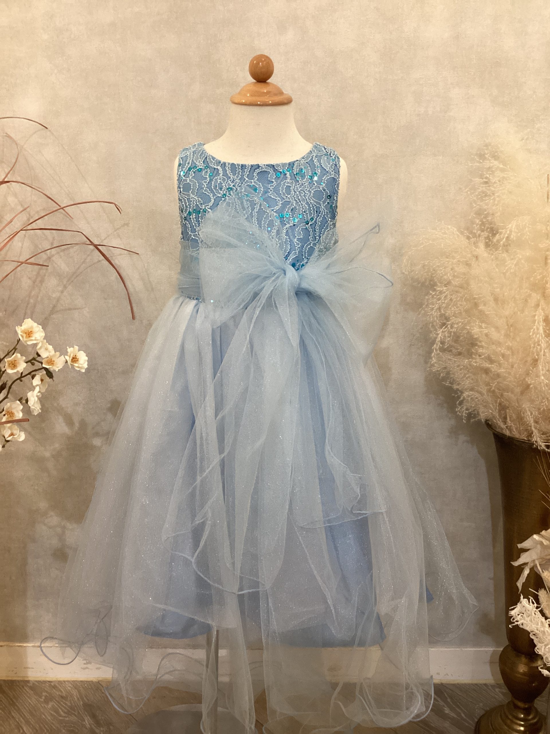 〈キッズ〉レースチュールドレス ライトブルー 100 チュールリボン、ビジューベルト付き