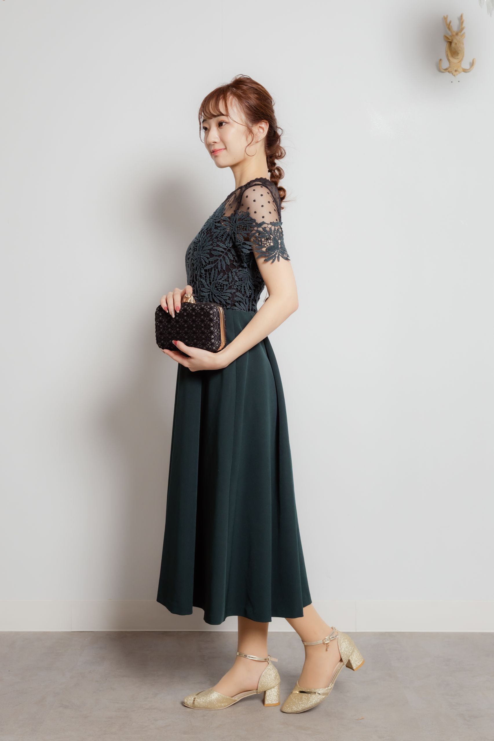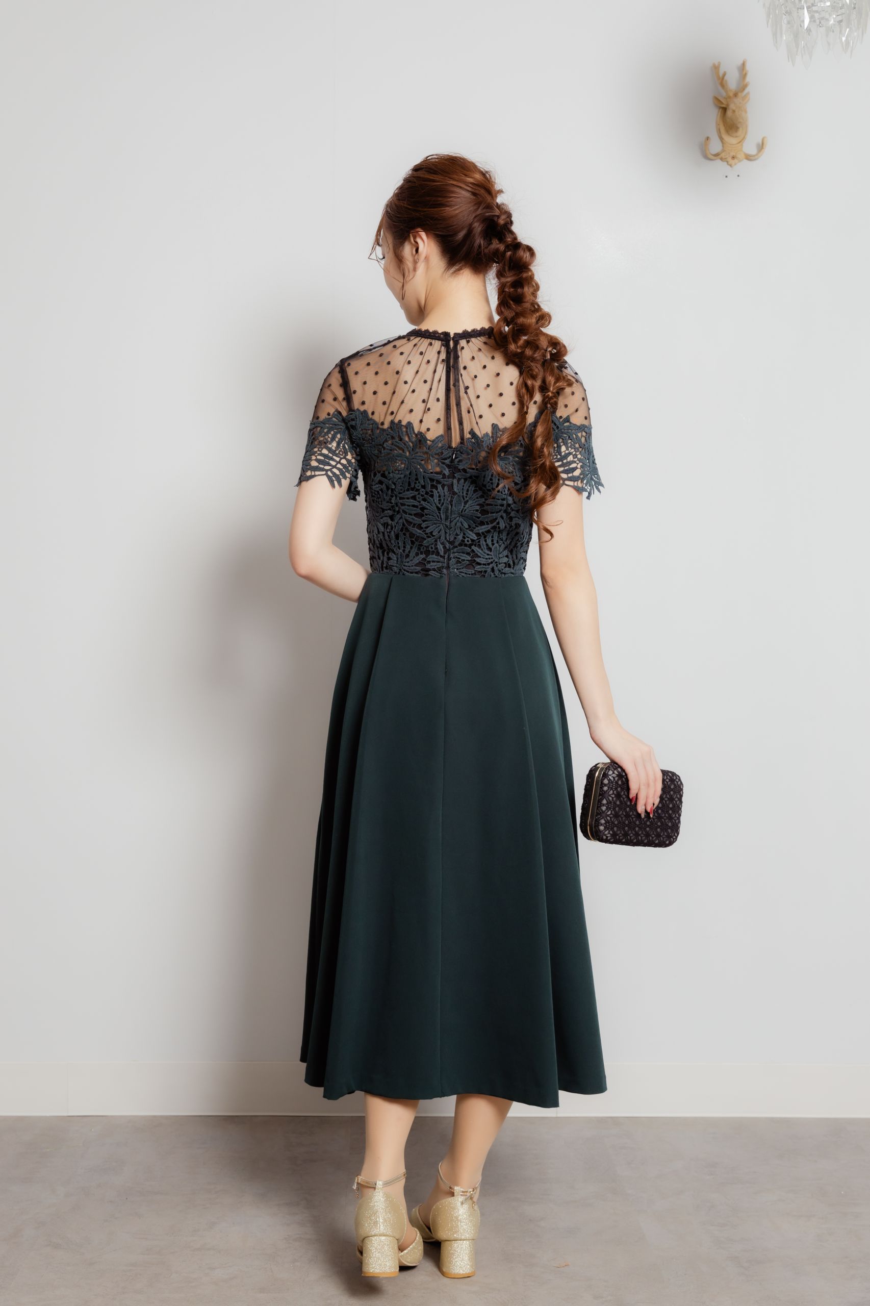 フォレストグリーン フロッキーレース×ブラックドットレースコンビドレス S