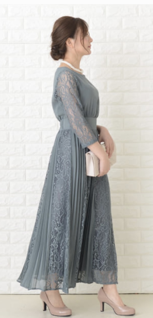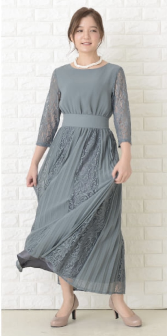 ミントグレー袖レース×プリーツスカート切替ドレスL