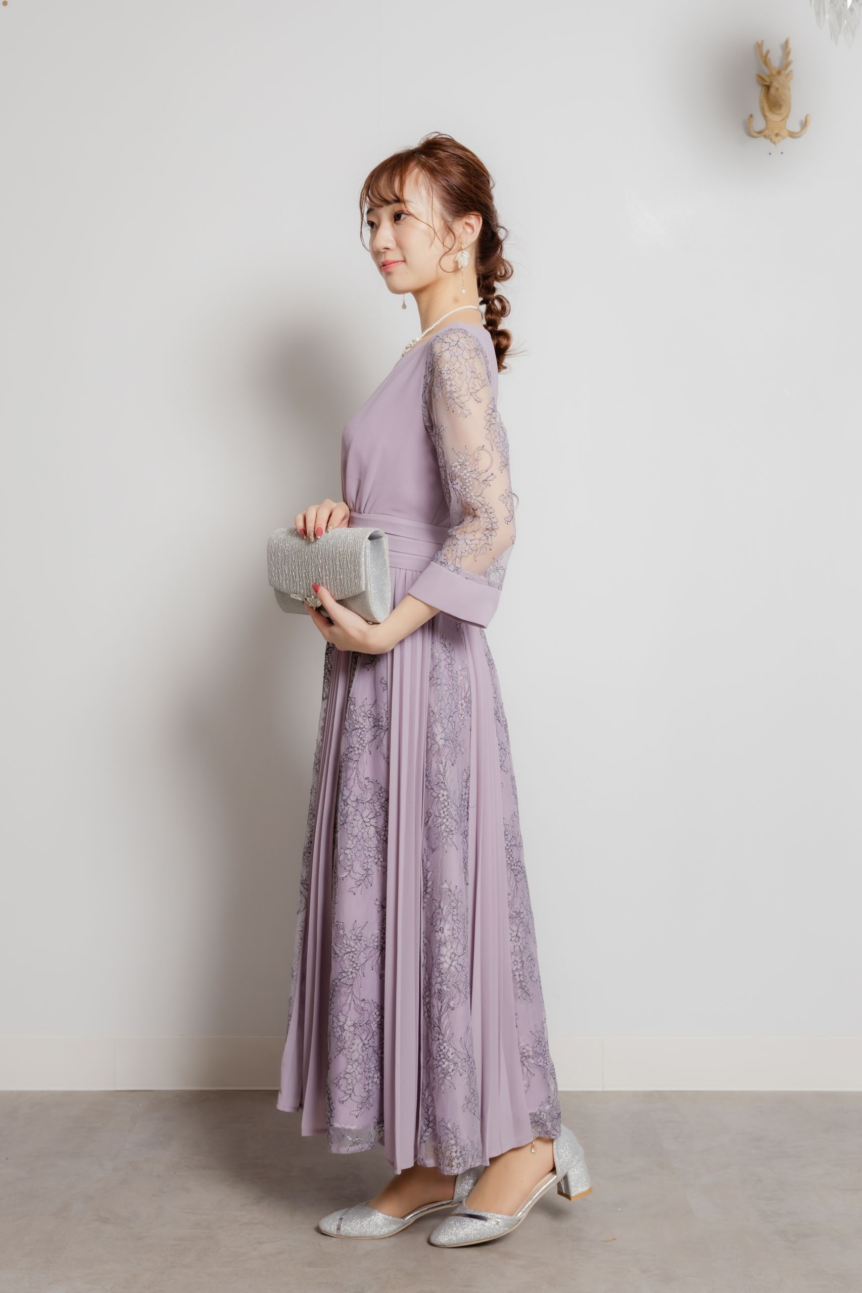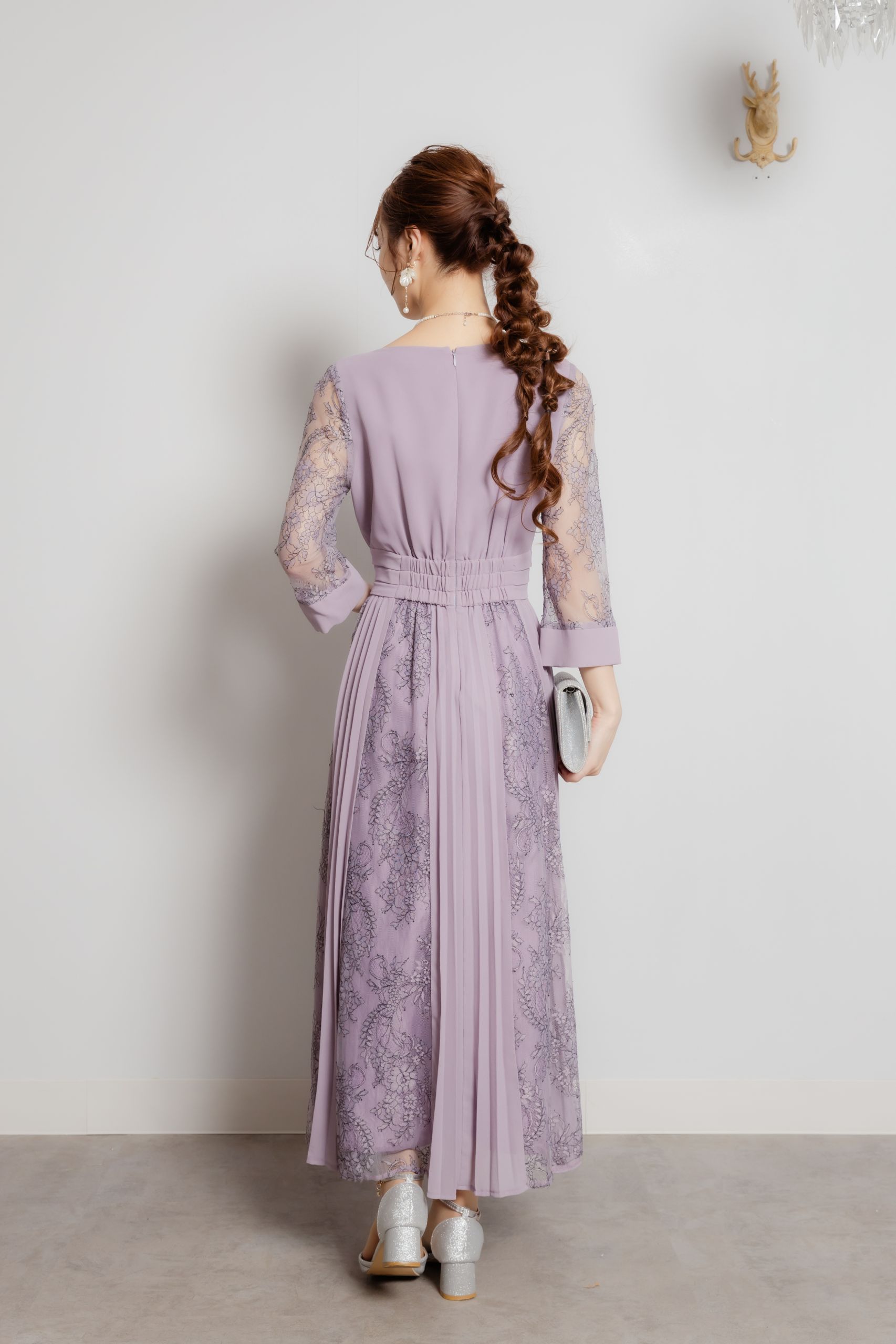 【ラベンダー】プリーツ×花柄レース7部袖ドレスL