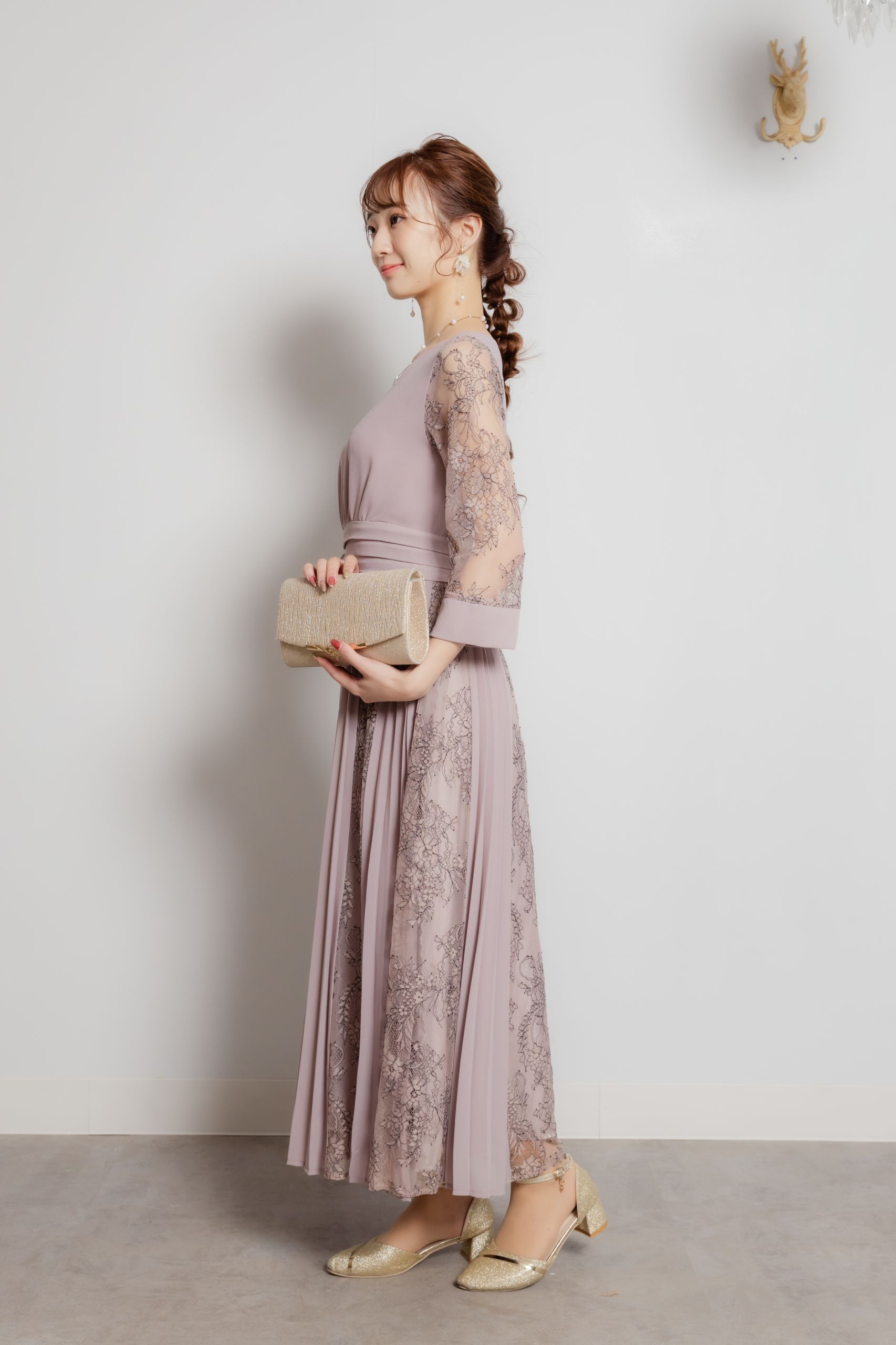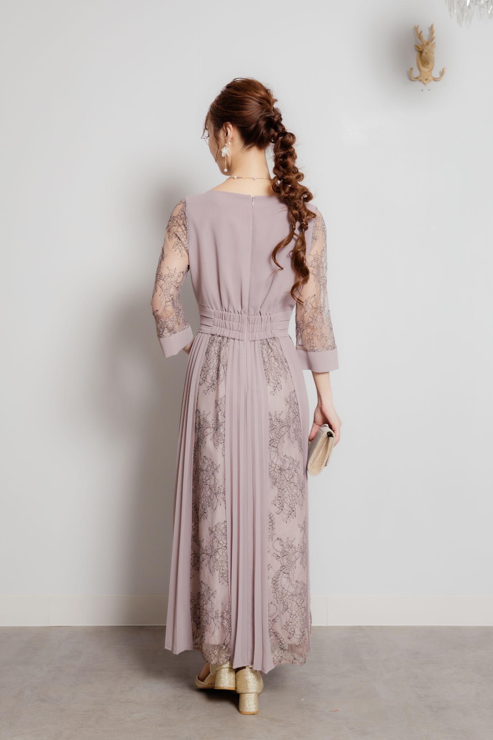 【グレージュ】プリーツ花柄レース切替7部袖ドレスL