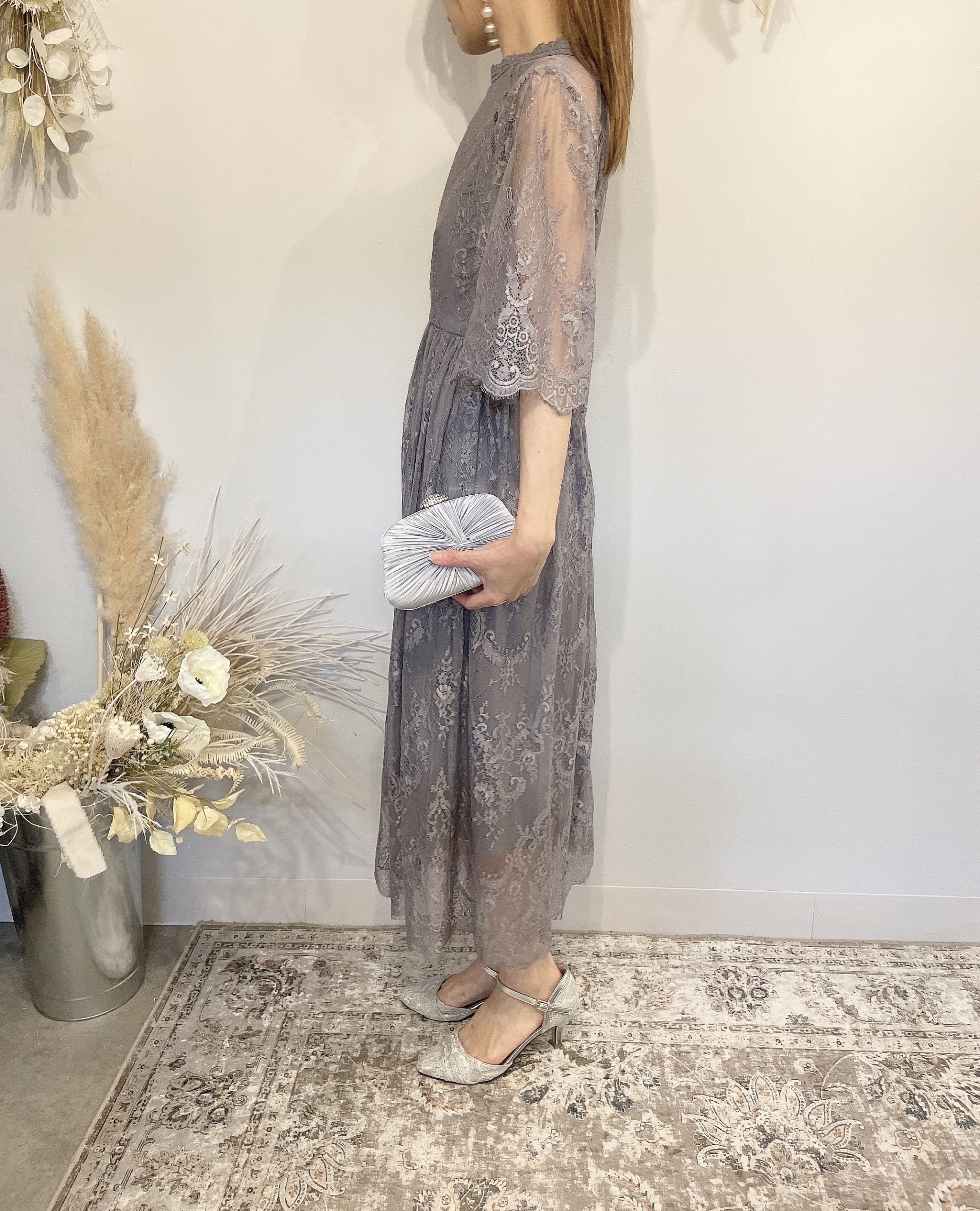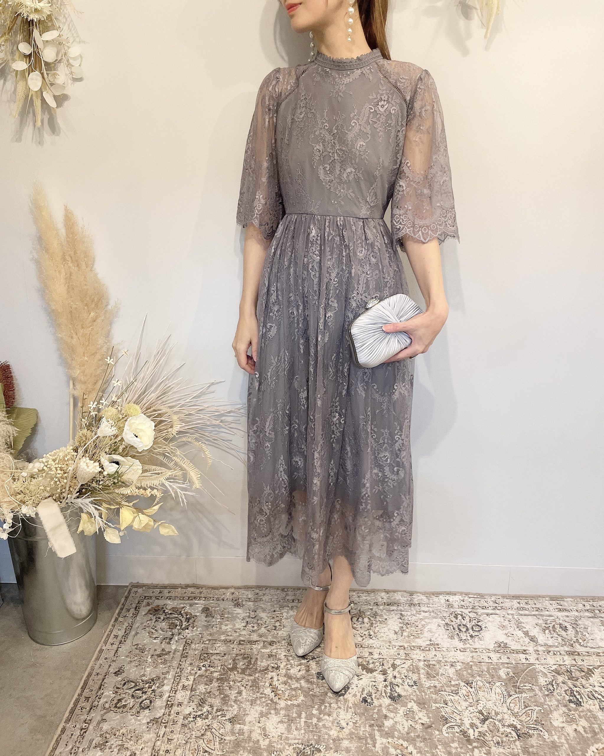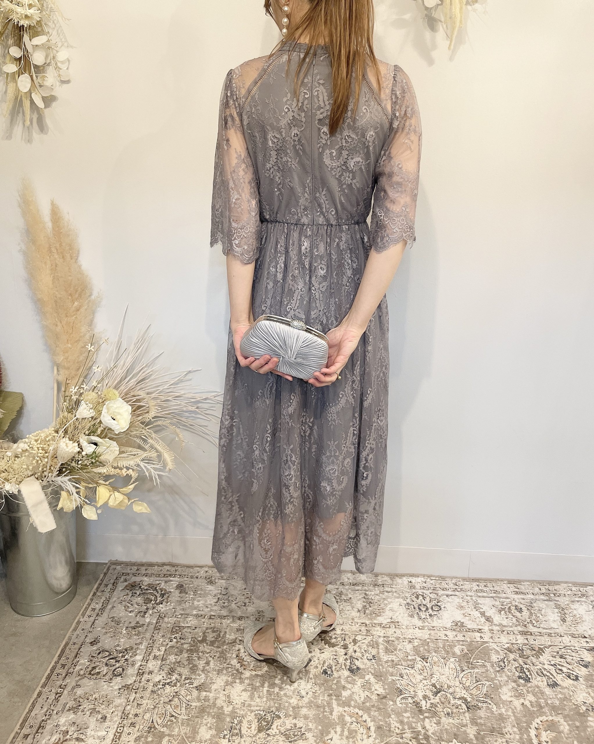 ブルーグレー 5分丈スリーブ総レースドレス L