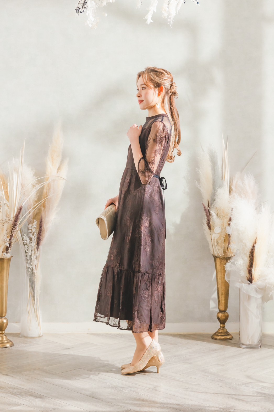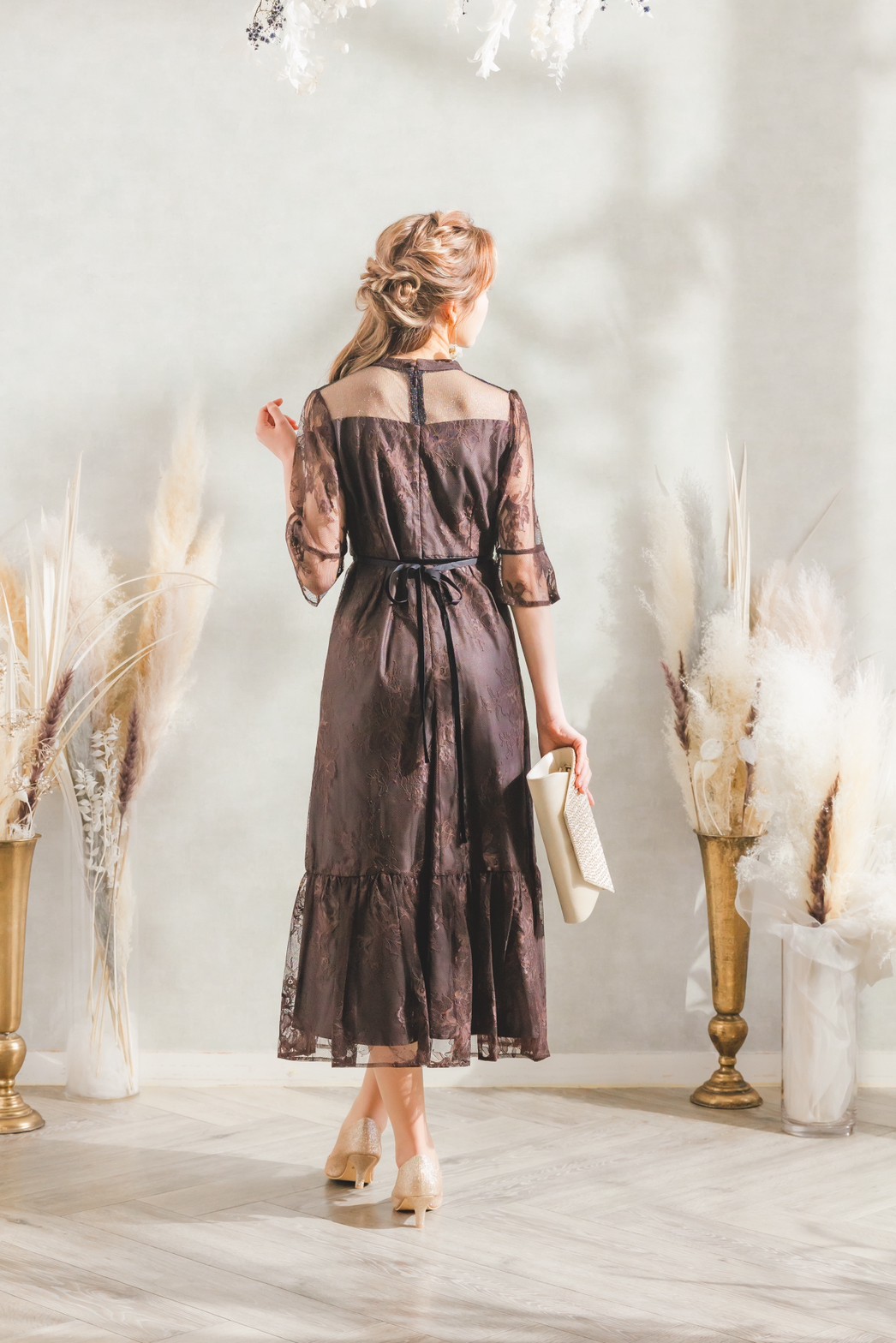 デコルテの透け感が美しいラメチュールとレースのワンピースドレス。