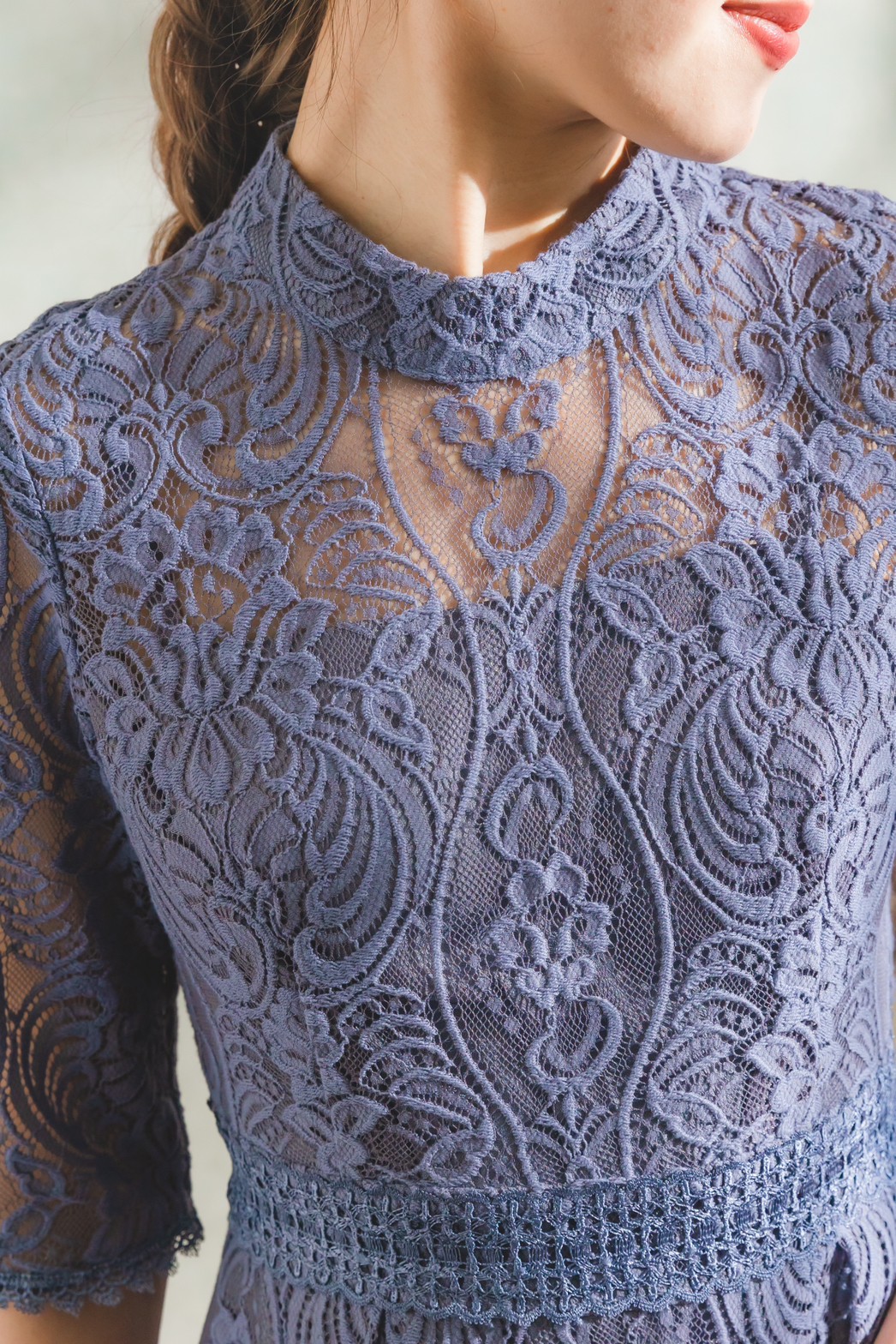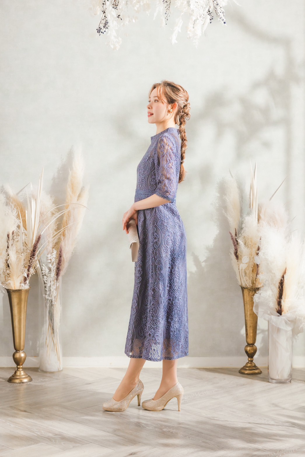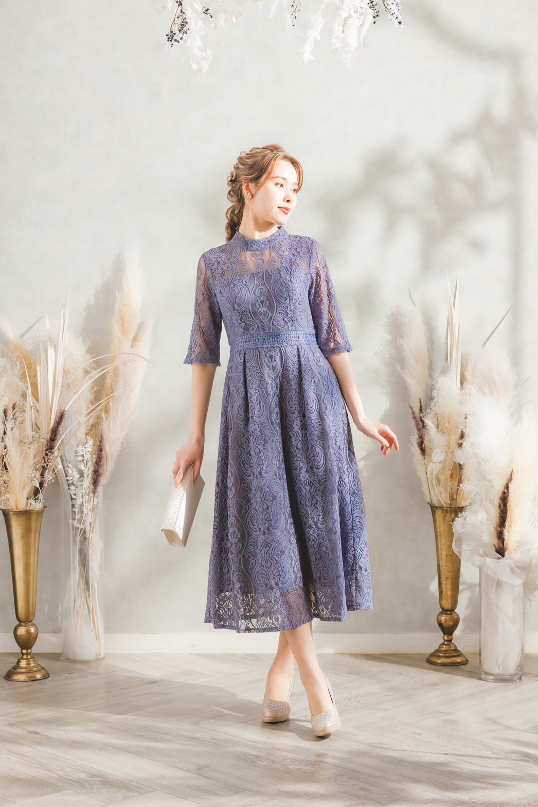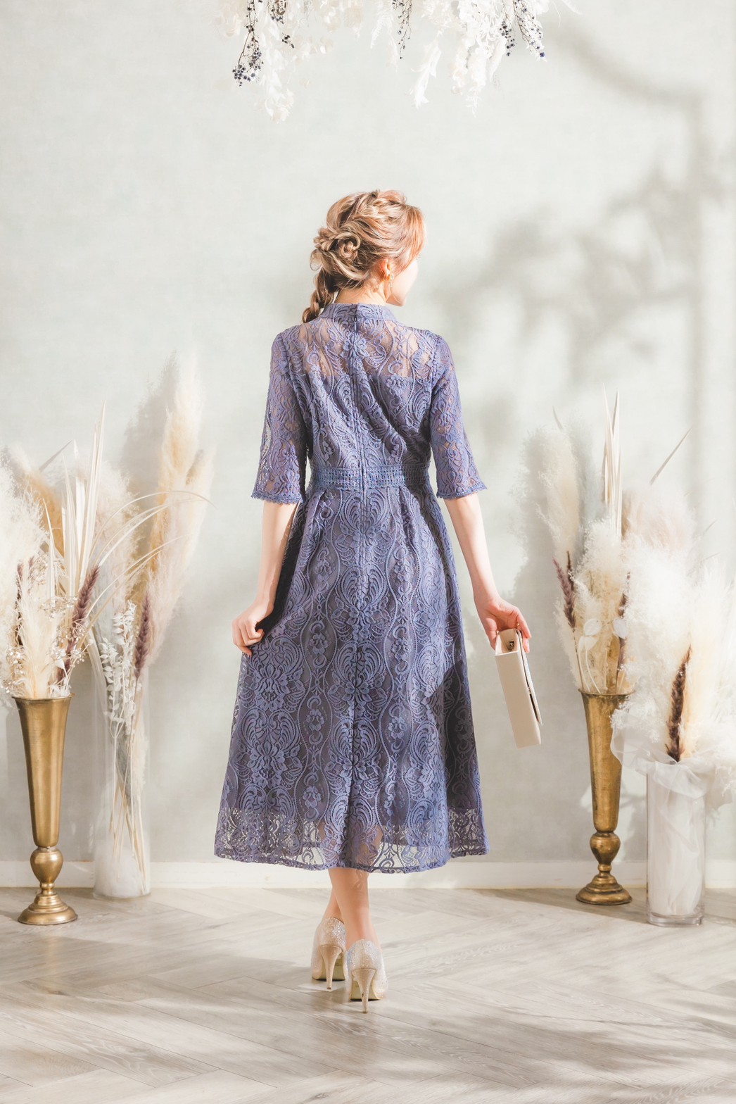 アンティーク調のリッチな印象のレース生地を使ったワンピース。 ウエストマークでスタイルアップ効果が期待できます。 袖口の繊細なレースもポイントに。 結婚式の二次会やパーティー、謝恩会、食事会などに活躍するパーティードレスです。