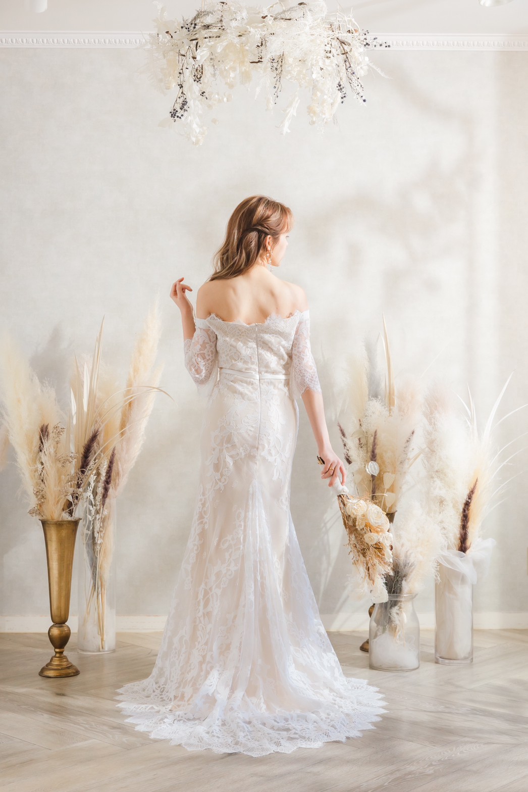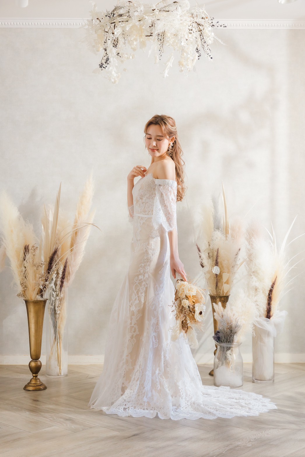 刺繍レースでデザインされた、ナチュラルで雰囲気あるオフショルダーソフトマーメイドドレスです。 ヴィンテージドレスのような雰囲気と、レースの袖のデザインが組み合わさり、おしゃれなウエディングシーンを演出してくれます。 二次会、ウェディングパーティー、ロケーション撮影、あらゆるシーンで大活躍。立ち姿も座り姿も美しく魅せ、着映えするデザインなので、どの会場でも華やかに存在感をアピールできます。