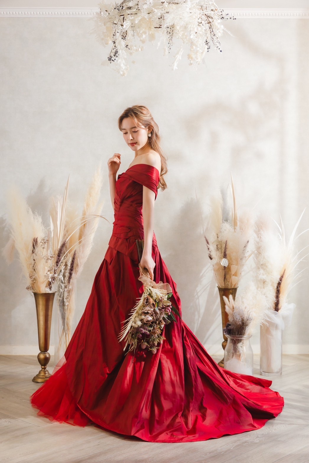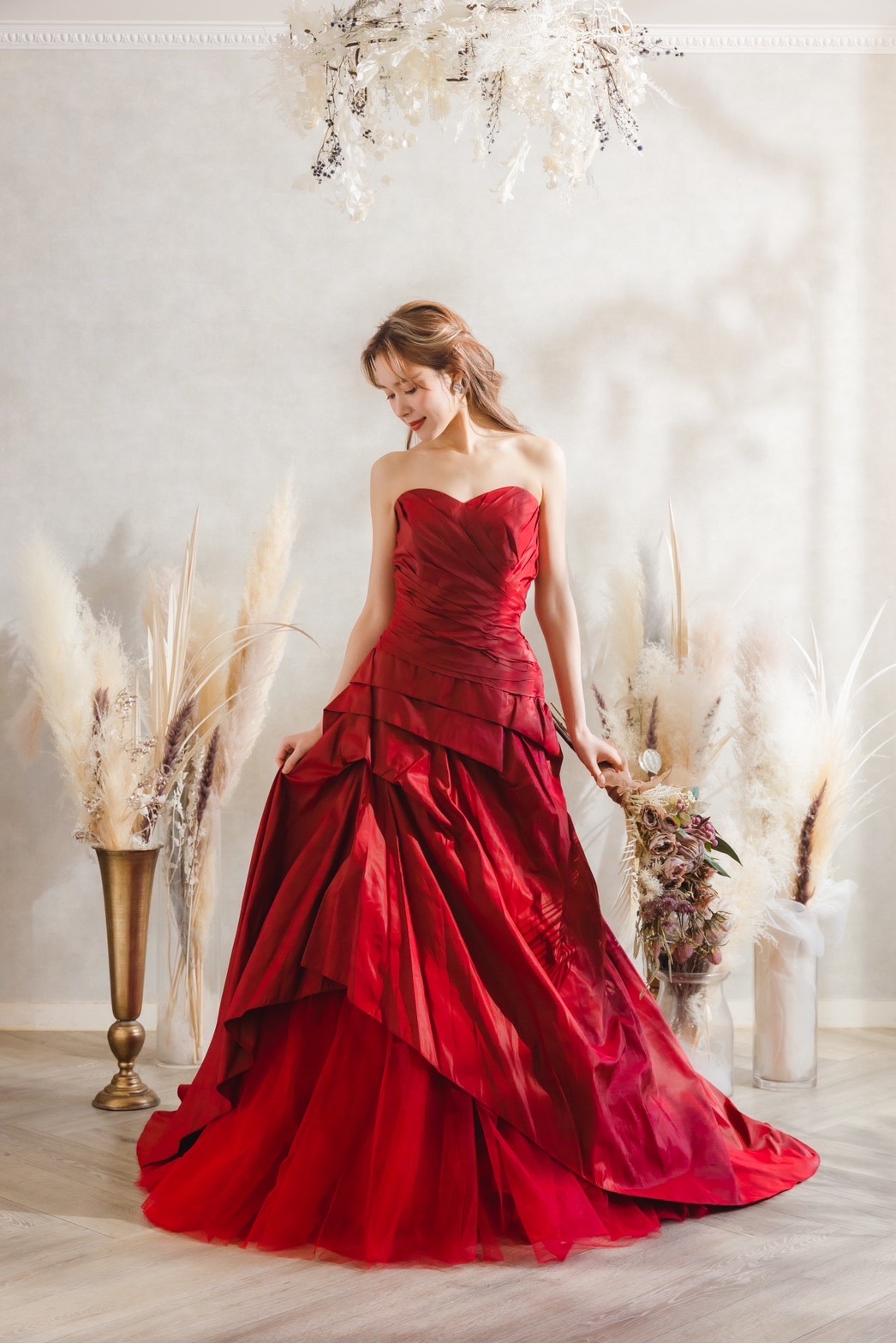 艶やかなレッドのサテンドレスは、単色ならではの大人っぽさと気品を感じさせます。 二の腕の細見え効果のあるオフショルダーは取り外しが可能。 デコルテ周りをスッキリと見せるベアドレスとしても美しく演出。 2wayアレンジが可能なので、披露宴、お見送りなどシーン別に着こなせます。
