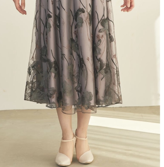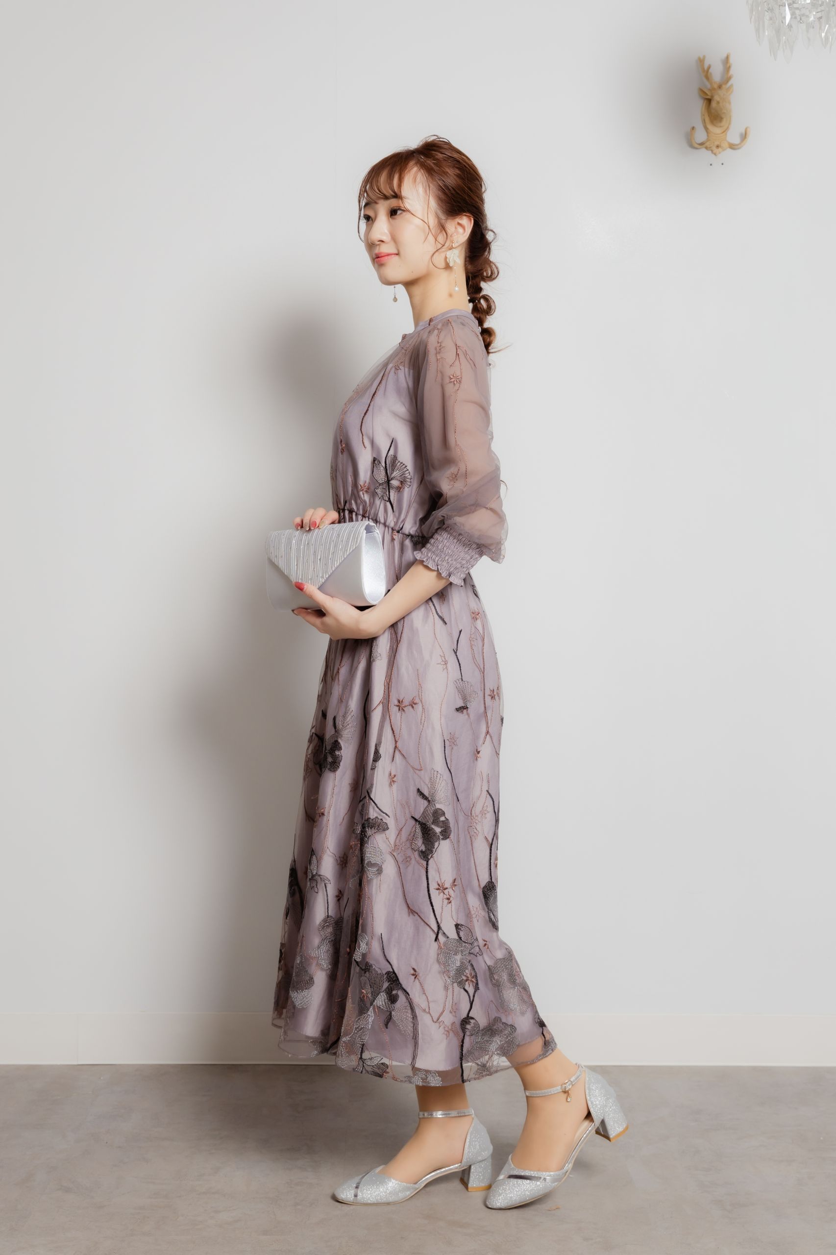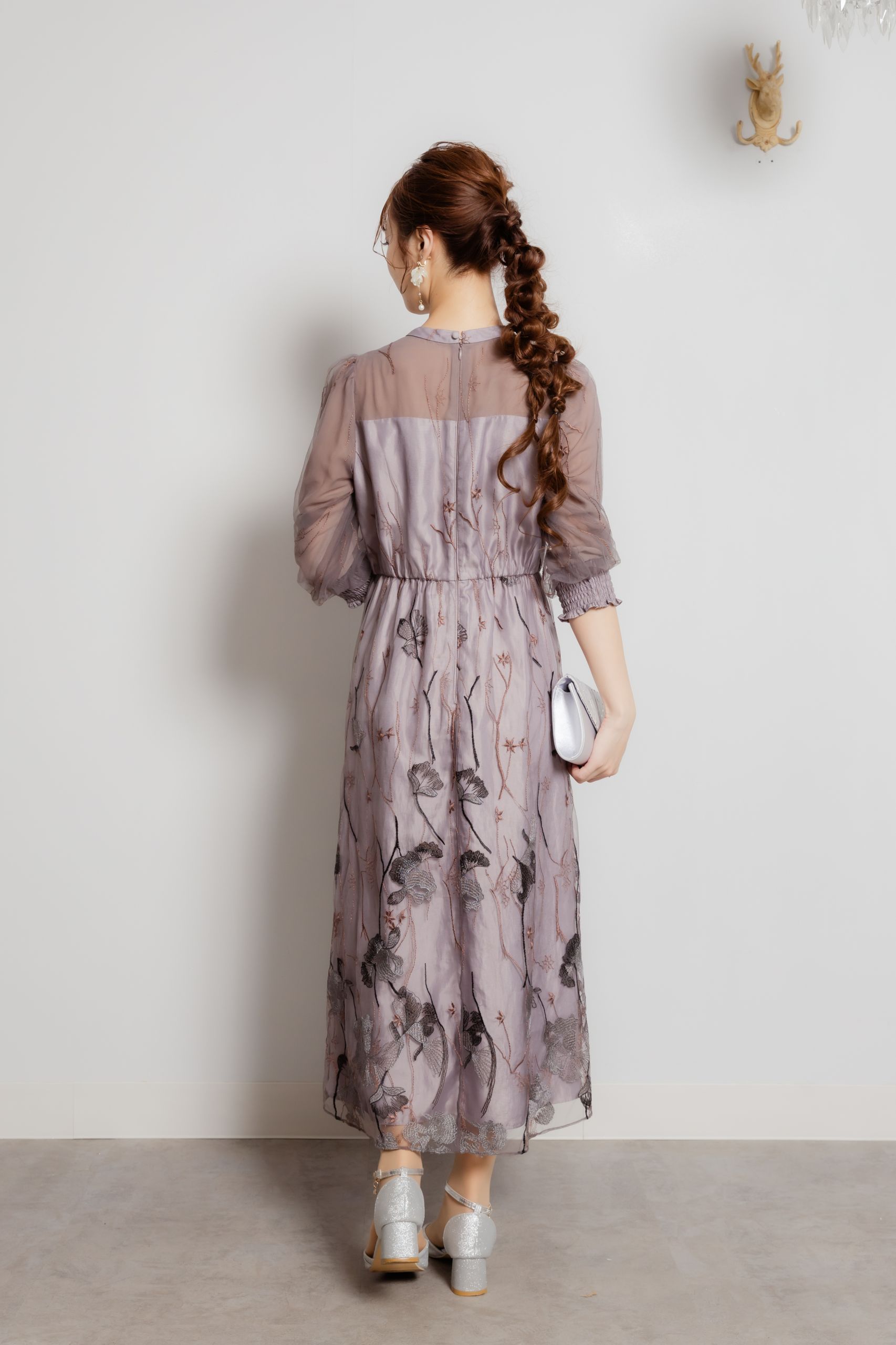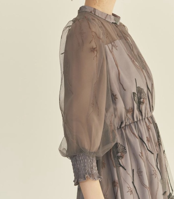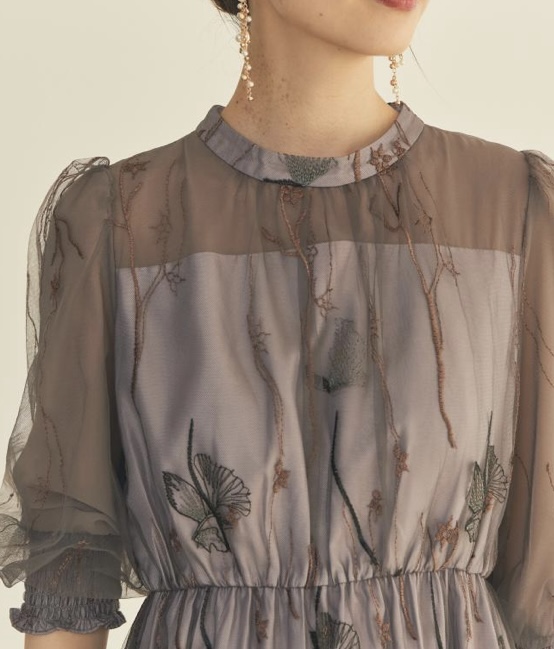 グレイッシュパープル エンブロイダリーフラワーレースドレス M