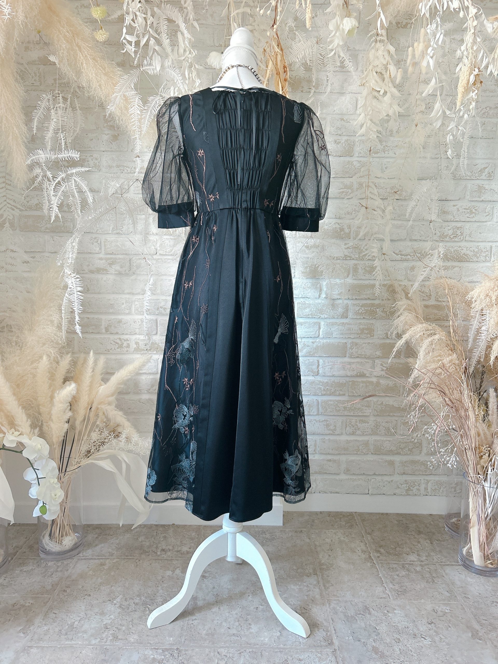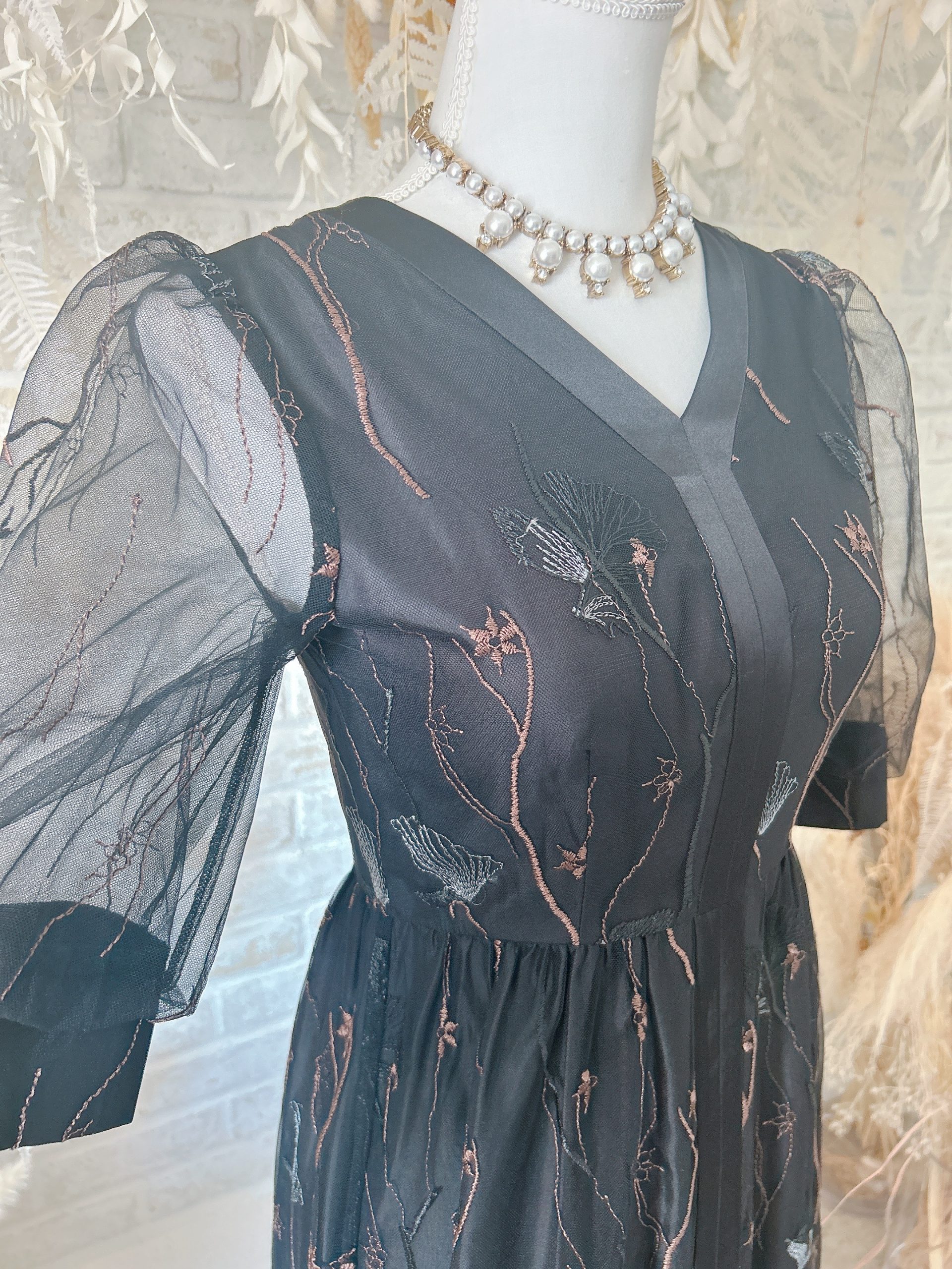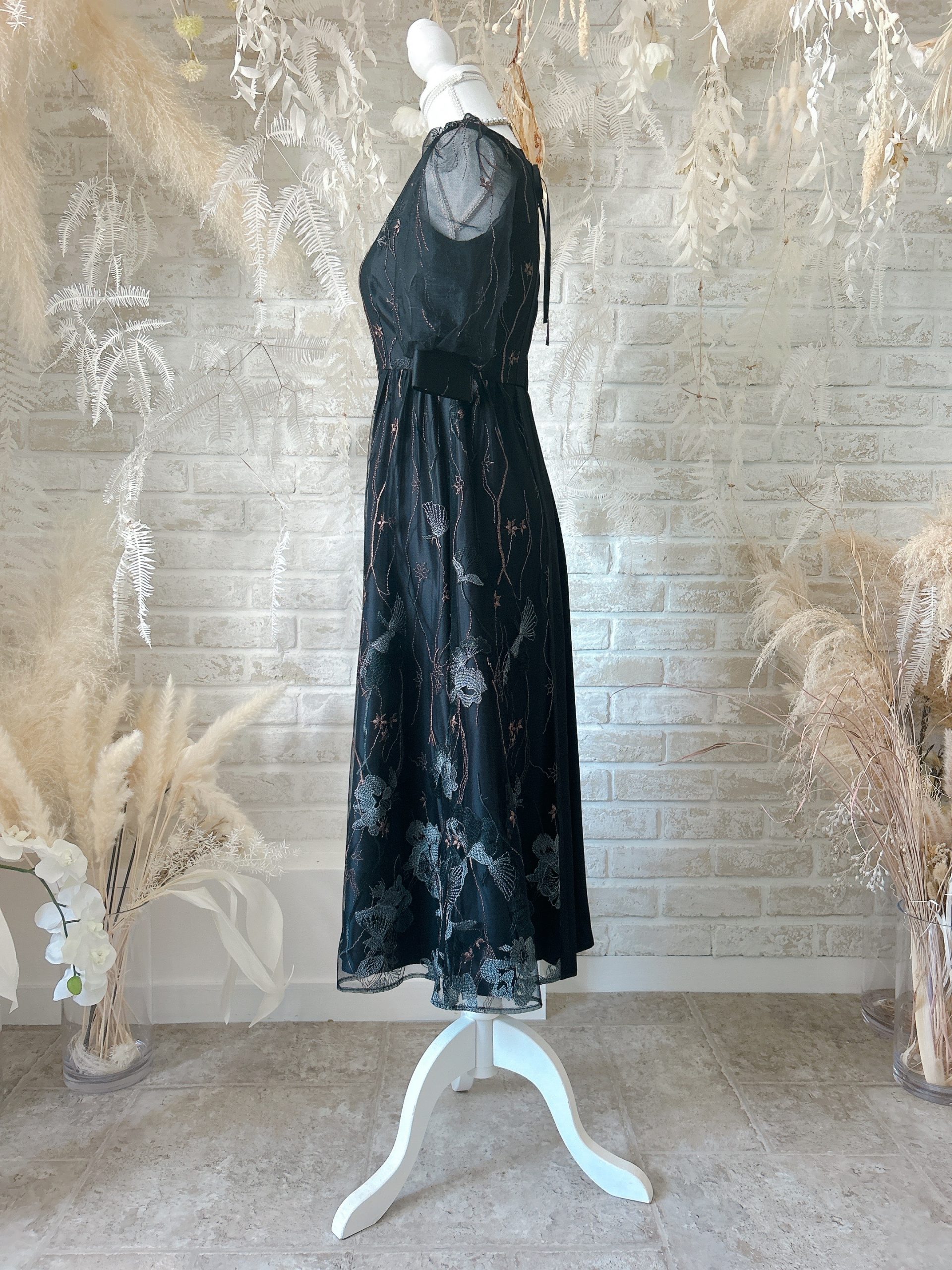 Black/Vネック2素材切り替え刺繡ドレス〈M〉