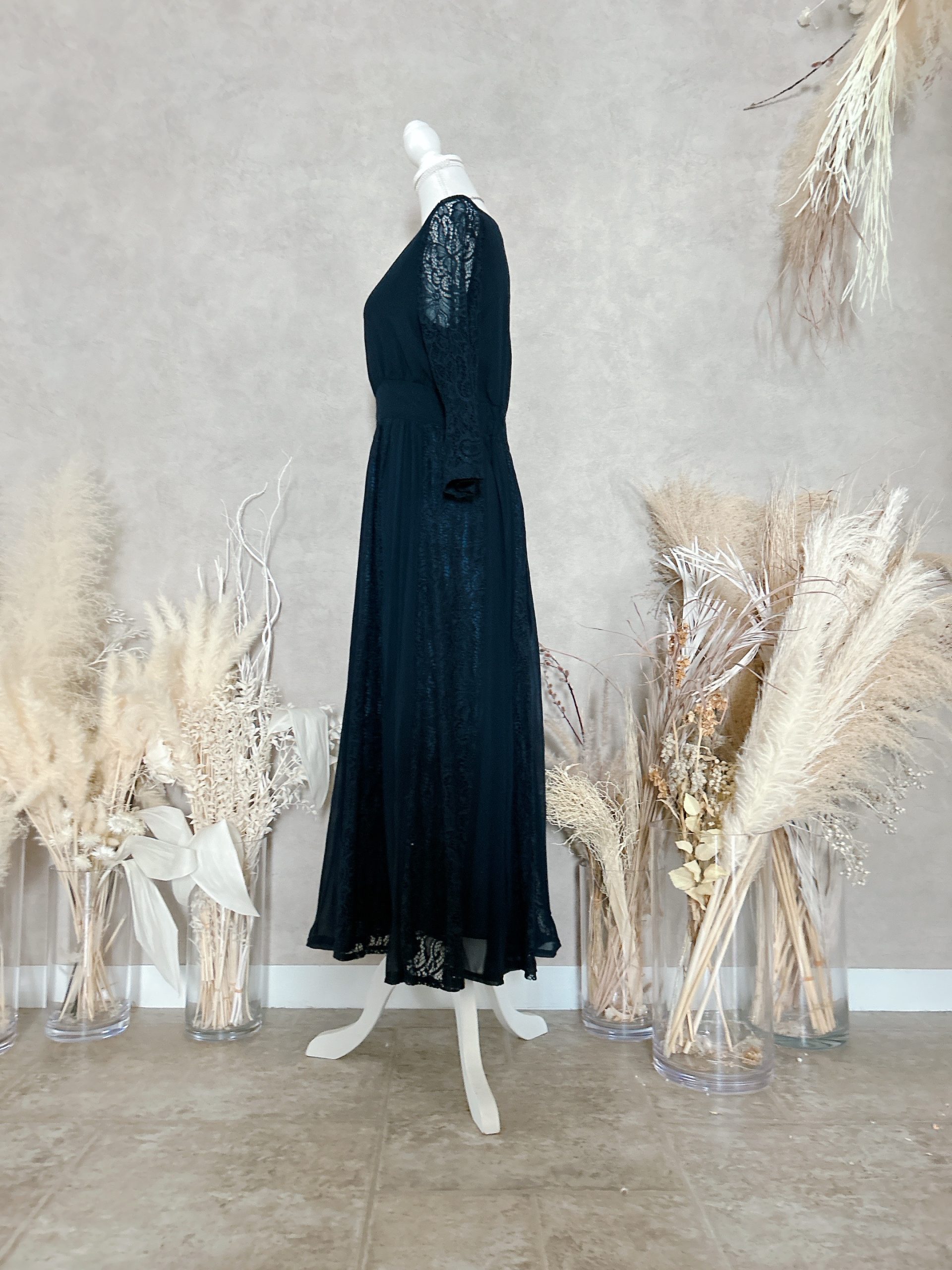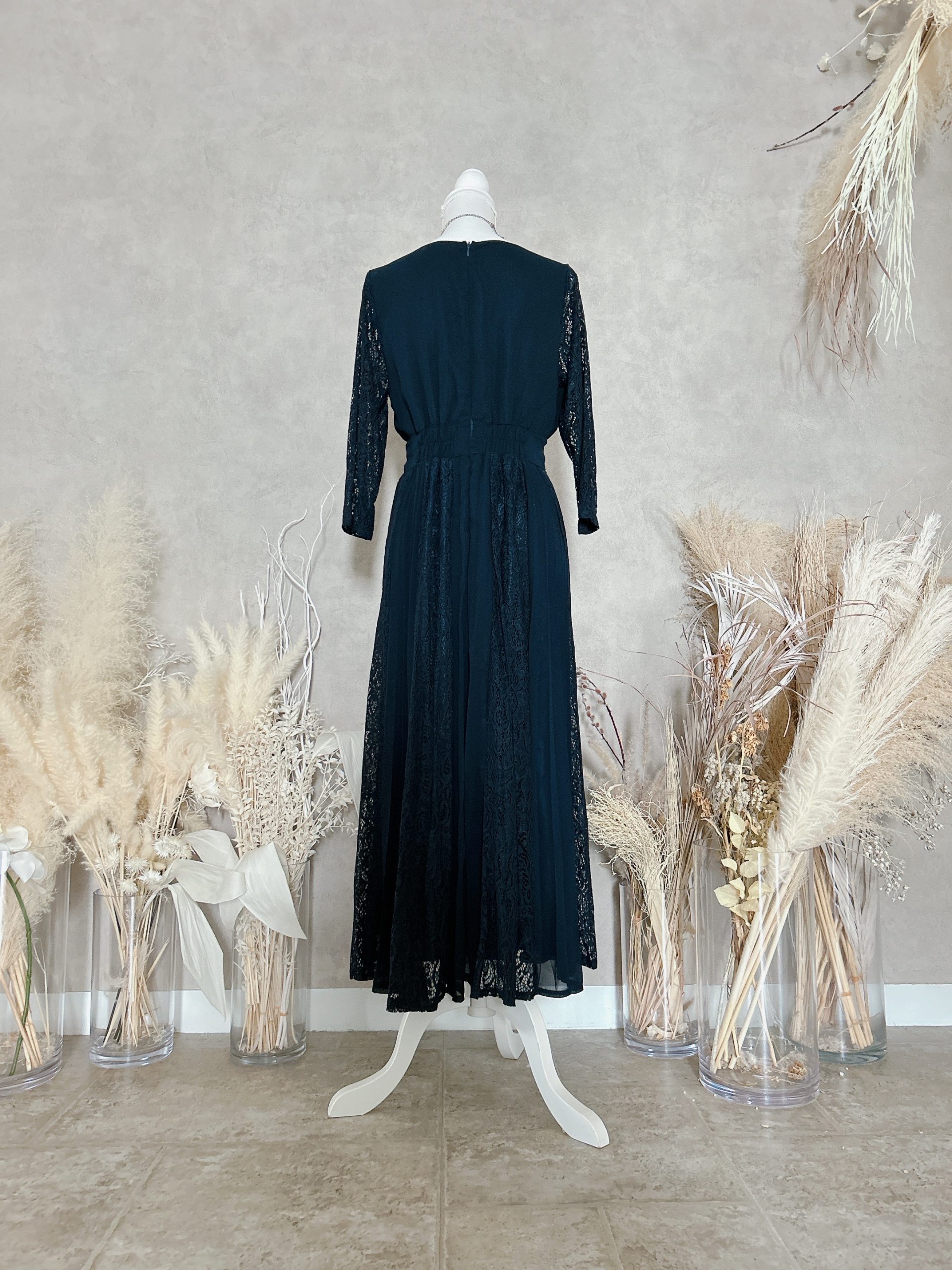 navy/袖レース×プリーツスカート切替ドレス〈3L〉