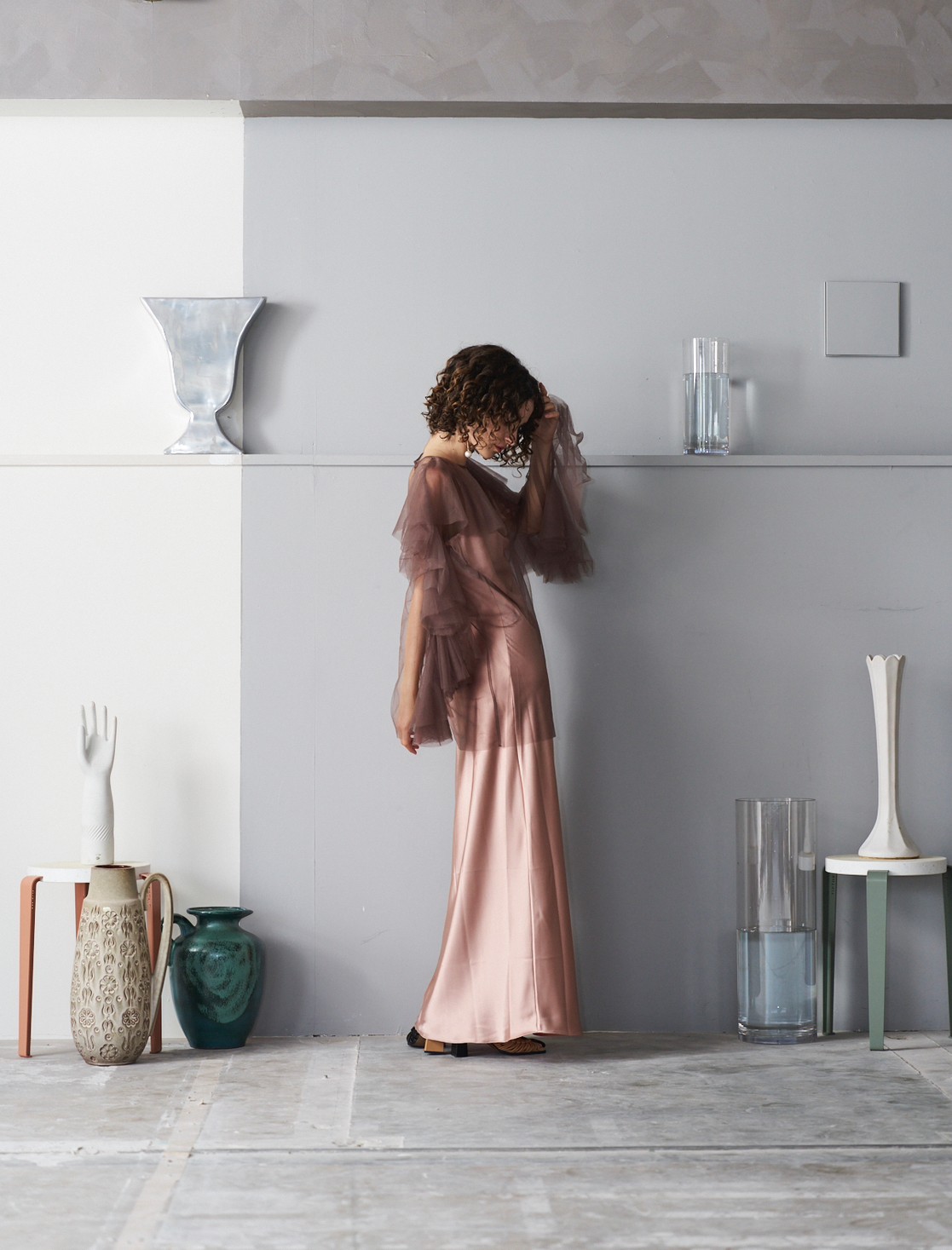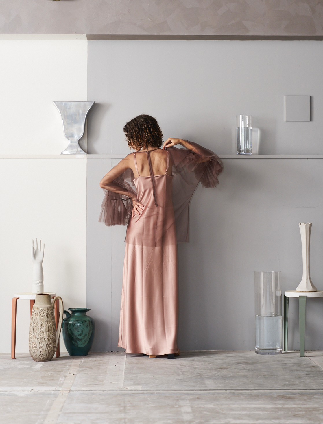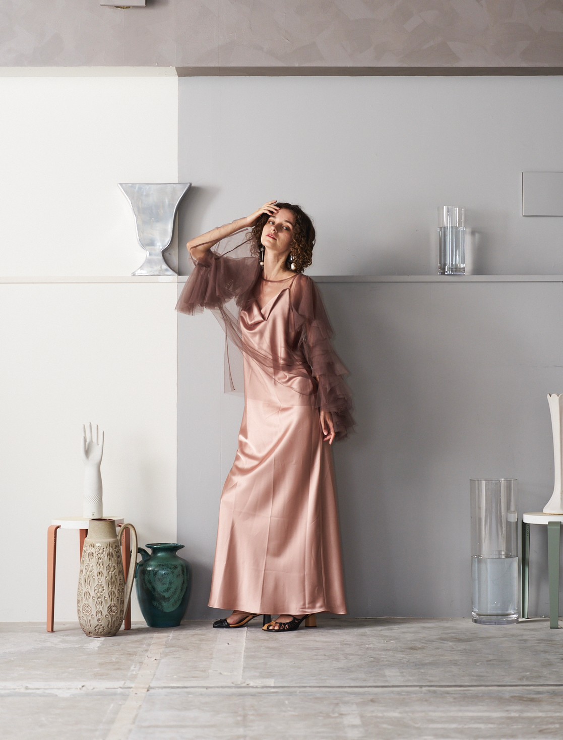 サテンモーヴピンクパープル キャミソールスレンダースリップドレス