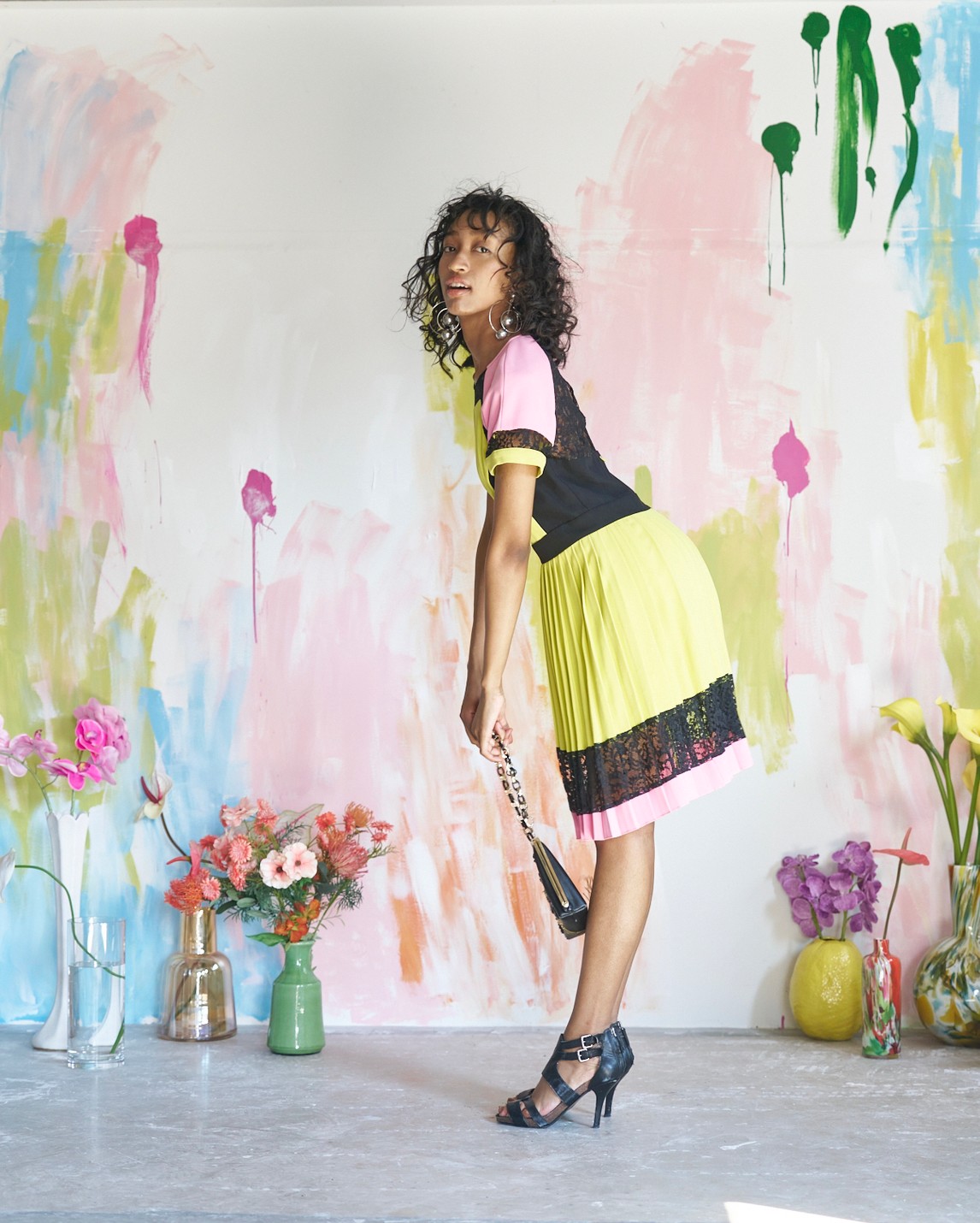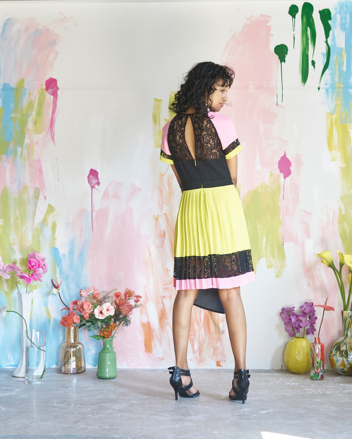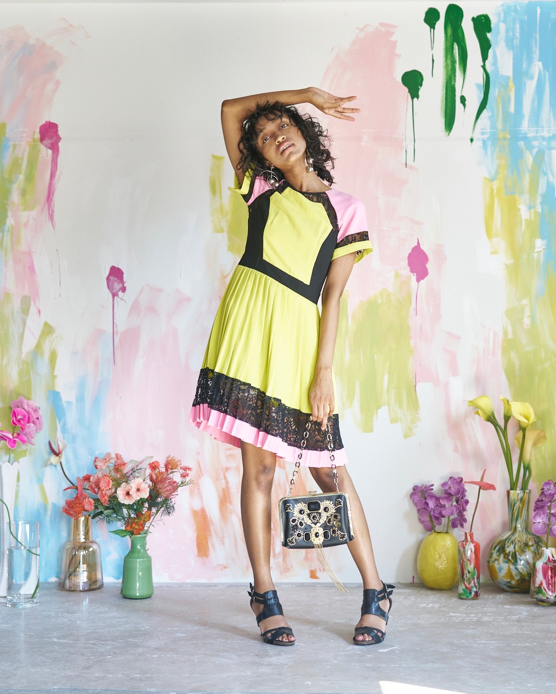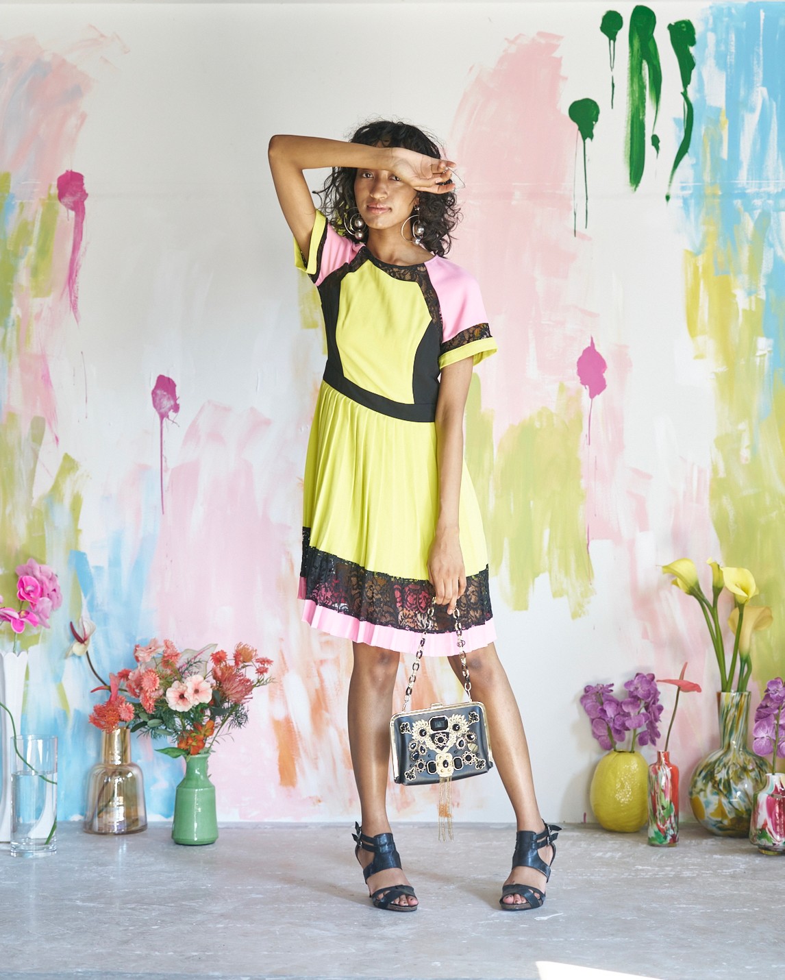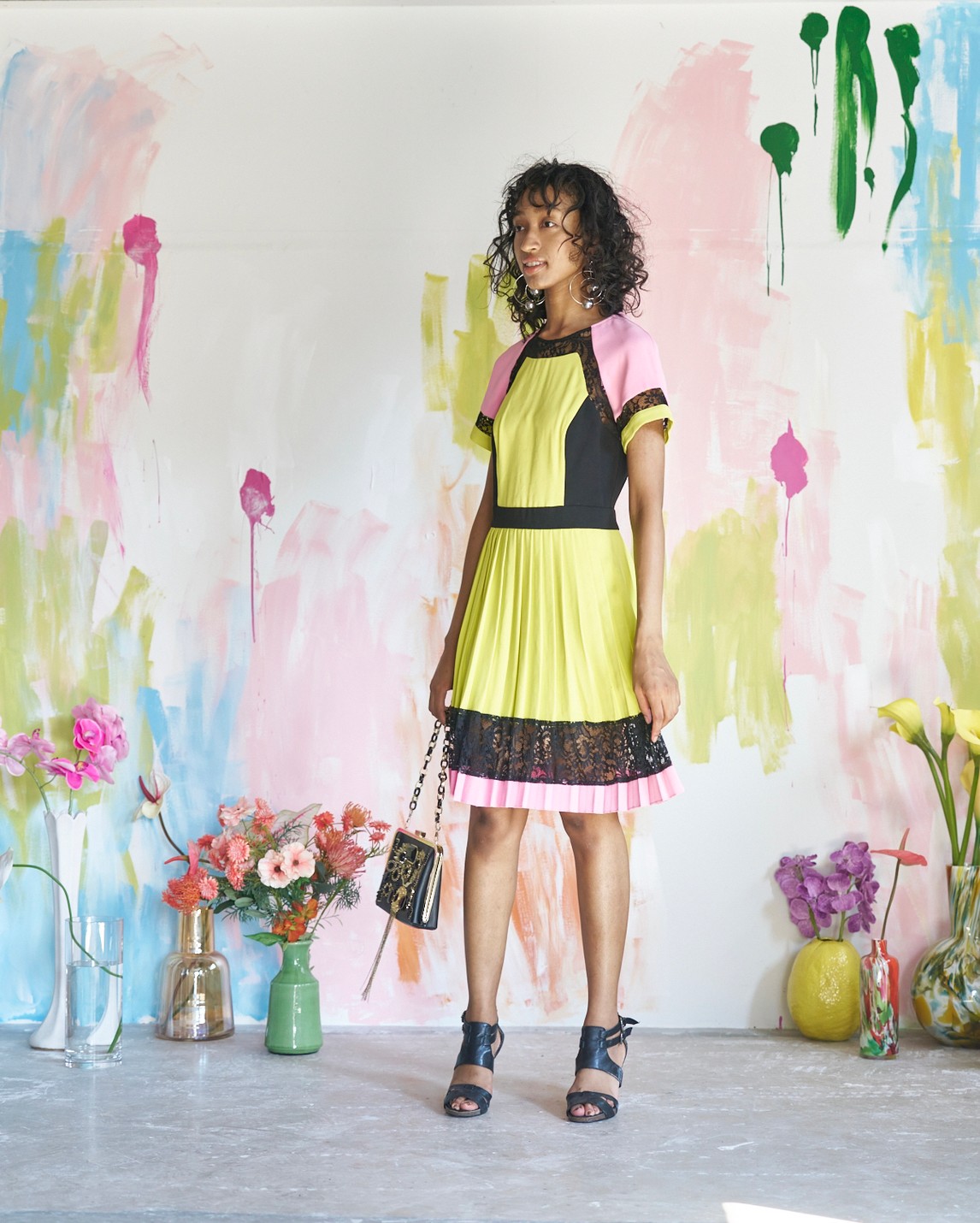 BCBGレモンイエロー×ピンク×ブラック個性的ショートスリーブワンピースドレス