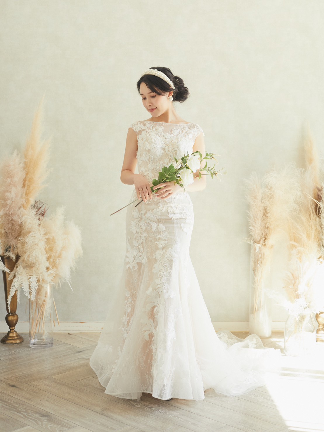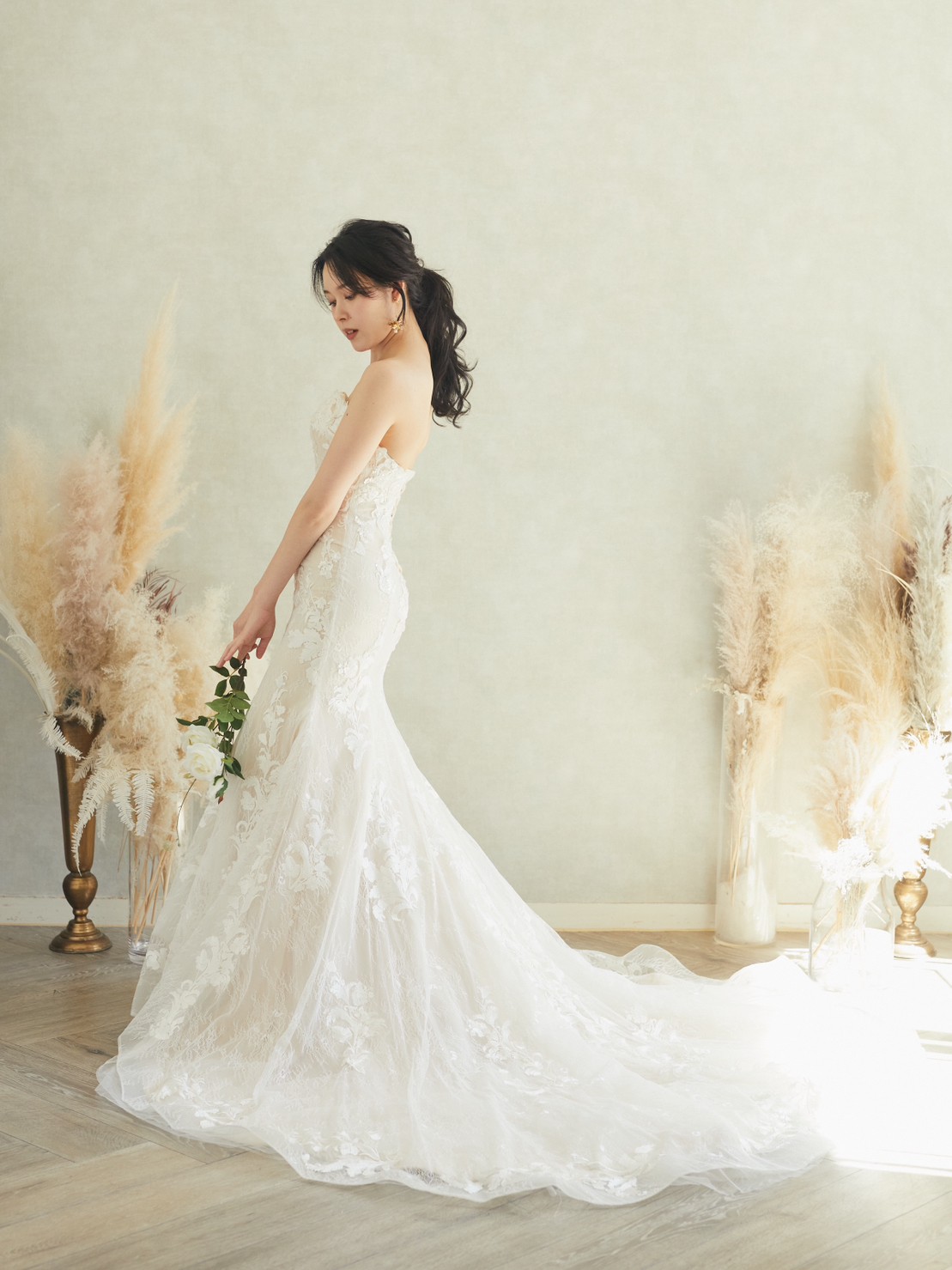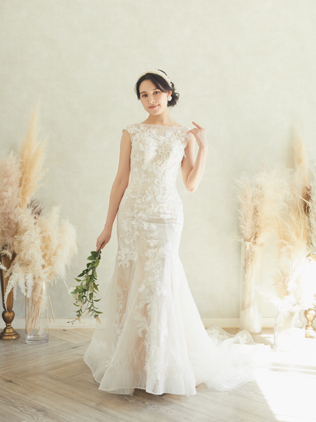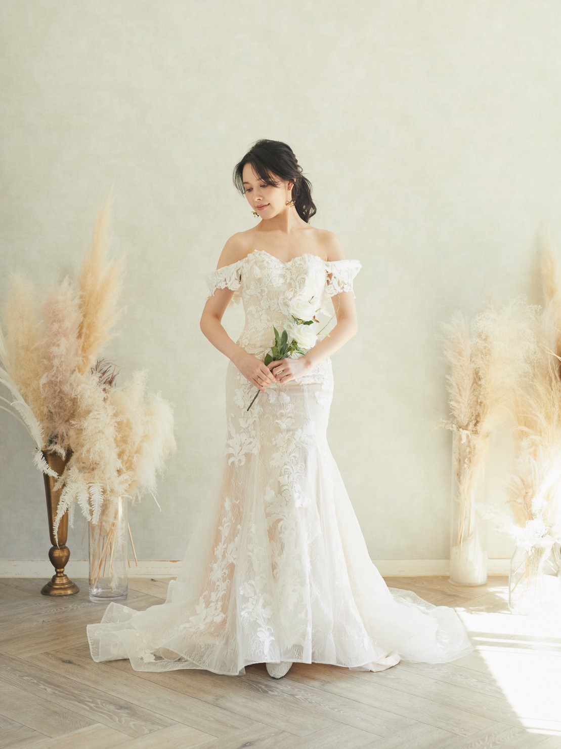 ベア、オフショルダー、ノースリーブと3wayのドレス マーメイドラインで大人っぽく上品に。 挙式から披露宴でスタイリングを変えたり、披露宴から二次会でスタイリングを変えたり、1着で様々なシーンで変化を付けれるドレスです。 全体的にフラワーレースモチーフデザインがありとても華やかな1着。