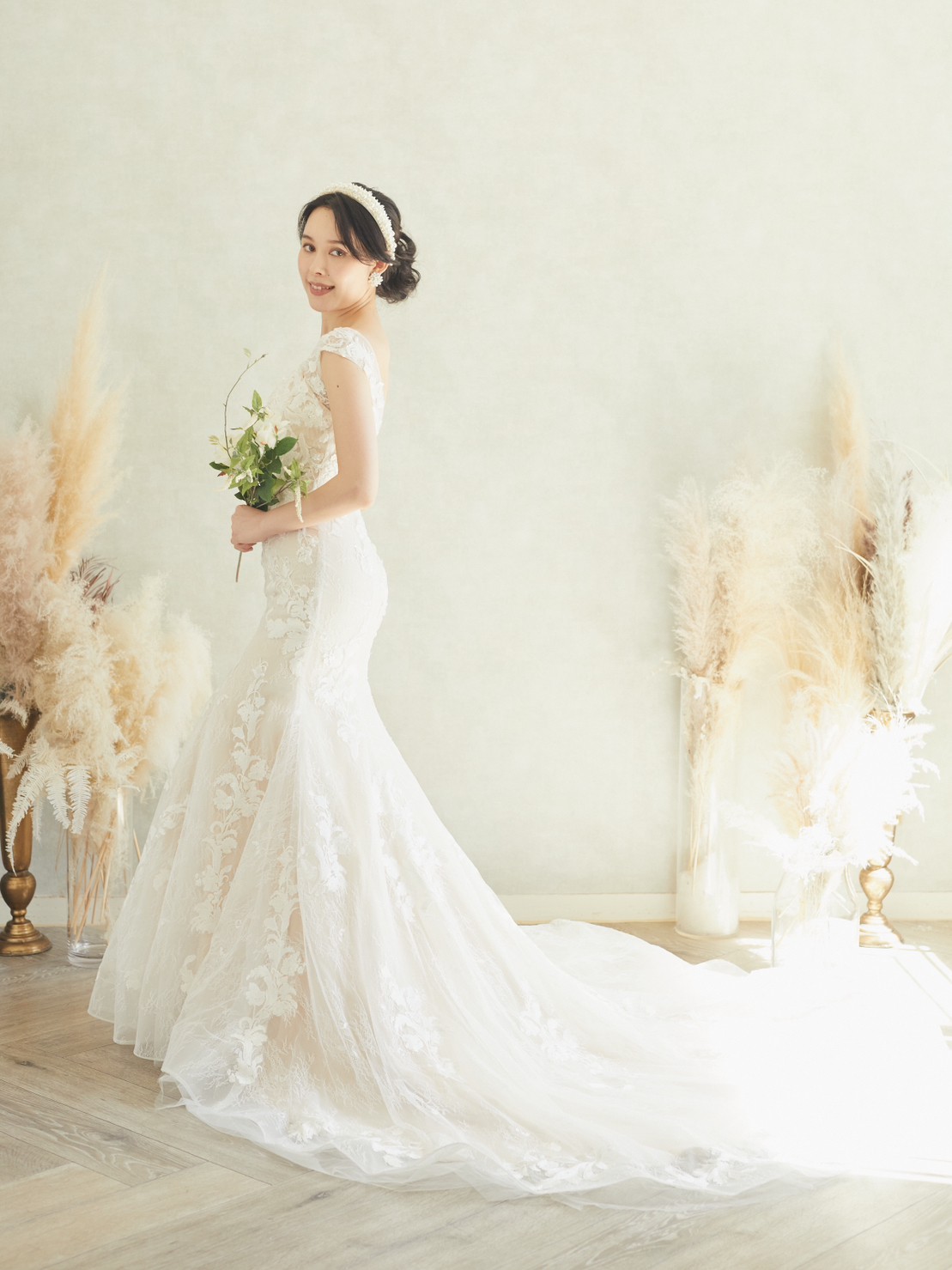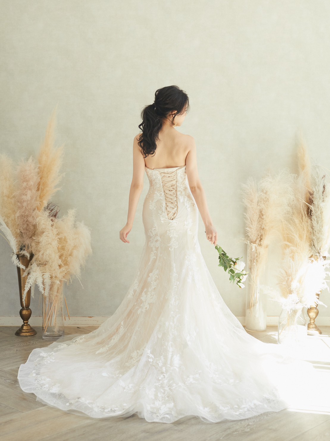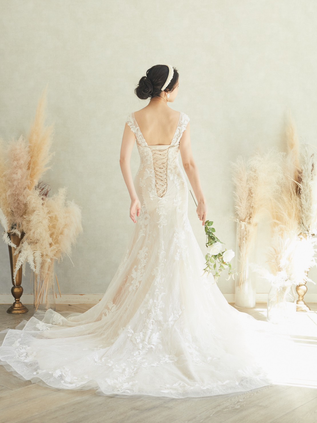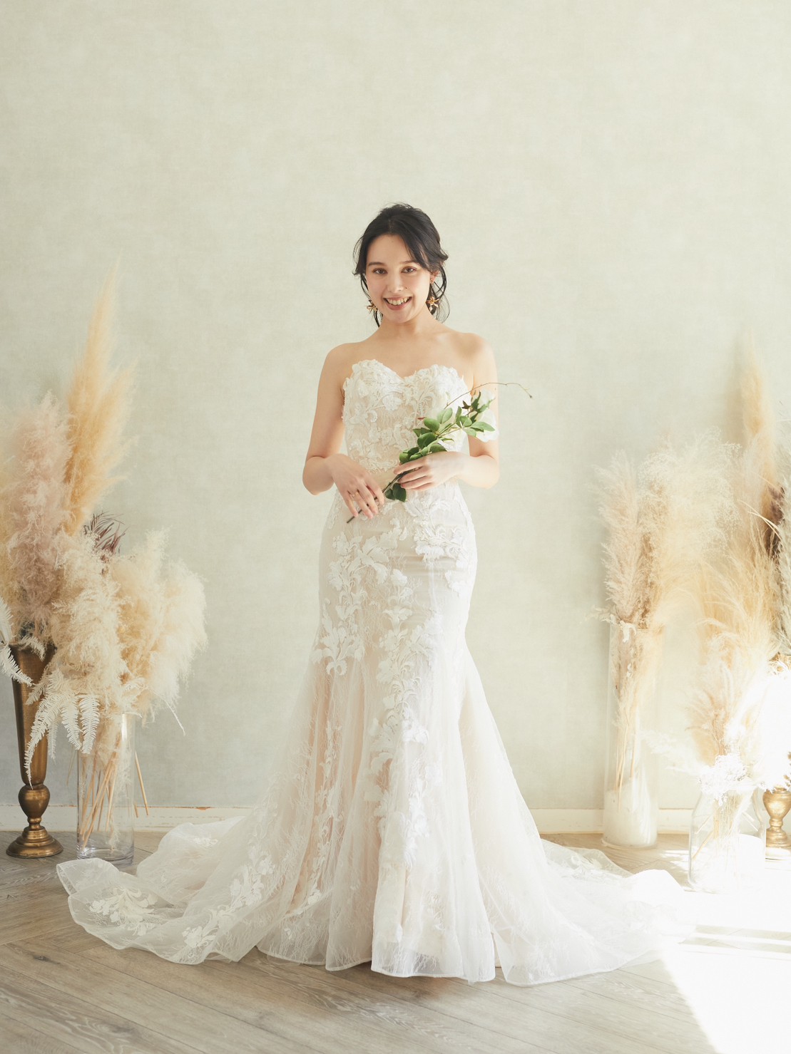 ベア、オフショルダー、ノースリーブと3wayのドレス マーメイドラインで大人っぽく上品に。 挙式から披露宴でスタイリングを変えたり、披露宴から二次会でスタイリングを変えたり、1着で様々なシーンで変化を付けれるドレスです。 全体的にフラワーレースモチーフデザインがありとても華やかな1着。
