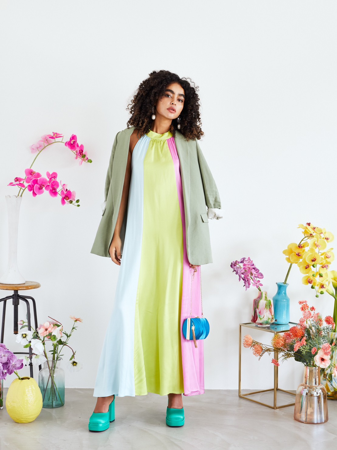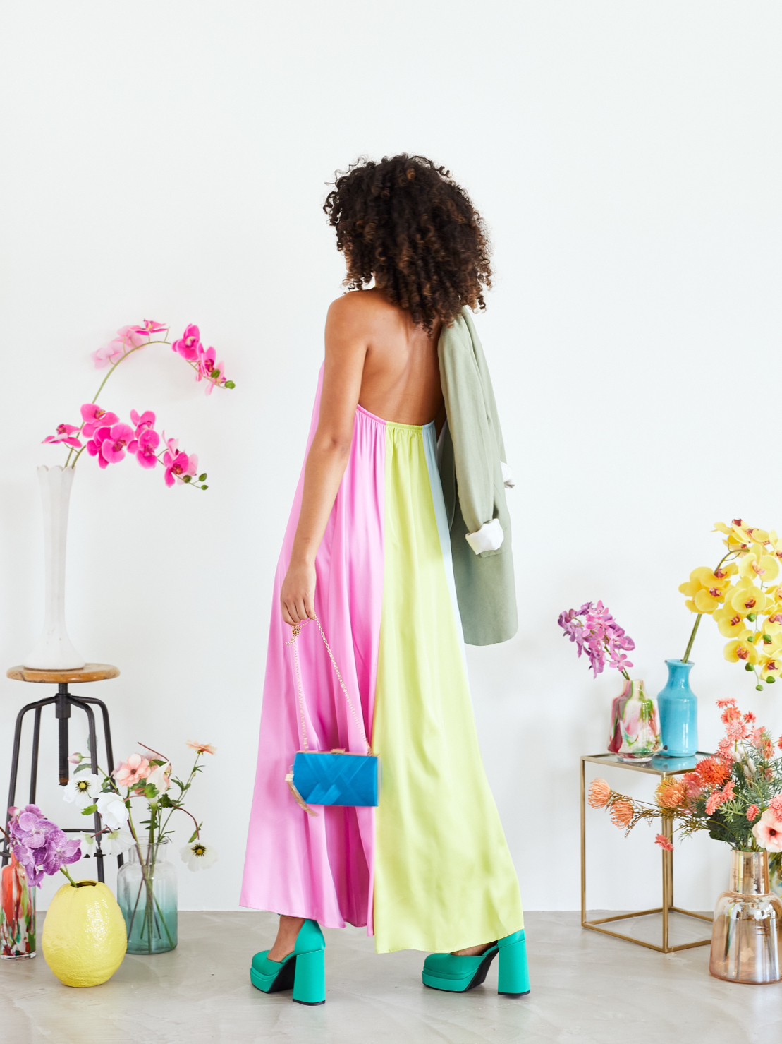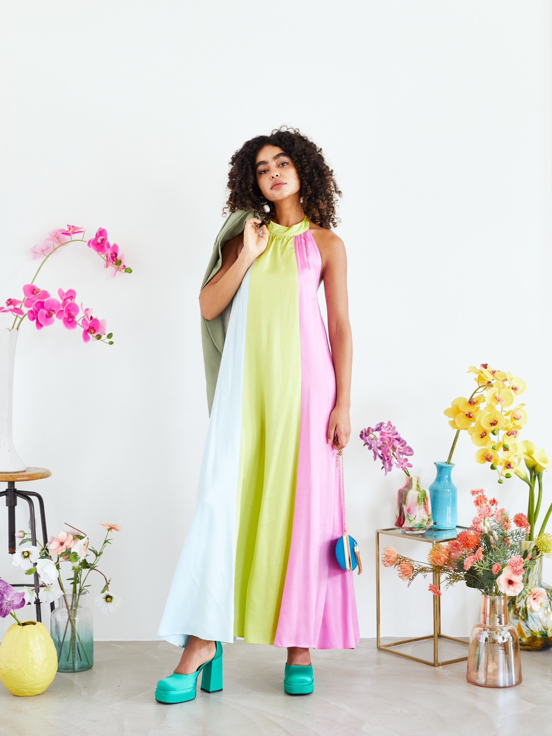 3色カラフルボーダーホルダーネックロングドレス 38 S-M