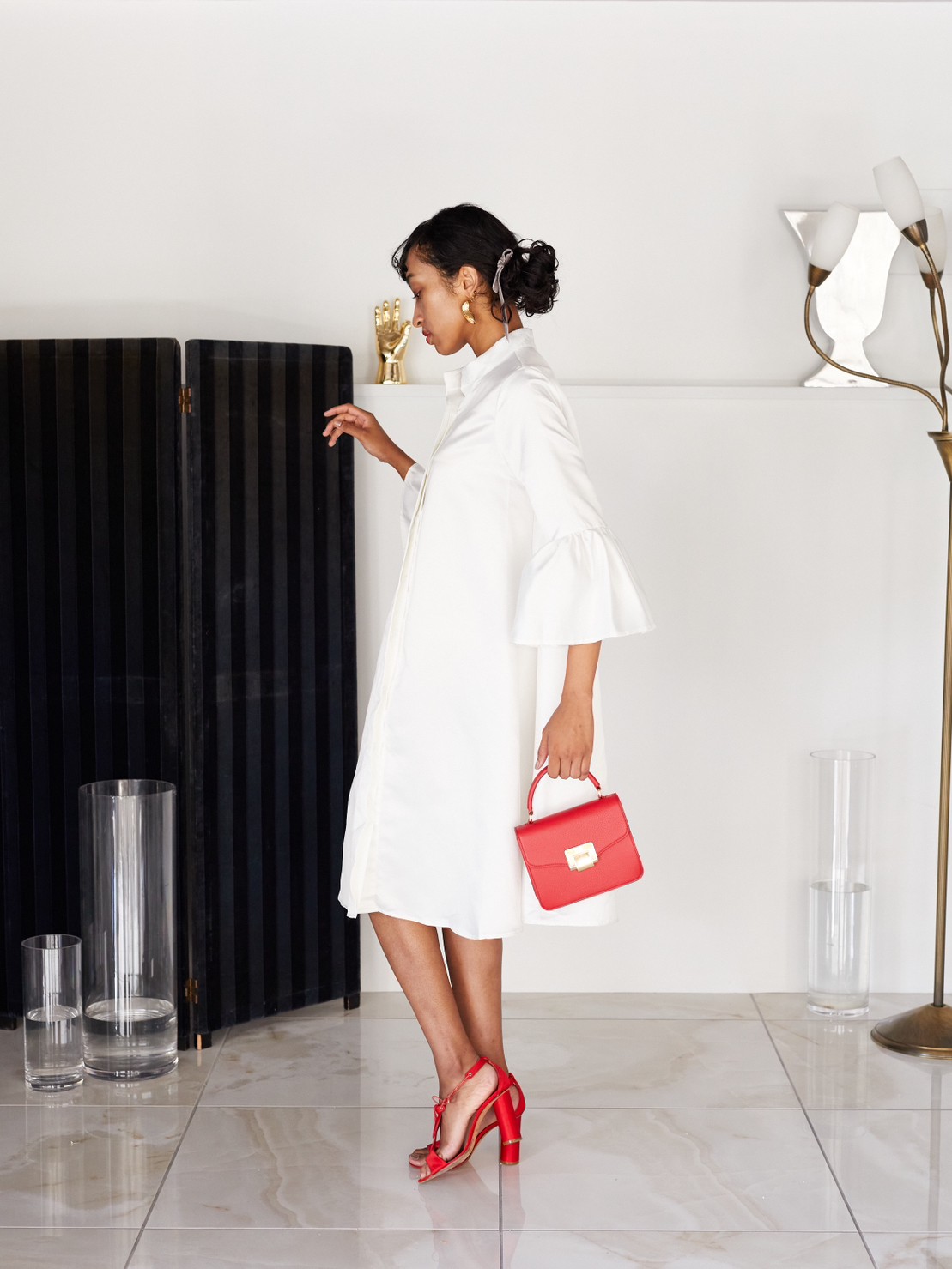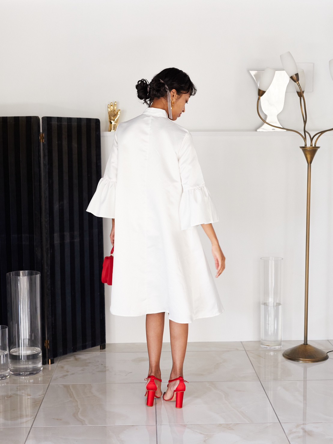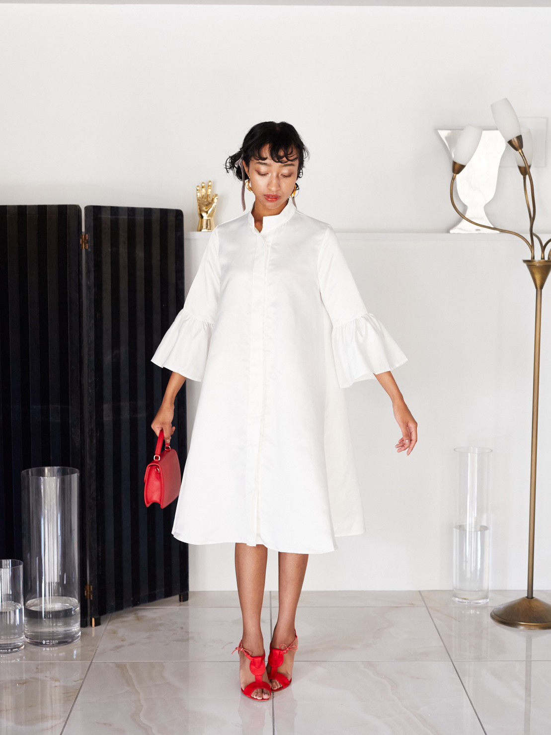 ホワイトノーカラーマンダリンスリーブシャツワンピース