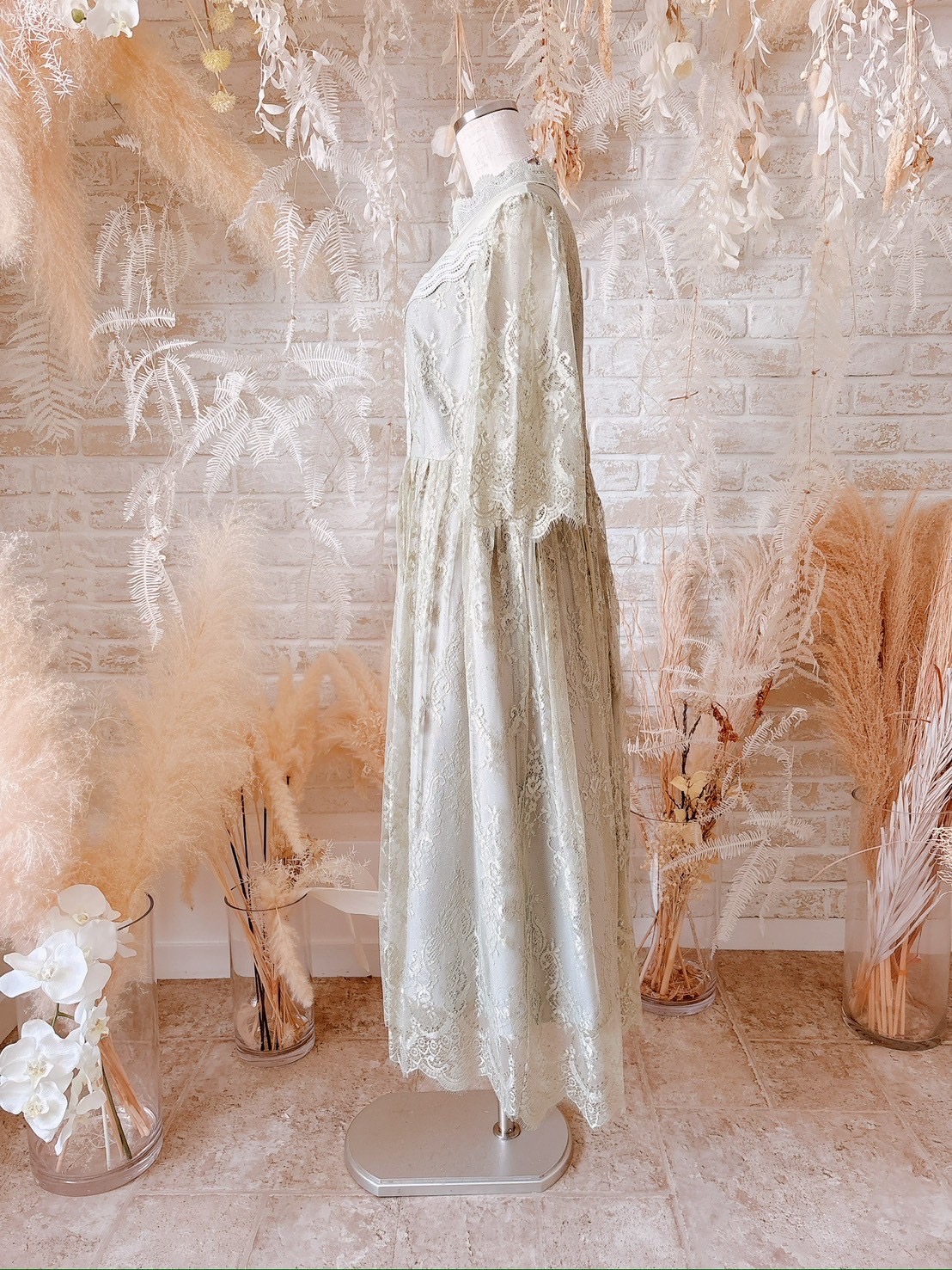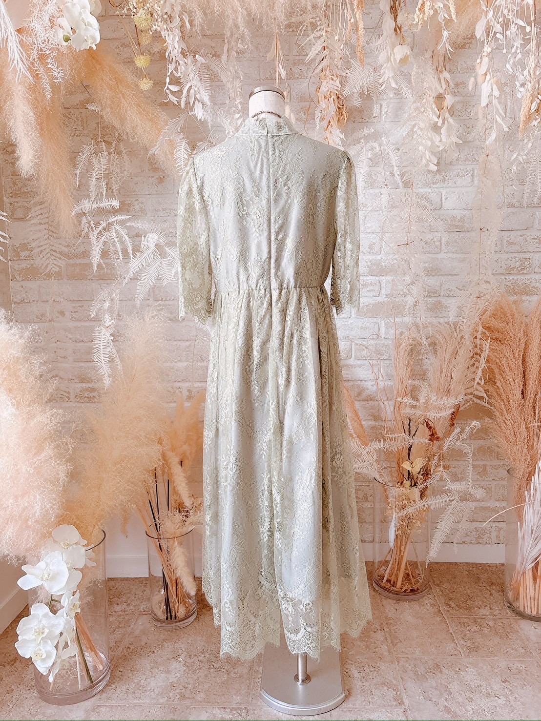 rightgreen/ハイネック5分袖総レースミモレ丈ドレス【XL】