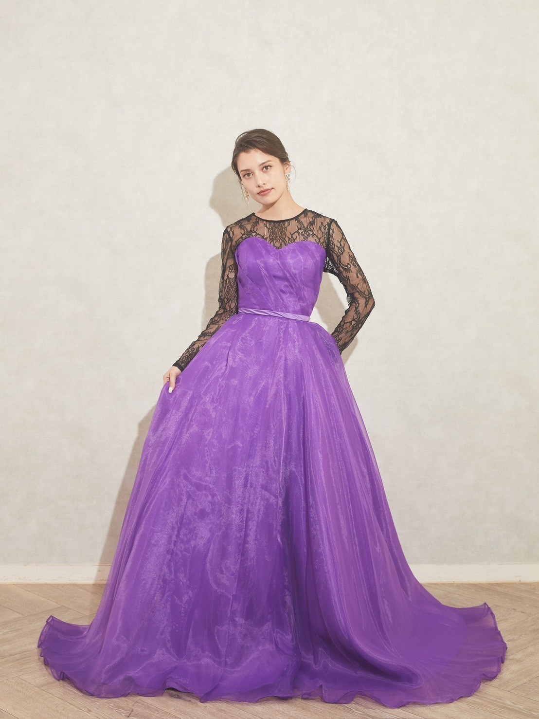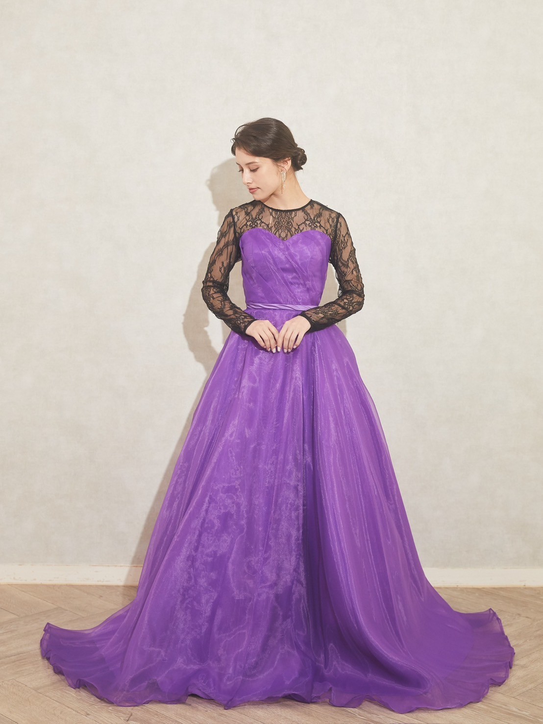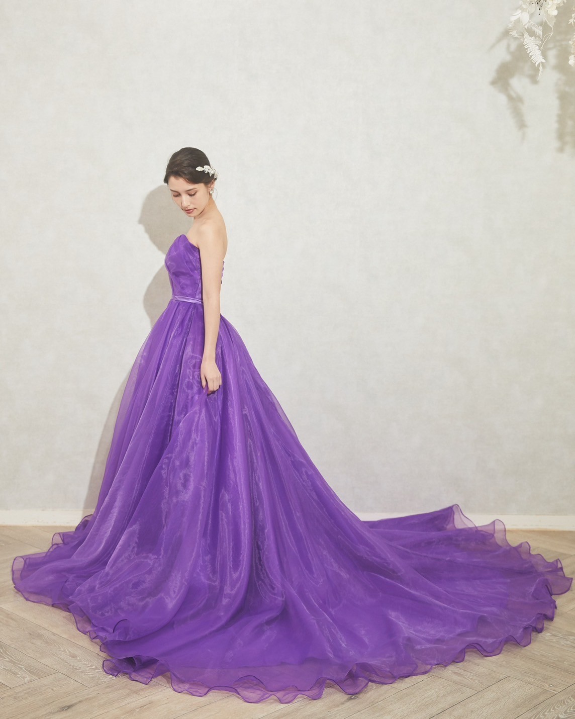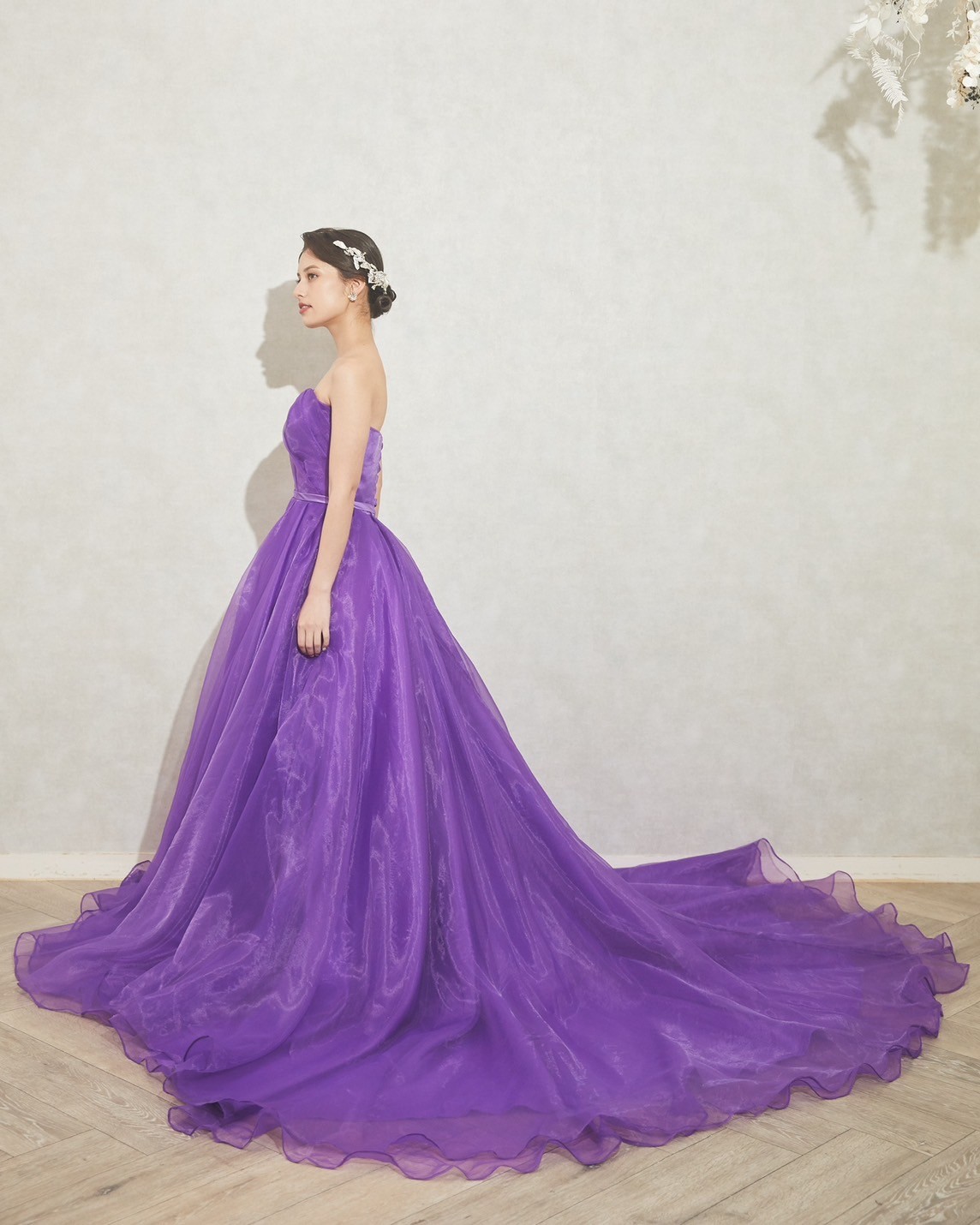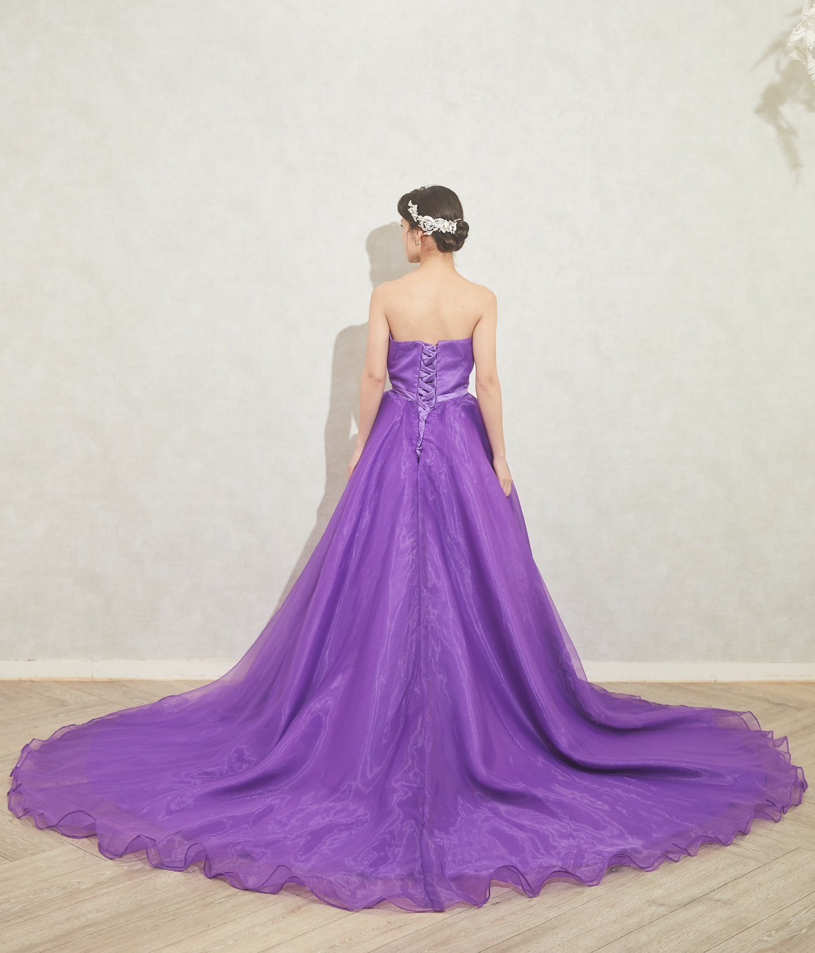 鮮やかなグレーパープルのカラードレス オーガンジーが軽くとっても華やかな印象のデザインです シンプルなのでドレスインナーと合わせても相性◎ 編み上げデザインなのでバックスタイルも可愛いです 挙式、披露宴、二次会、ウェディングパーティー、フォトウェディング、あらゆるシーンで大活躍。立ち姿も座り姿も美しく魅せ、着映えするデザインなので、どの会場でも華やかに存在感をアピールできます。