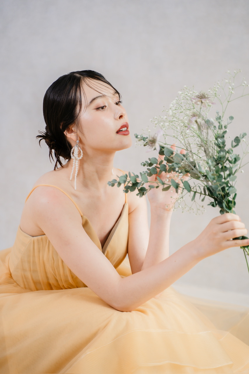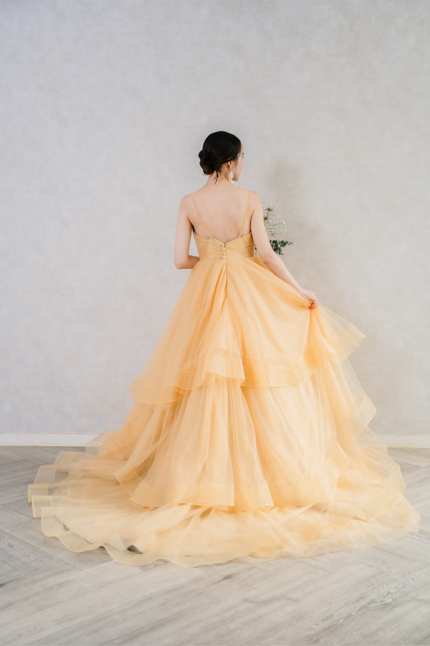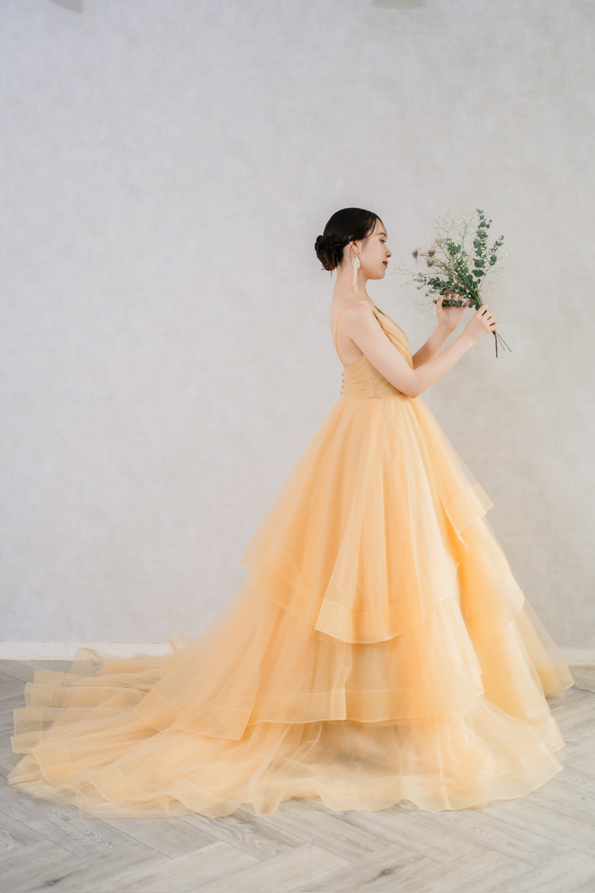 優しい色合いのイエローが上品なカラードレス フリルのスカートがとても可愛く、細いキャミストラップが女性らしさをプラス チュール素材で軽やかで胸元のカッティングは上品でエレガンスな印象に。 挙式、披露宴、二次会、ウェディングパーティー、フォトウェディング、あらゆるシーンで大活躍。立ち姿も座り姿も美しく魅せ、着映えするデザインなので、どの会場でも華やかに存在感をアピールできます。