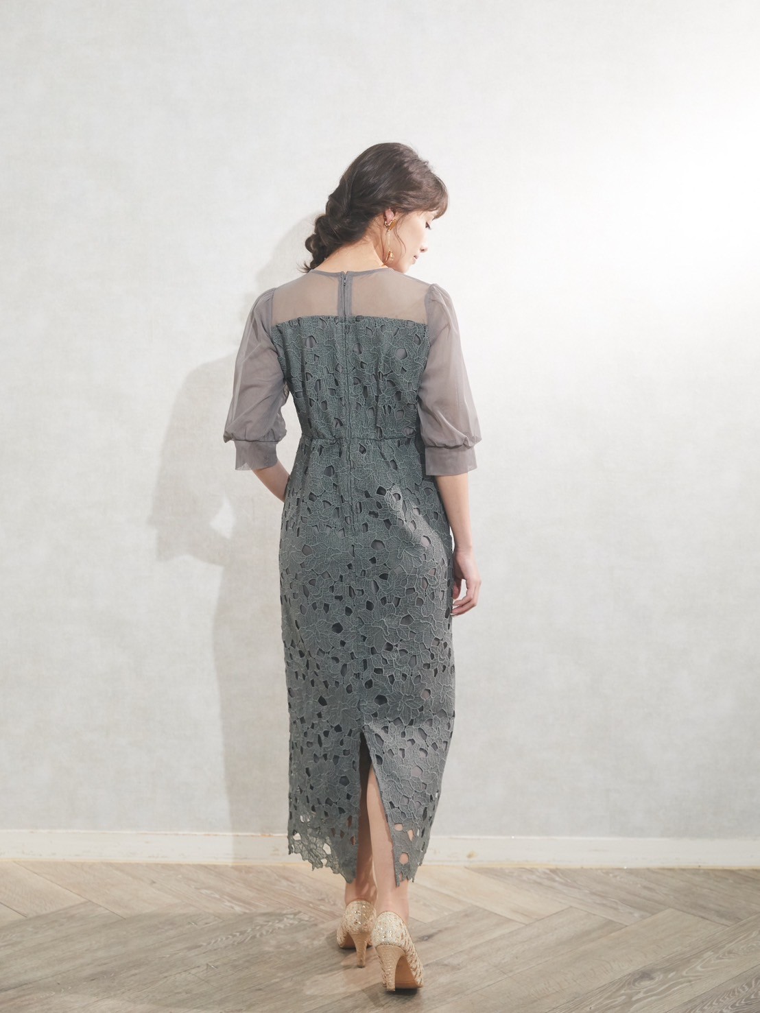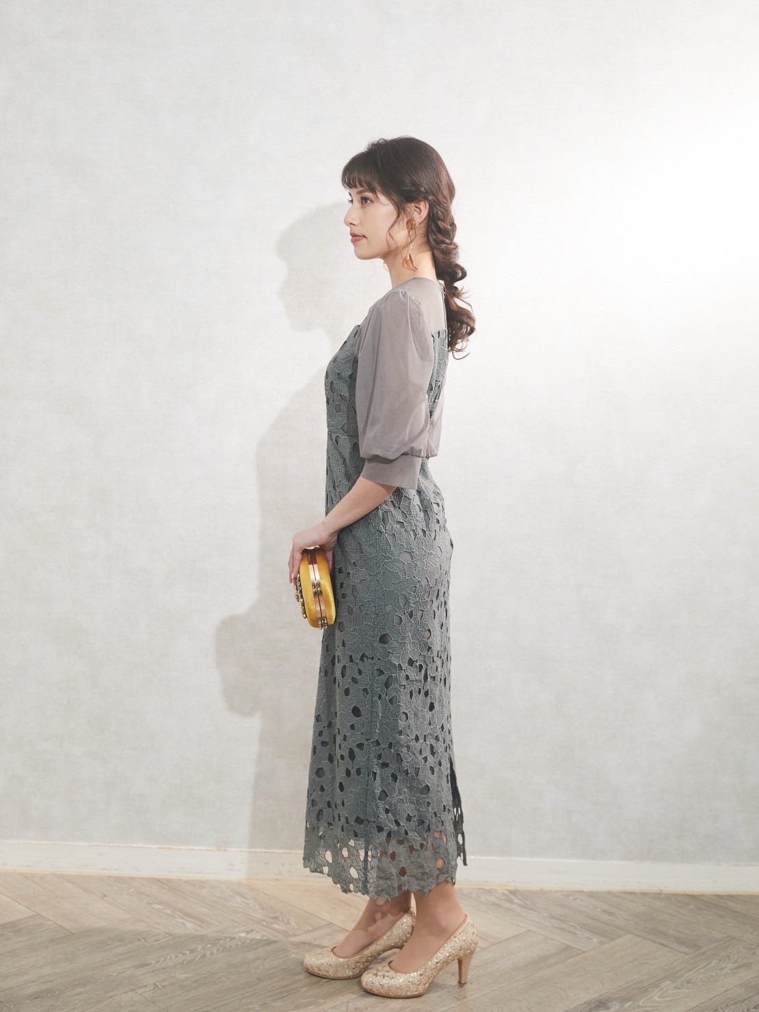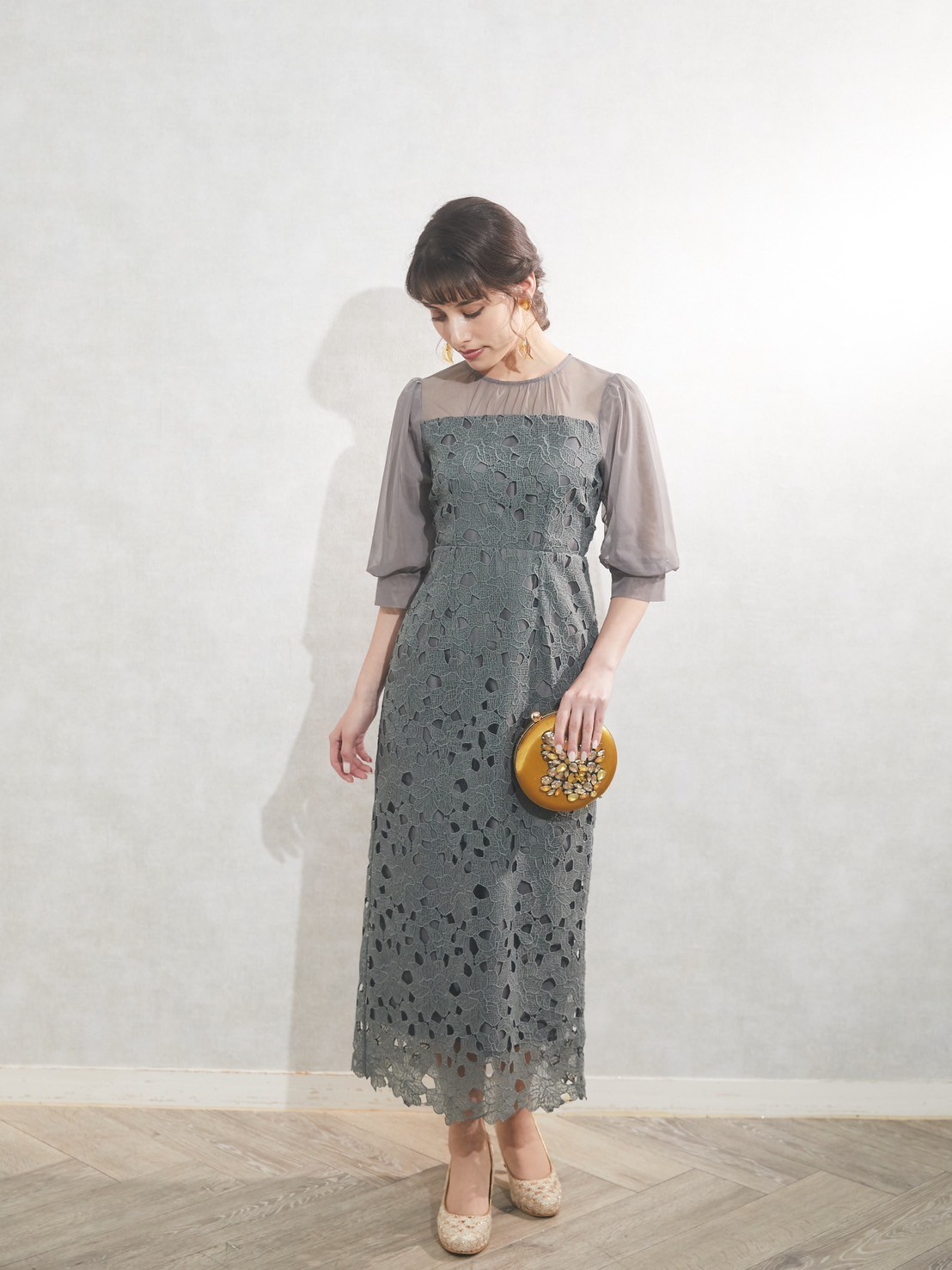 くすみカラーがおしゃれなグリーンのゲストパーティードレス チュールの透け感がヘルシー Iラインのデザイン、ミディアム丈ですっきりとした印象です 小物はゴールドが相性抜群です◎ 丈も長めなので、高身長の方にもおすすめです