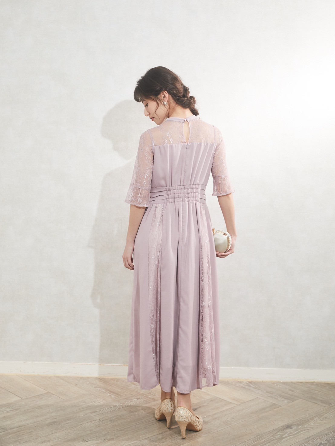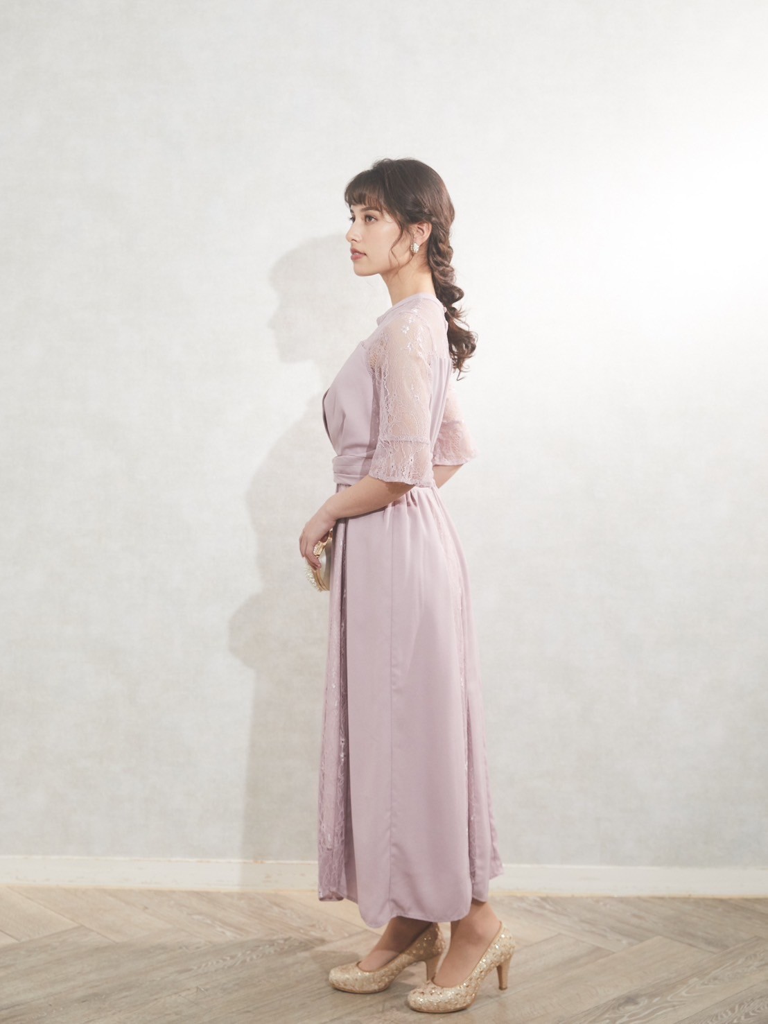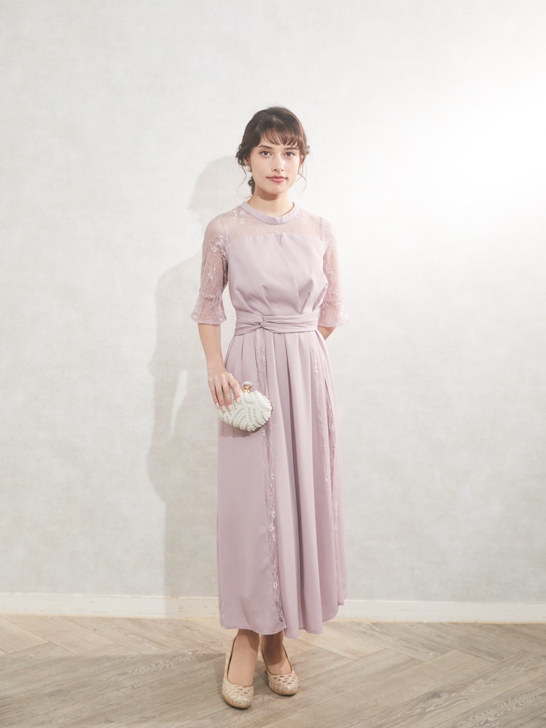 上品なピンクカラーが素敵なゲストパーティードレス ビスチェ風のデザインが可愛く、ウエストラインにもアクセントがあり、細見え効果も デコルテ袖はレース素材で女性らしさを 丈も長めなので、高身長の方にもおすすめです