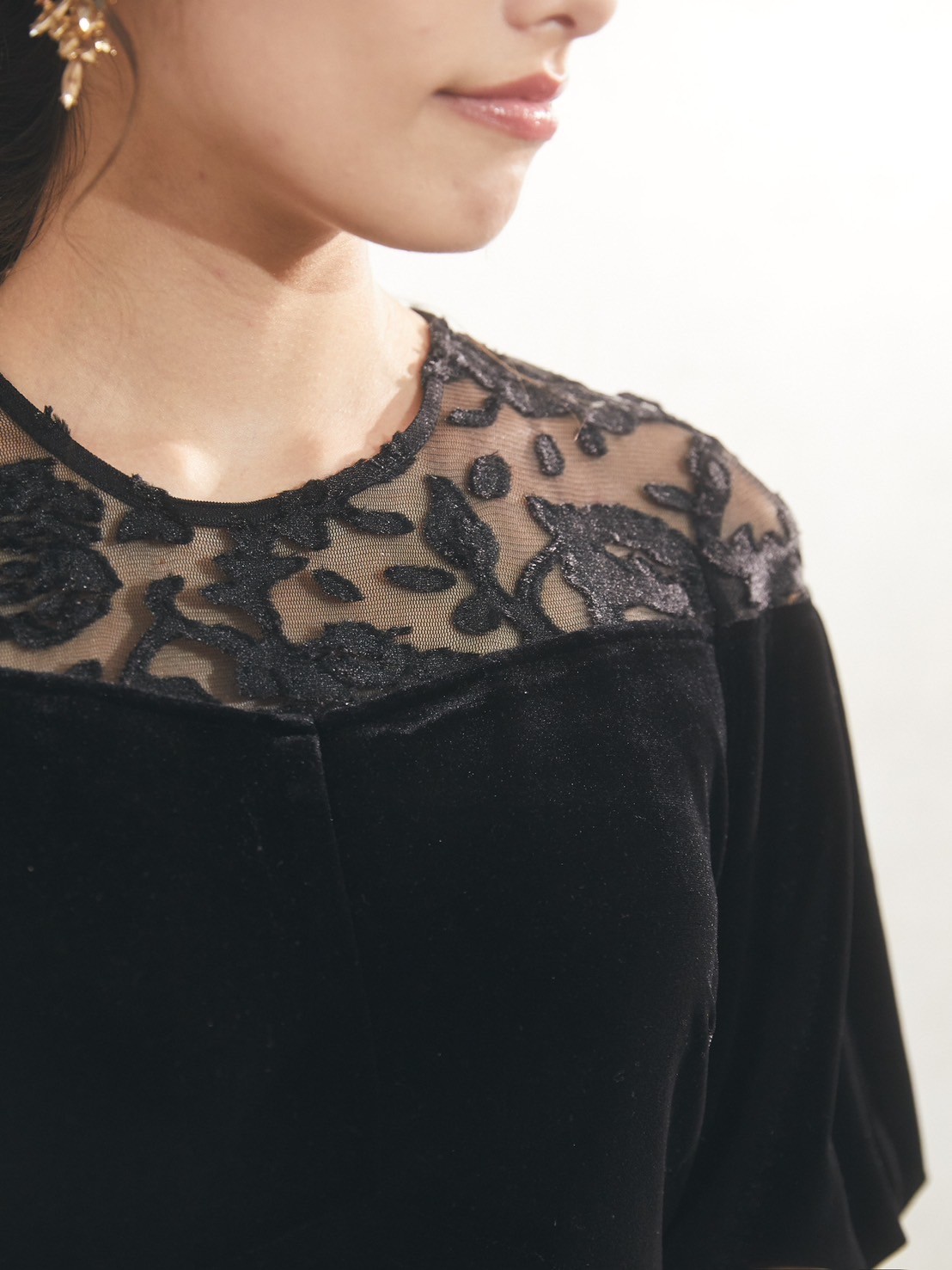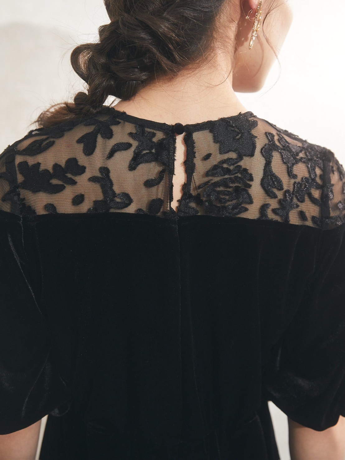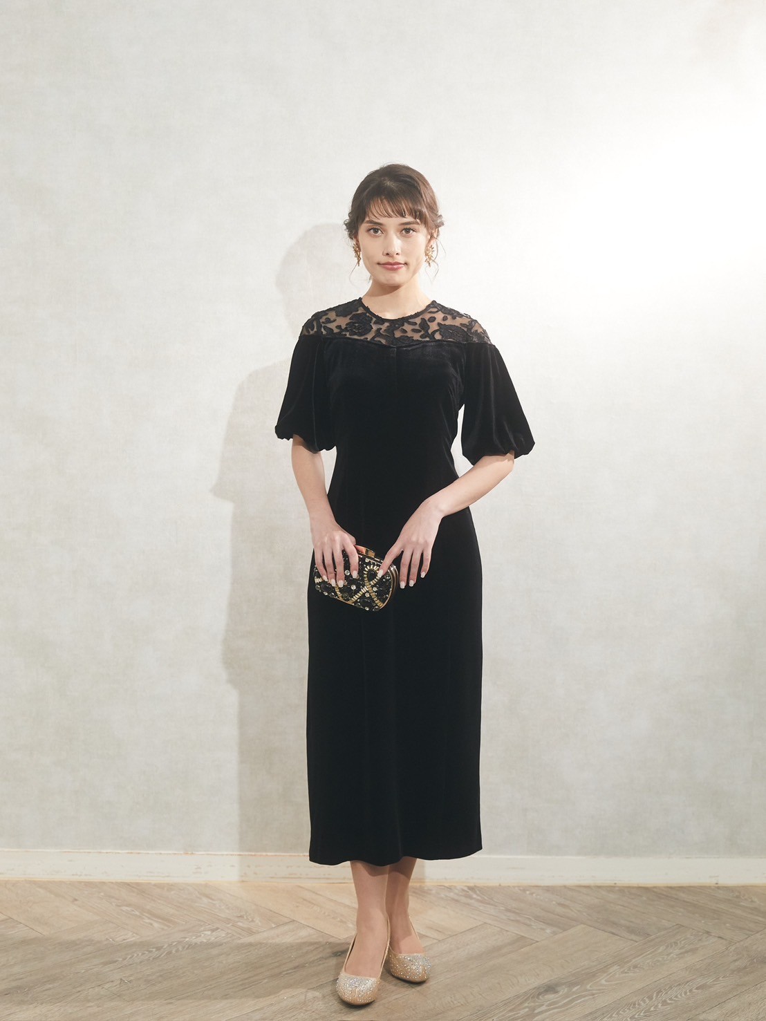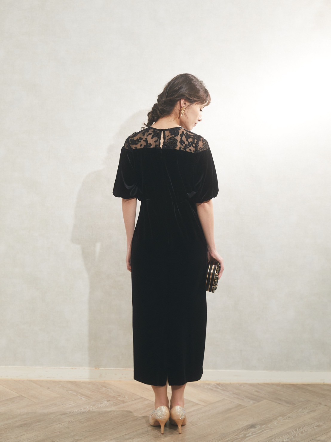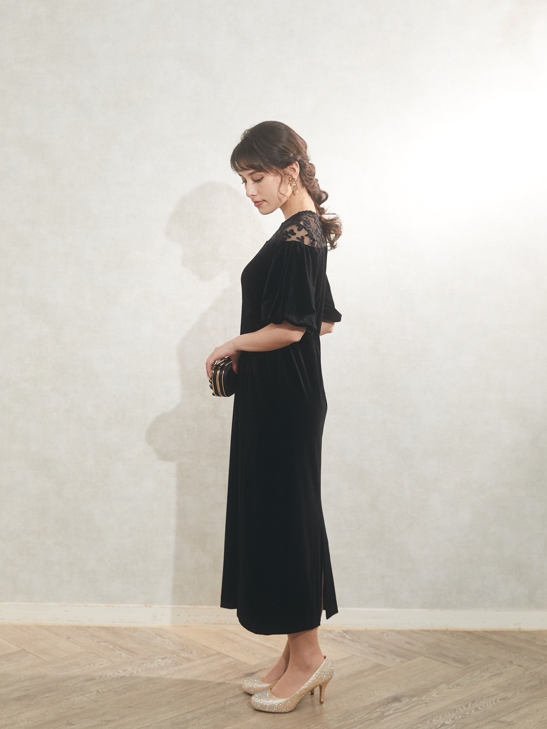 年齢を選ばないブラックのベロア×レースのゲストパーティードレス レースの透け感、バルーンスリーブが可愛らしいデザイン ミディアム丈が上品な印象です 小物はシルバー、ゴールド、カラーと幅広く相性抜群です◎
