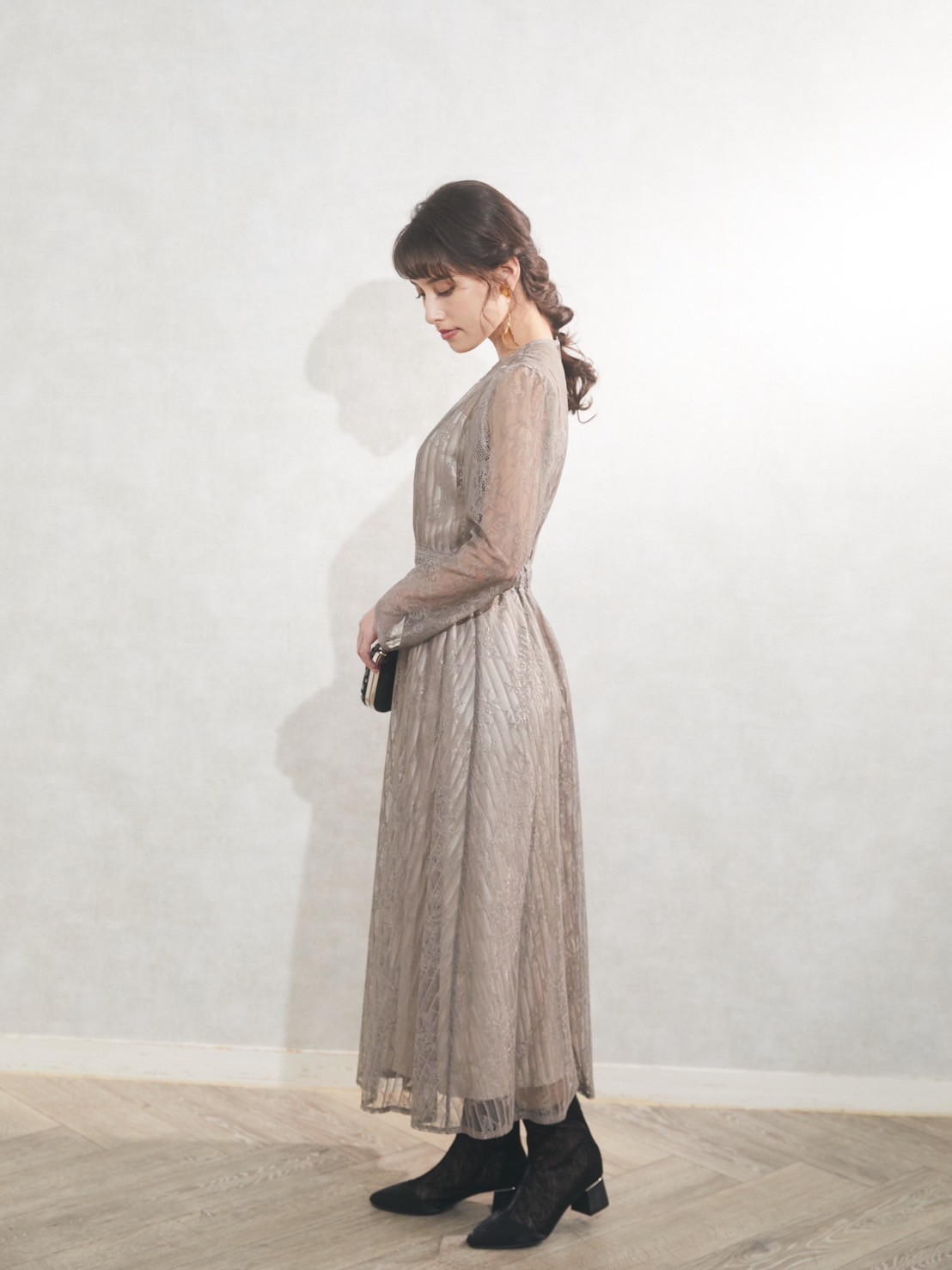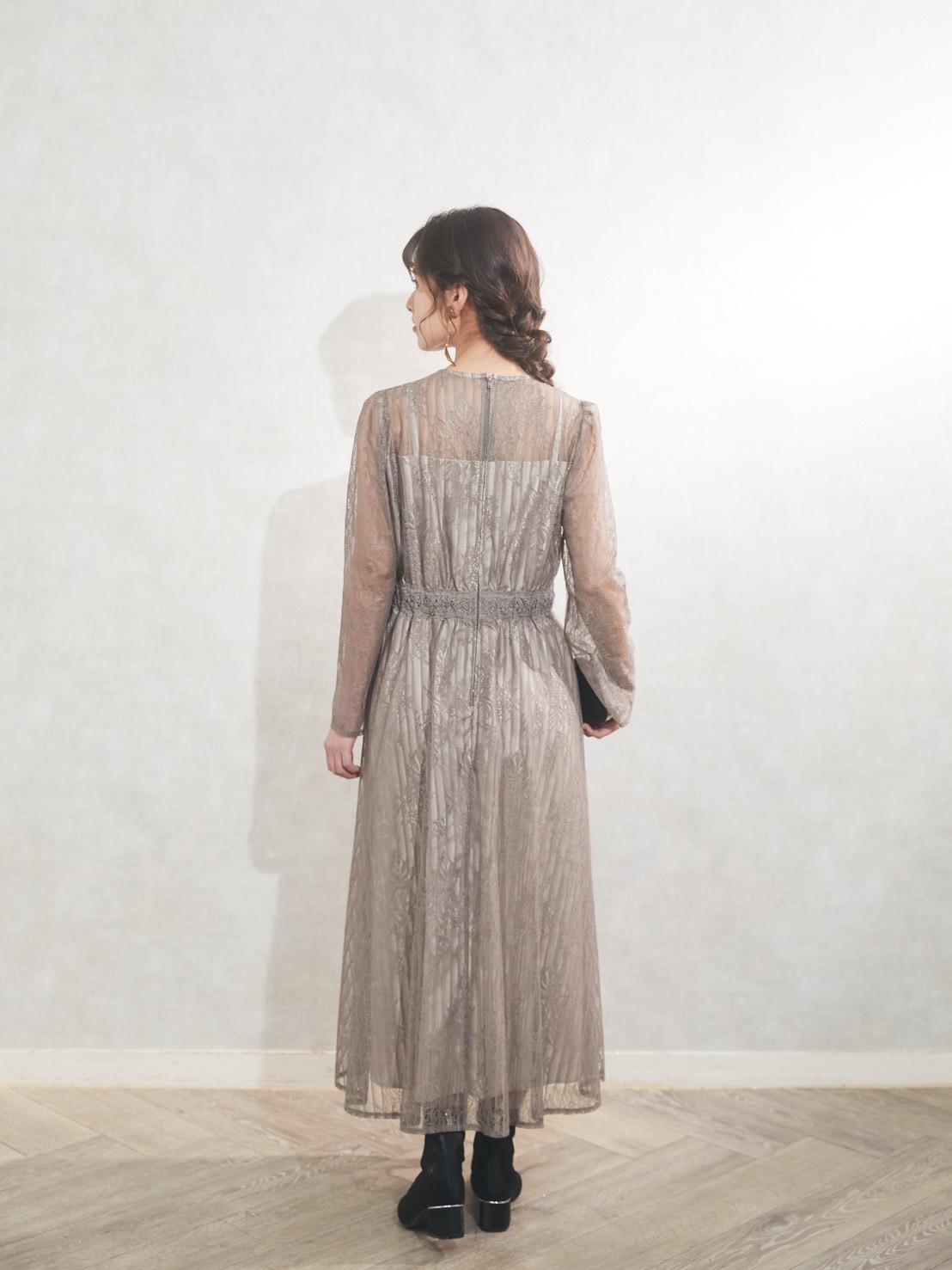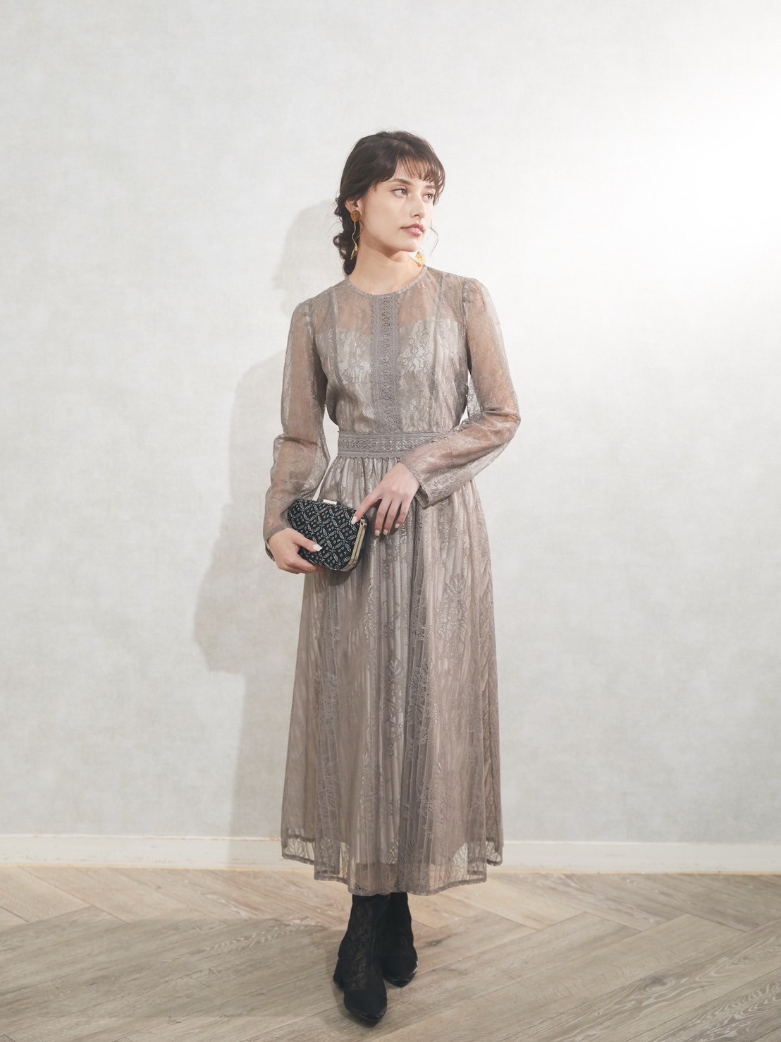 肌の露出も控えめなグレージュのワンピースドレス