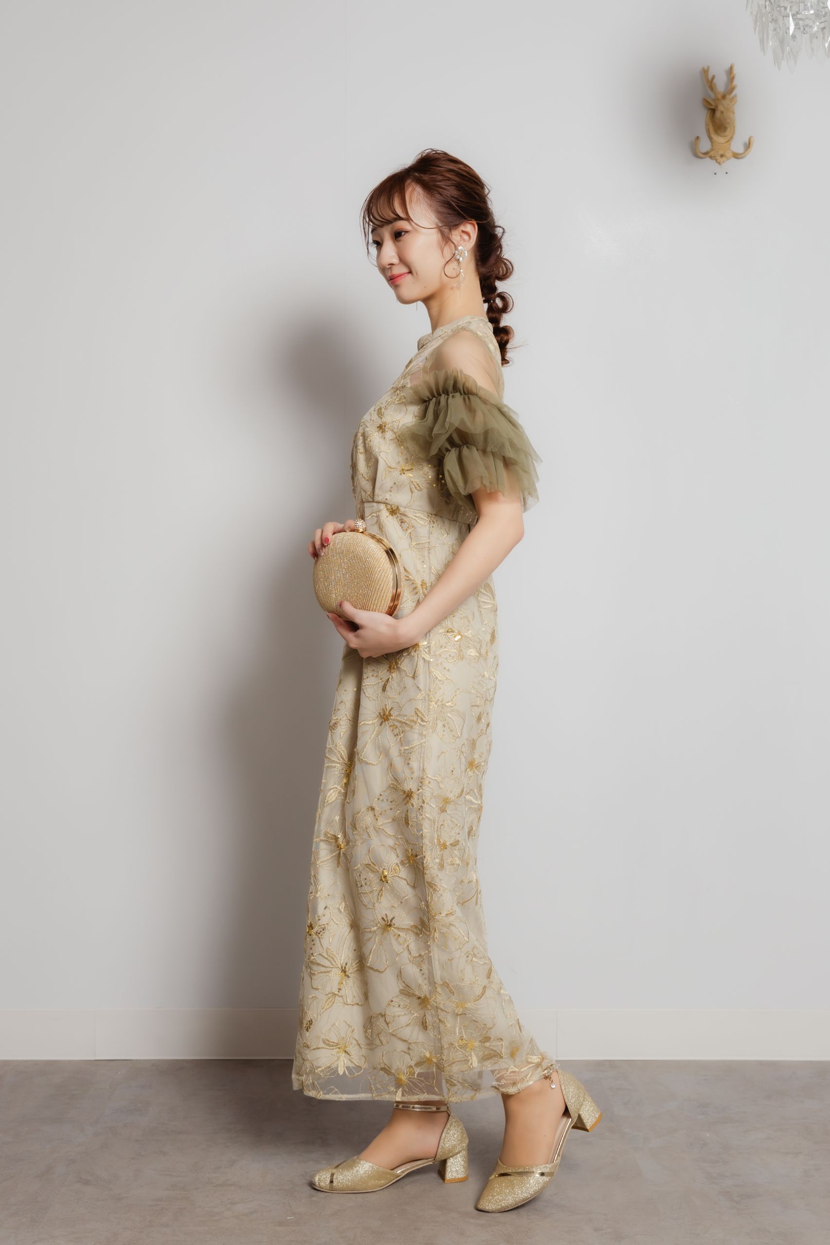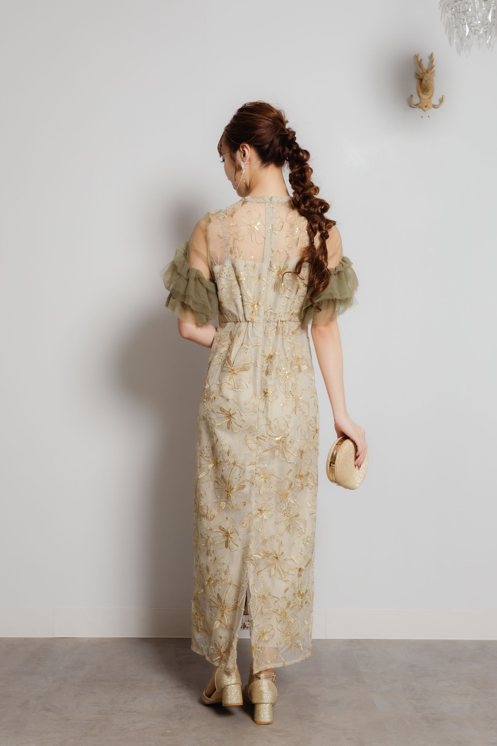 キーネック スパンコール刺繍ドレス ライトグリーンM