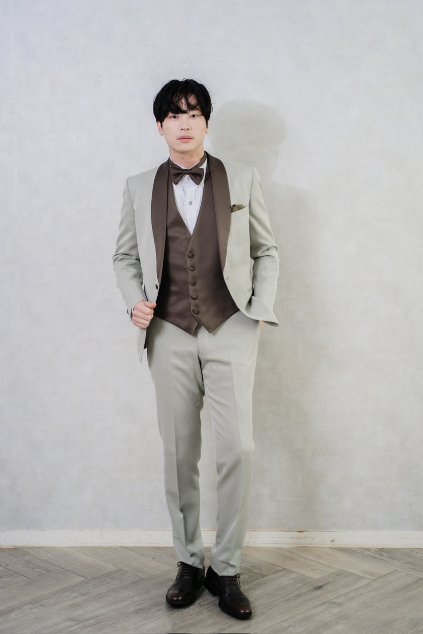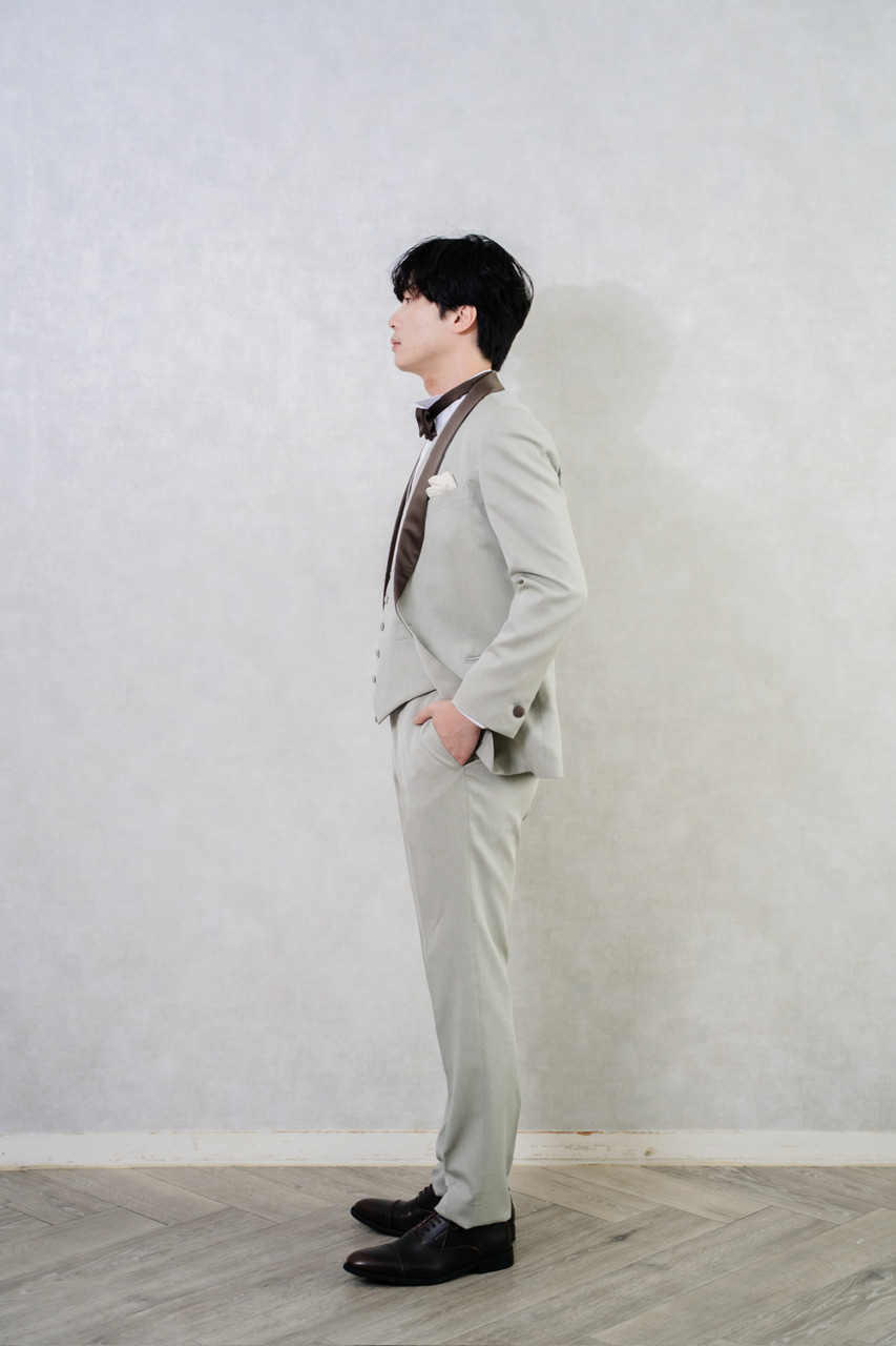 結婚式や前撮りにおすすめの新郎用メンズ3ピーススーツ。ライトグレーのジャケットとパンツに、ブラウンのショールカラーと蝶ネクタイを合わせた高級感のあるデザインです。またセットアップのベストはライトグレーとブラウンのリバーシブルで挙式、お色直しとイメージを簡単に変えられます。