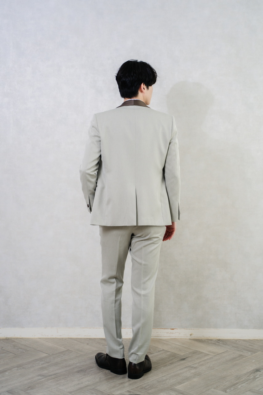 柔らかな色合いはウェディングフォトで映え、新郎の存在感をより一層引き立てます。披露宴や二次会にも対応できるフォーマルセットアップで、タキシード代わりとしてもおすすめ。洗練された雰囲気と華やかさを兼ね備え、特別な一日をおしゃれに演出する一着です。