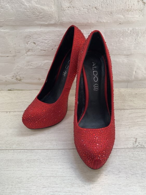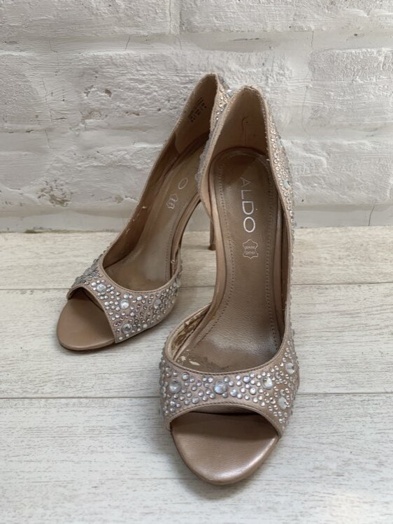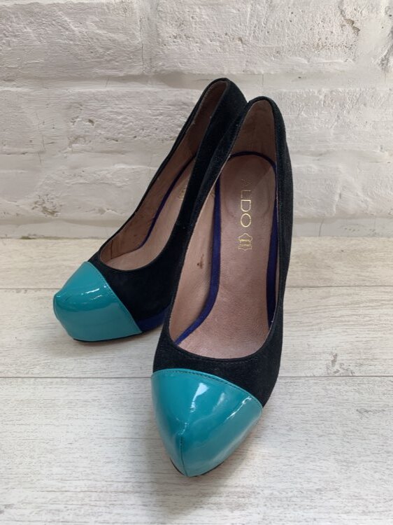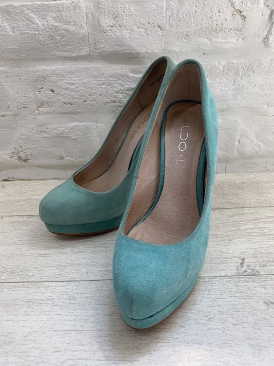 ブルーグリーンかかとスタッズポイントトゥパンプス