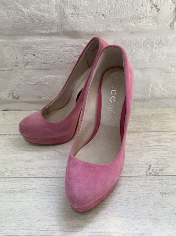 ピンク×ベージュフロントしぼりオープントゥパンプス