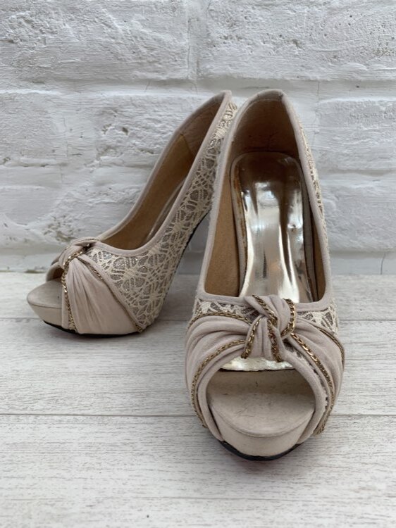 ピンク×ベージュフロントしぼりオープントゥパンプ...
