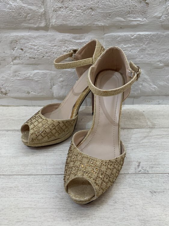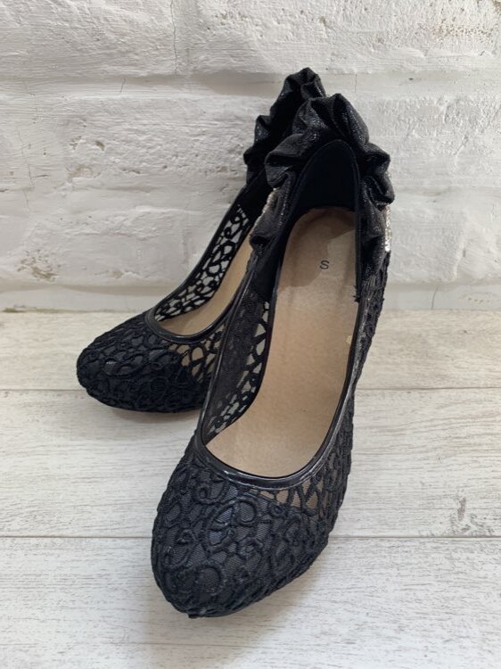 De Blossom Collection ブラック×ホワイトビジュー付きブラックラメヒールパンプス