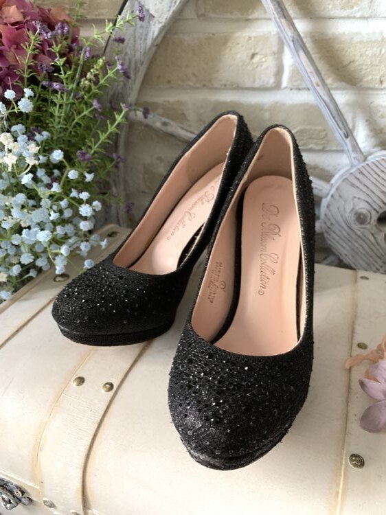 De Blossom Collection ビジュー付きブラックラメパンプス