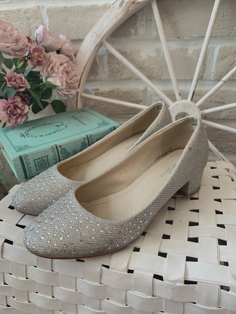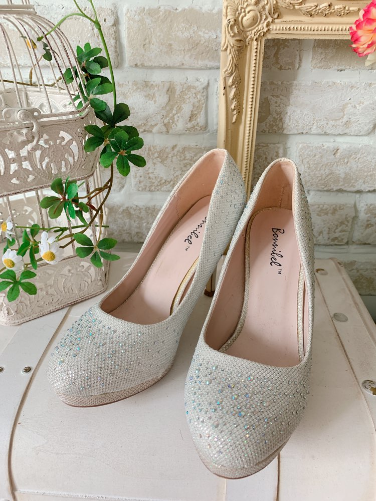 シルバーラメ×スワロフスキーローヒールパンプス ...