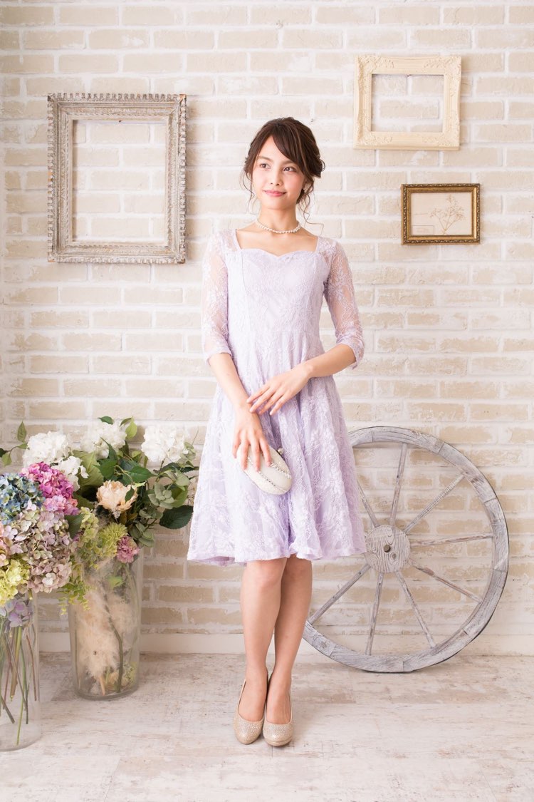 ラベンダー全レース柄ロングスリーブフレアドレス