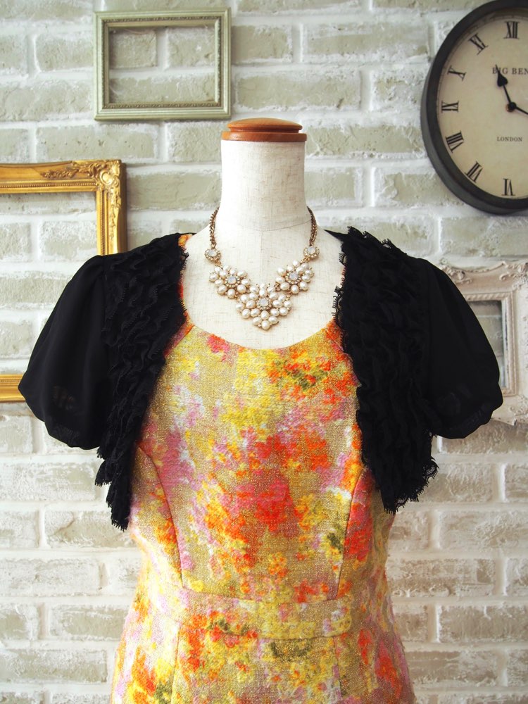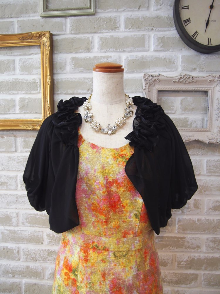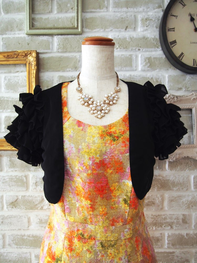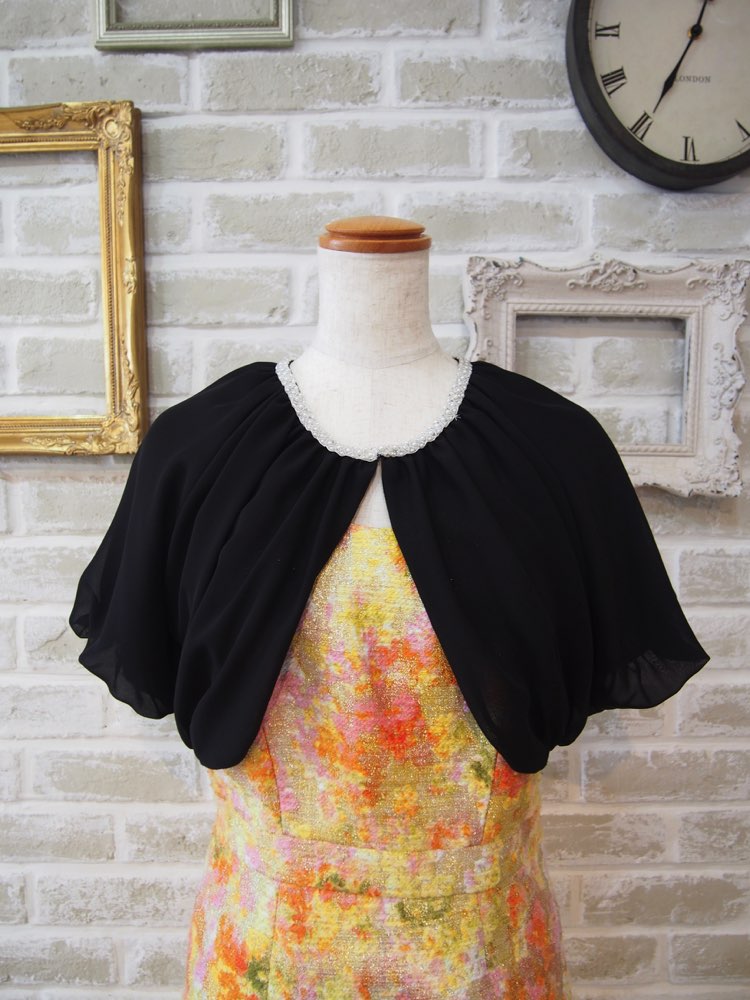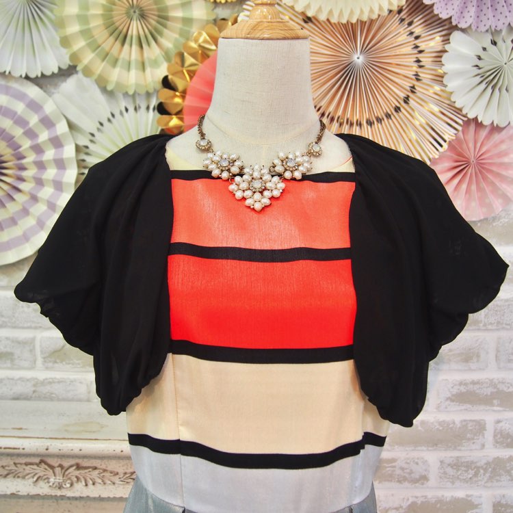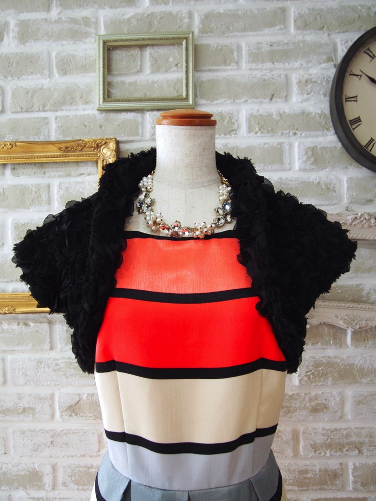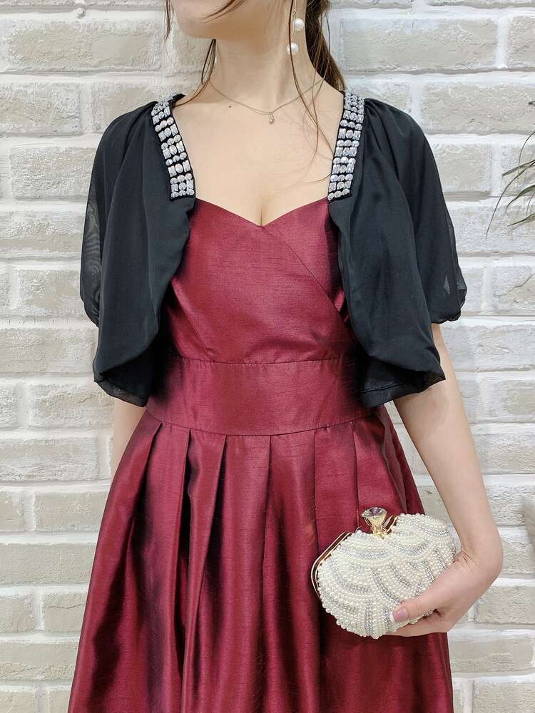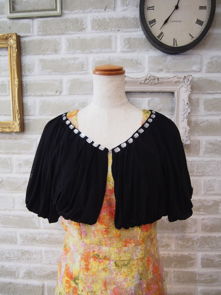 ブラックリボンバルーン袖ビジュー付五分袖ボレロ