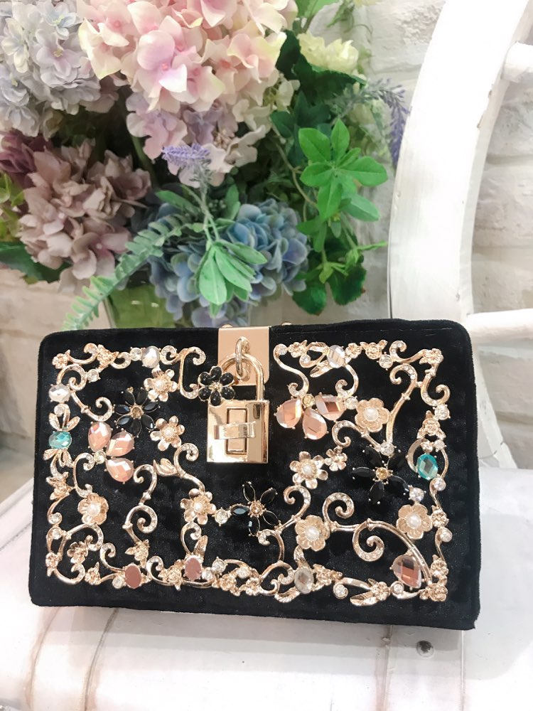 ブラックベロアゴールドペイズリーモチーフクラッチバッグ