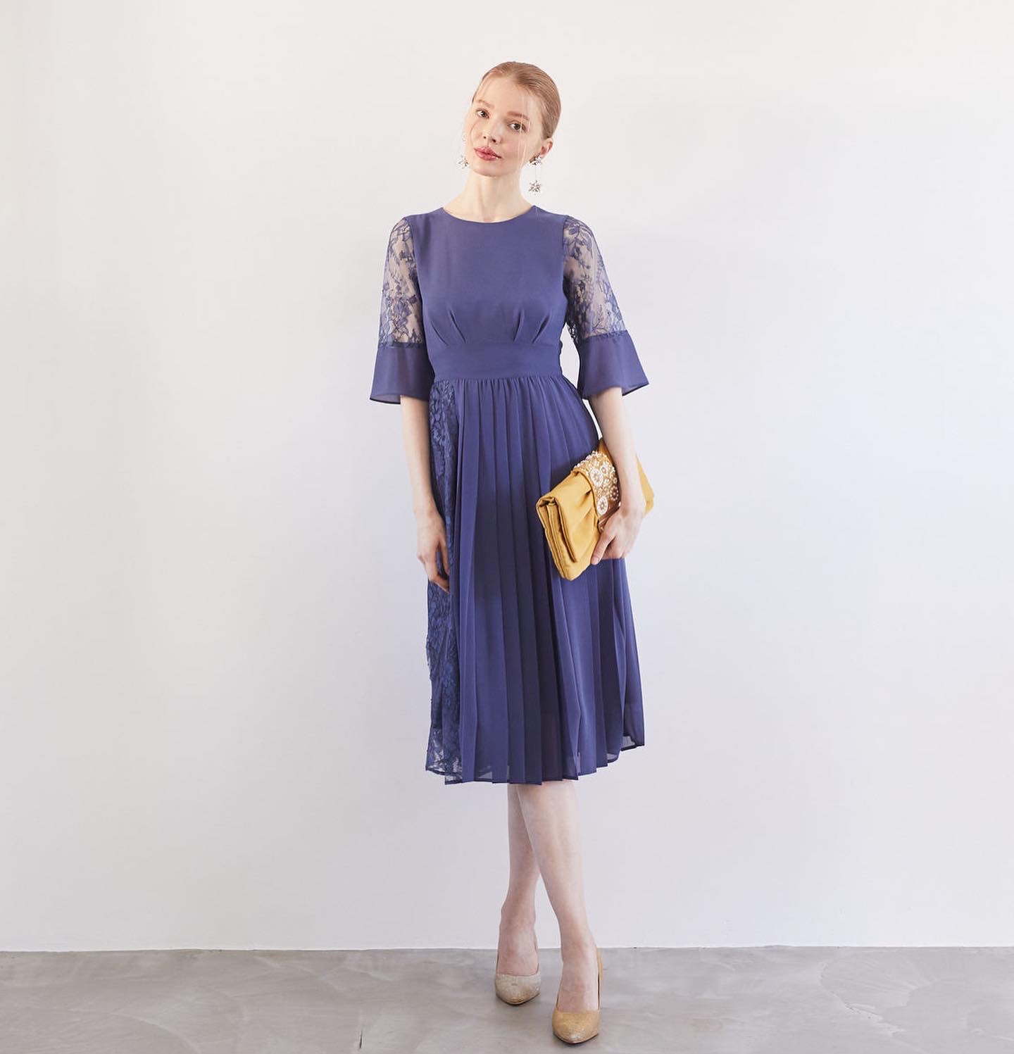 群青色七分丈プリーツ×レース切替ドレス